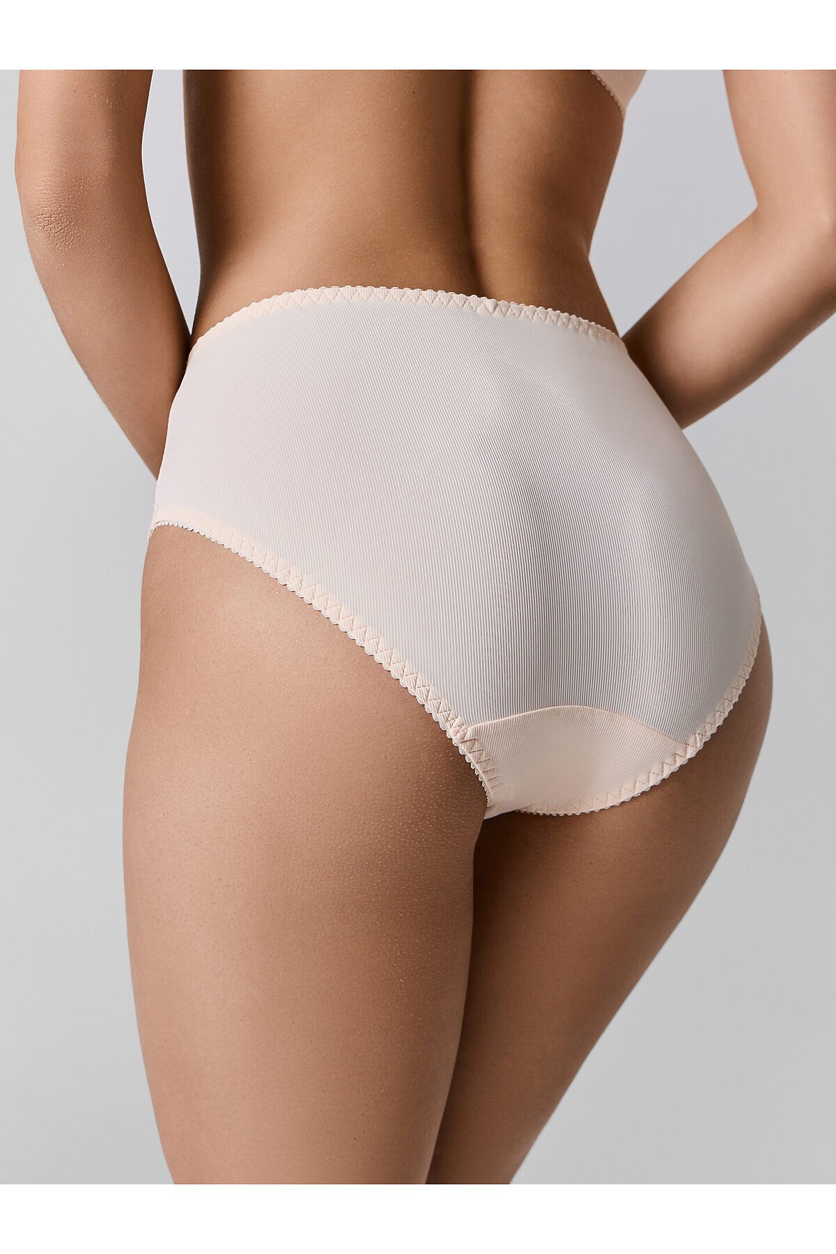 Трусы женские макси с высокой посадкой силуэта «слип» выполнены из микрофибры. По передней детали - вертикальные рельефы. Нижний край боковой детали обработан эластичным кружевом 3см (арт 3466, L94-3.5, Антик Дантель, 82% полиамид, 18% эластан). Передние детали на подкладке из эластичной сетки. Задняя деталь цельная. Верхний срез трусов обработан в 1 прием эластичной тесьмой 12 мм (жесткая с зубом WTE1-12, Arteks E2317). По ножкам - эластичная тесьма 10мм с зубом (жесткая с зубом WTE1-10, Arteks E2317) в 1 прием. Подкладка ластовицы из кулирного хлопкового полотна притачена к нижнему срезу подкладки из сетки. По центру изделия спереди - 2 пуговицы (9мм), По заданию 1 пуговица (10-11мм)