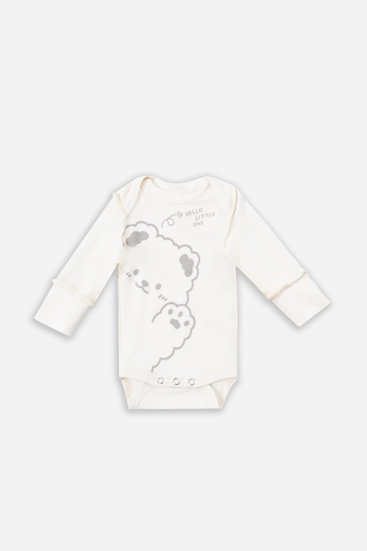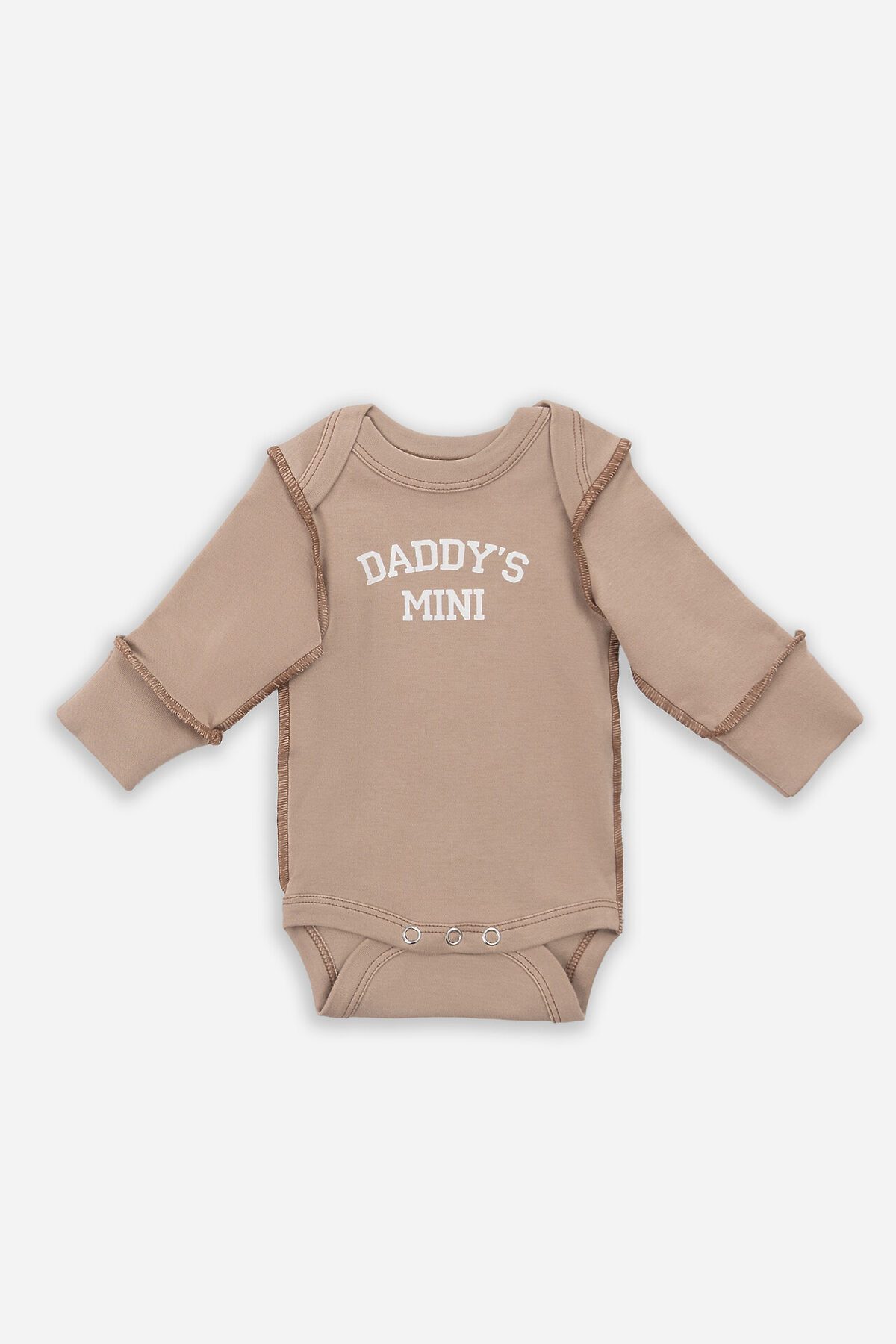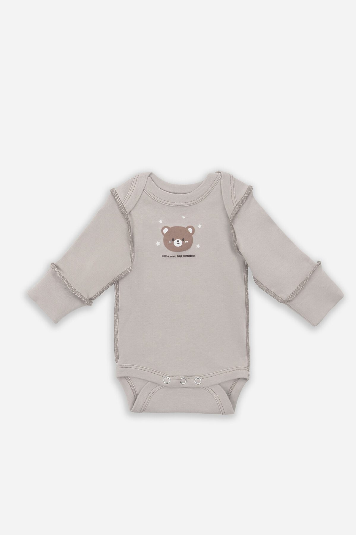 Круглая горловина с аккуратной окантовкой продумана для легкого одевания, а деликатные внешние швы добавляют современный дизайнерский штрих, оставаясь при этом мягкими и безопасными. Длинные рукава оснащены защитными царапками - практичное решение для малышей. Удобная застежка на кнопках по всей длине значительно упрощает процесс переодевания.