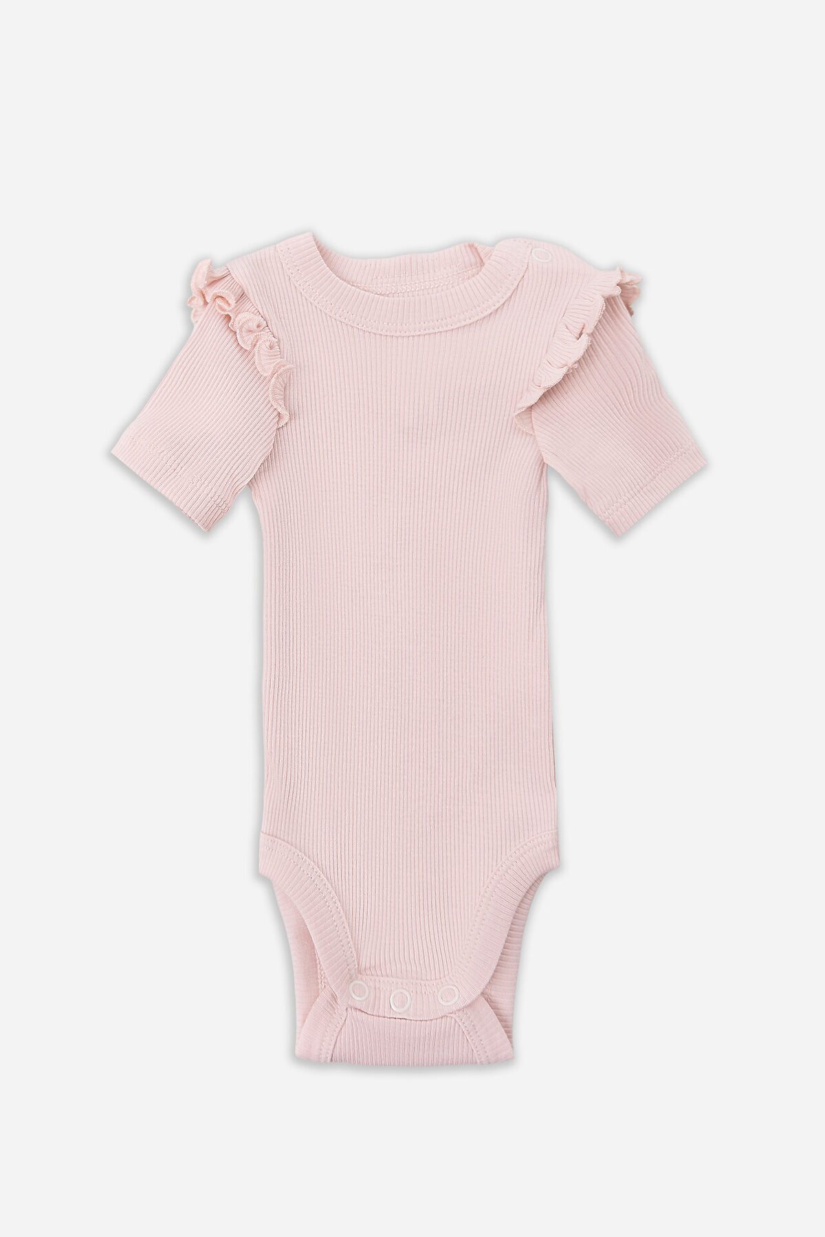 Боди детское выполнено из трикотажного полотна рибана 2*2: 100% хлопок, 115 см, 180 гр/м?. Спинка и перед цельнокроенные. Горловина круглая, окантована бейкой из основного полотна. На левом плече застежка книппер - 1 шт 9мм. Рукава короткие, втачные, одношовные. Низ рукавов обработан на 2х игольной плоскошовной машине швом в подгибку. В пройму вставлена рюша из основного полотна, край рюши обработан на микрооверлоке. Нижние срезы переда и спинки окантованы бейкой в три сложения. Застежка на три книпера 9мм.