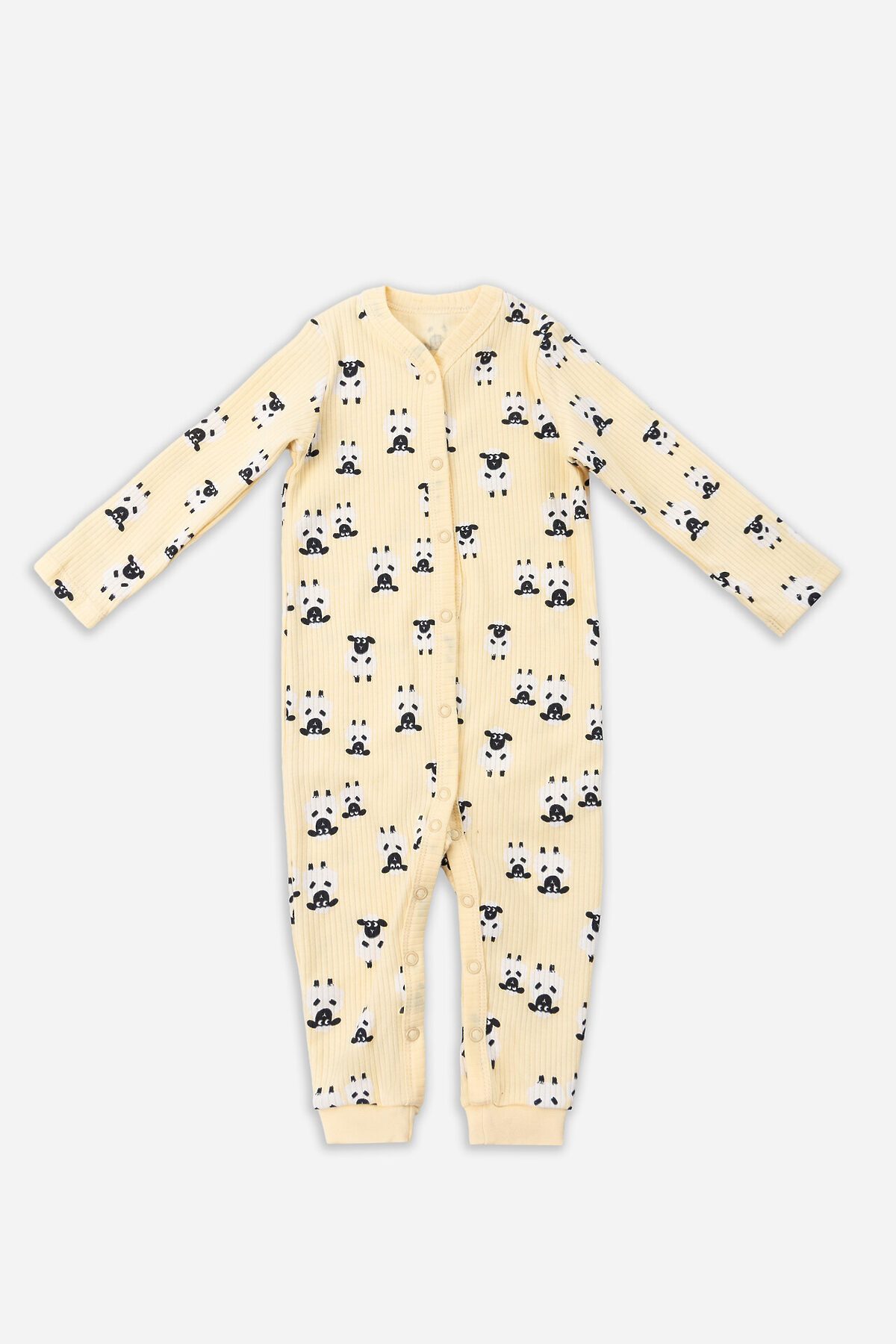 Модель имеет спинку без швов, что делает её поверхность гладкой и удобной. Передняя часть застёгивается по всей длине и на обеих ножках на кнопки, что делает переодевание быстрым и простым. Длинные рукава и низ штанин аккуратно обработаны, а края горловины и застёжки отделаны дополнительными деталями из основной ткани для мягкости и прочности. Эластичные манжеты на ножках помогают комбинезону сохранять форму.