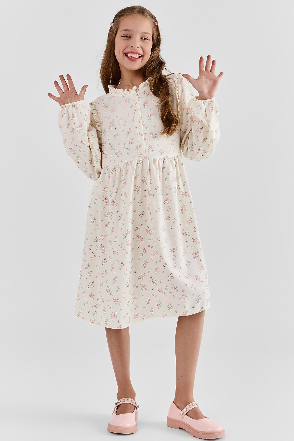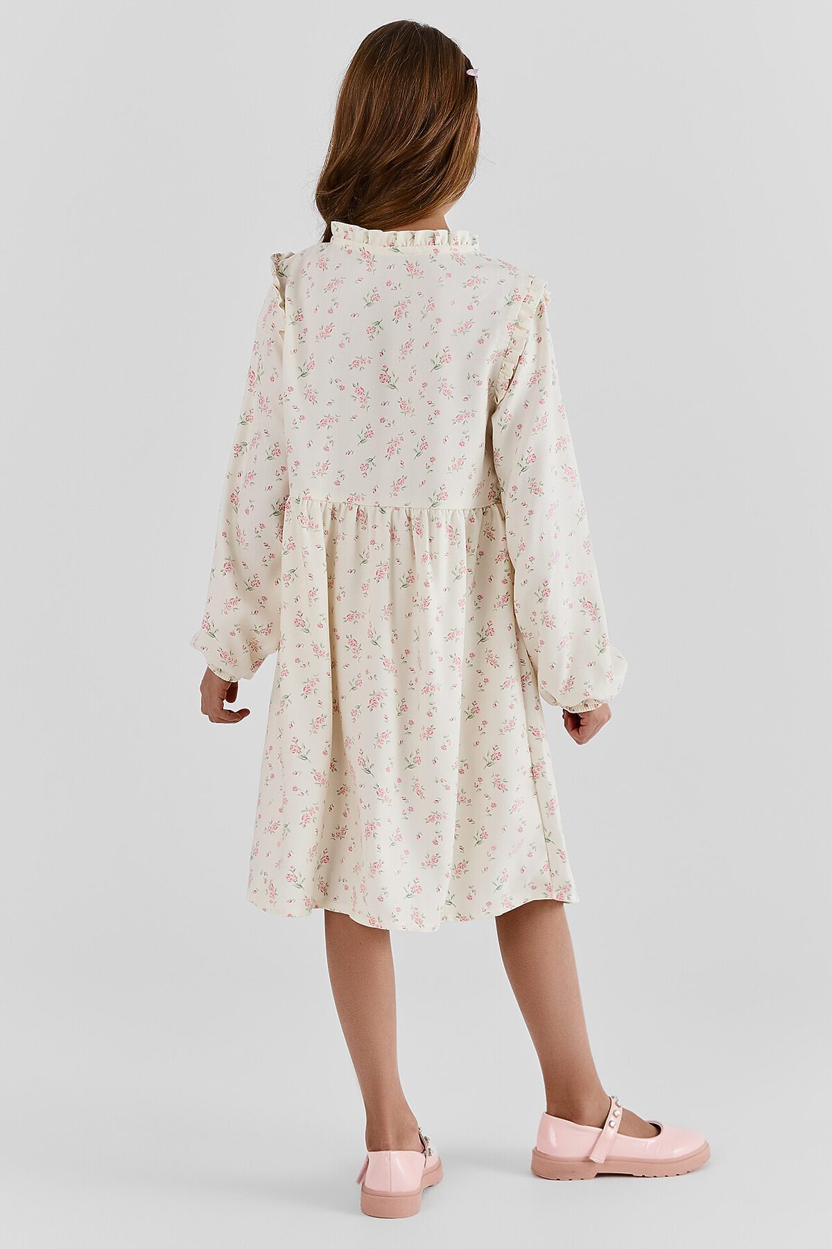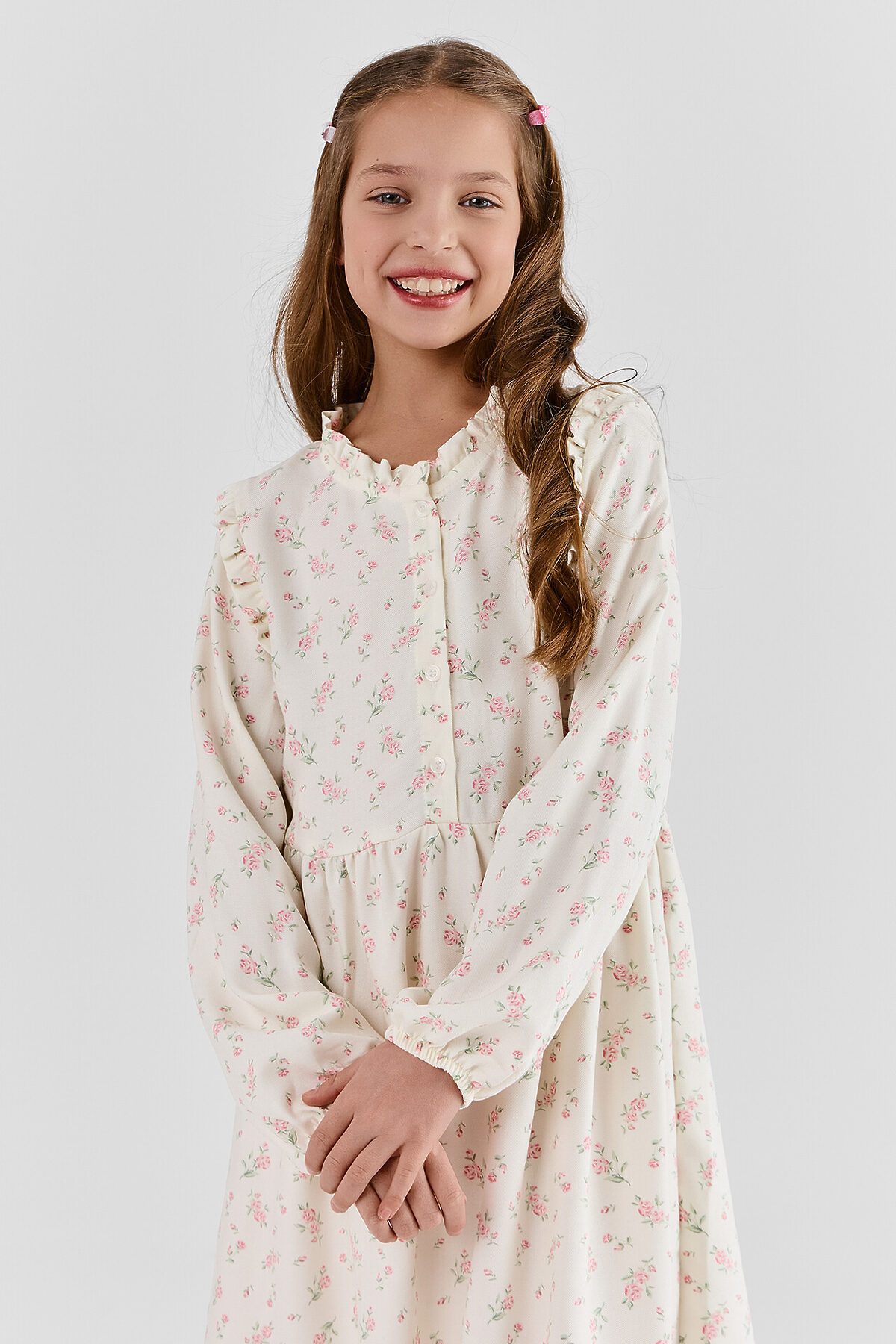 Платье прямого с отрезной юбкой по талии . По переду застежка - планка на 4 пуговицы. Горловина круглая обработана бейкой в чистый край, с рюшей. Рукав длинный втачной, с «крылышками» по пройме . По низу рукавов внутрь застрочена эластичная тесьма 10RV. Низ в подгибку.