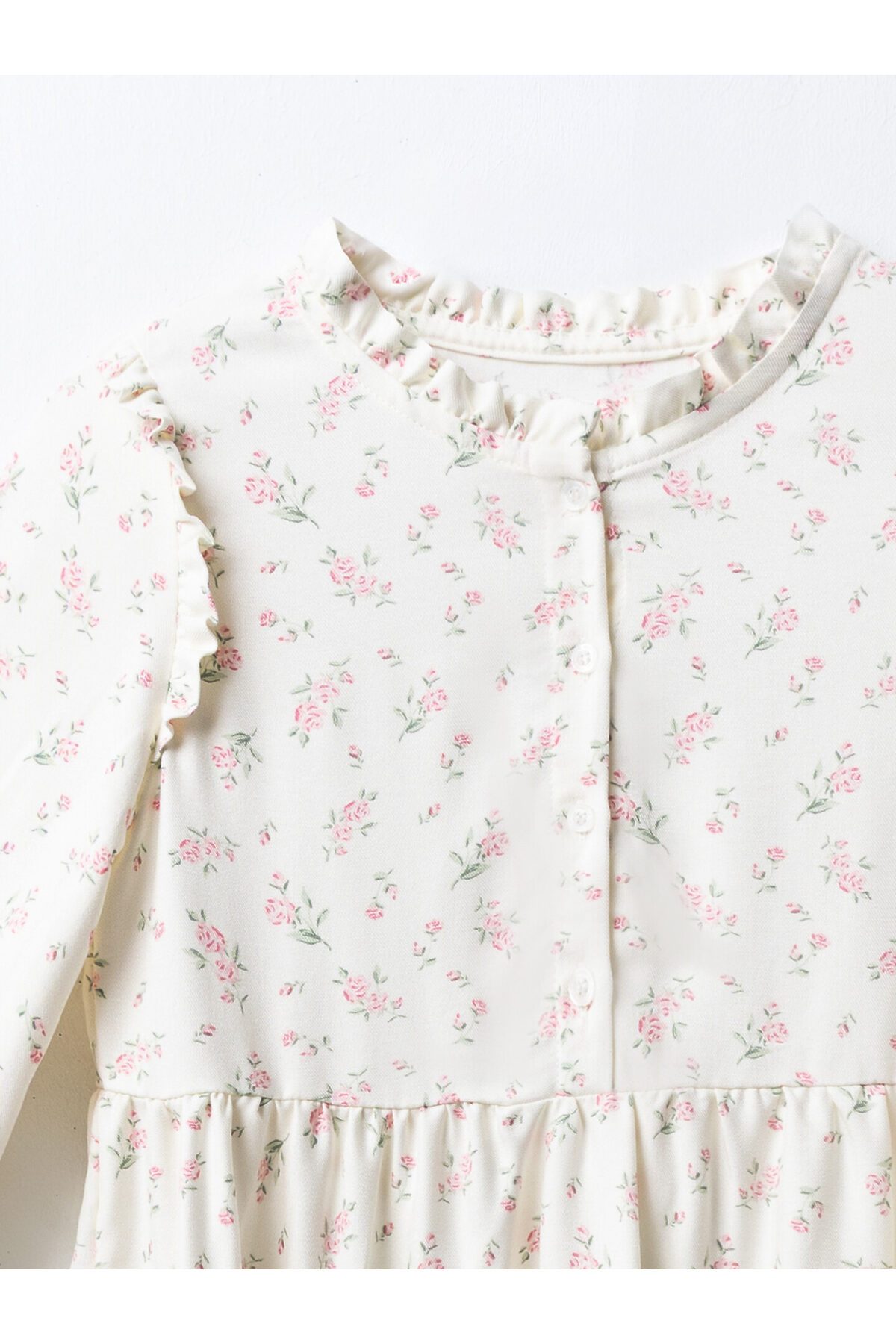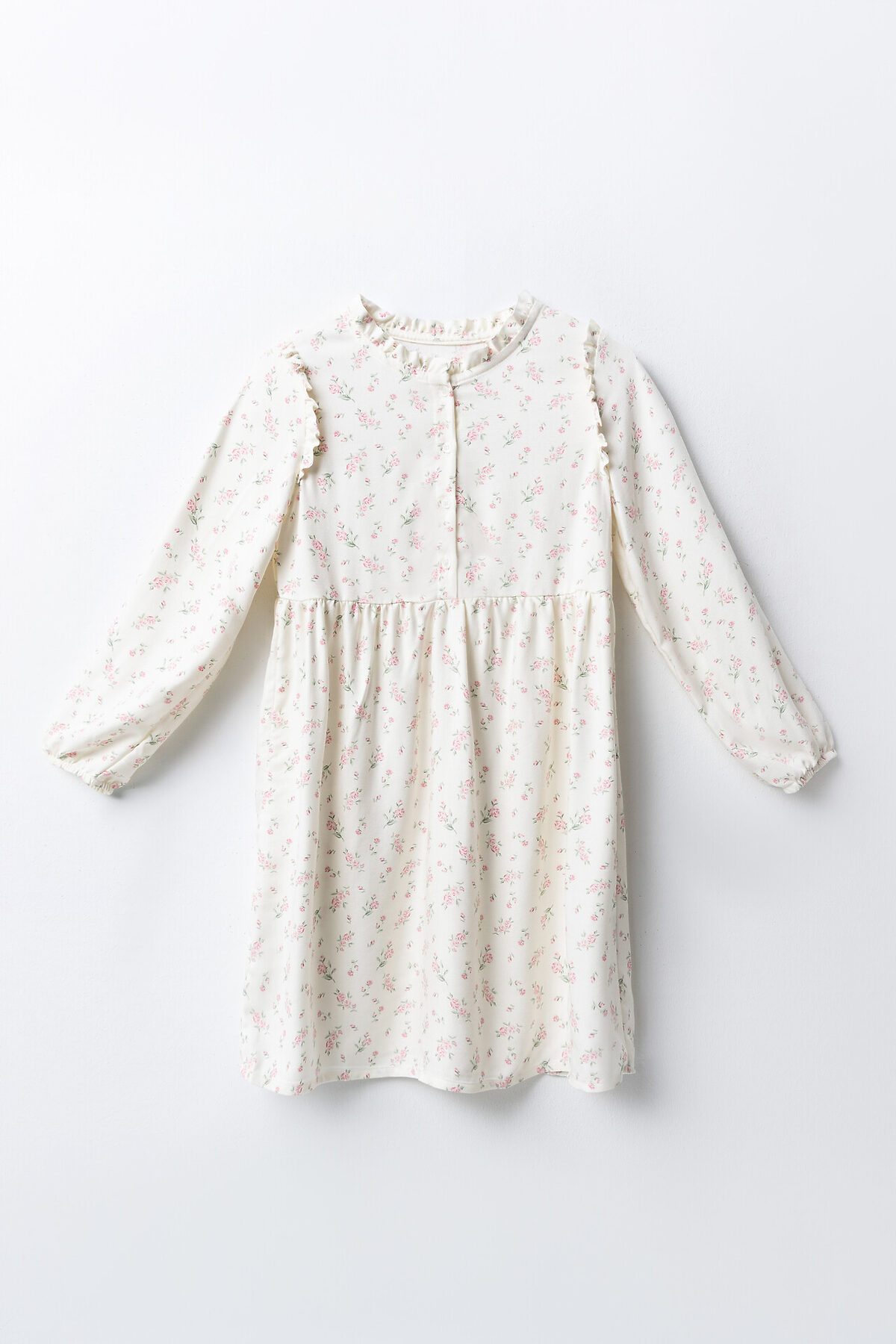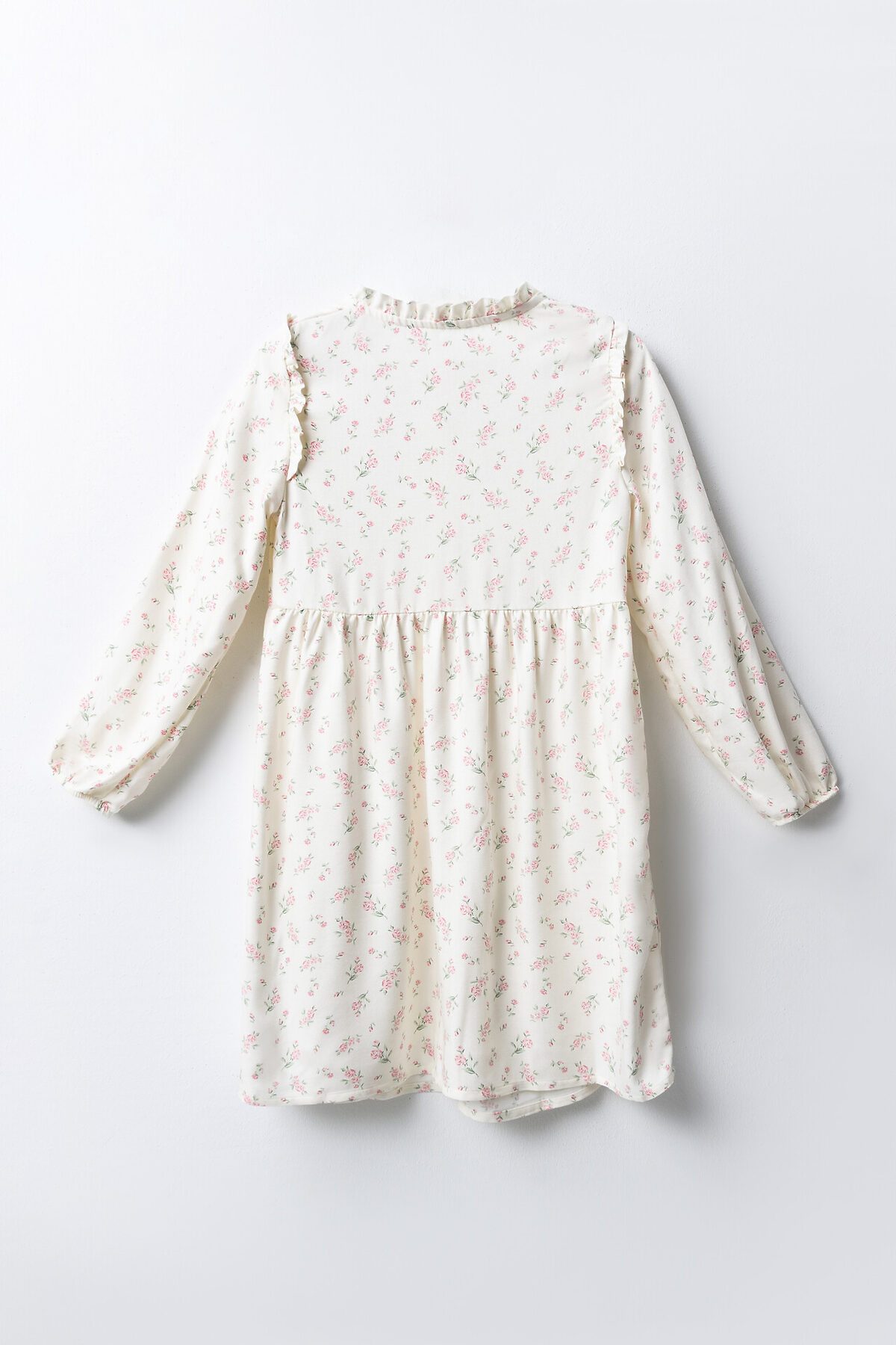 Платье прямого с отрезной юбкой по талии . По переду застежка - планка на 4 пуговицы. Горловина круглая обработана бейкой в чистый край, с рюшей. Рукав длинный втачной, с «крылышками» по пройме . По низу рукавов внутрь застрочена эластичная тесьма 10RV. Низ в подгибку.