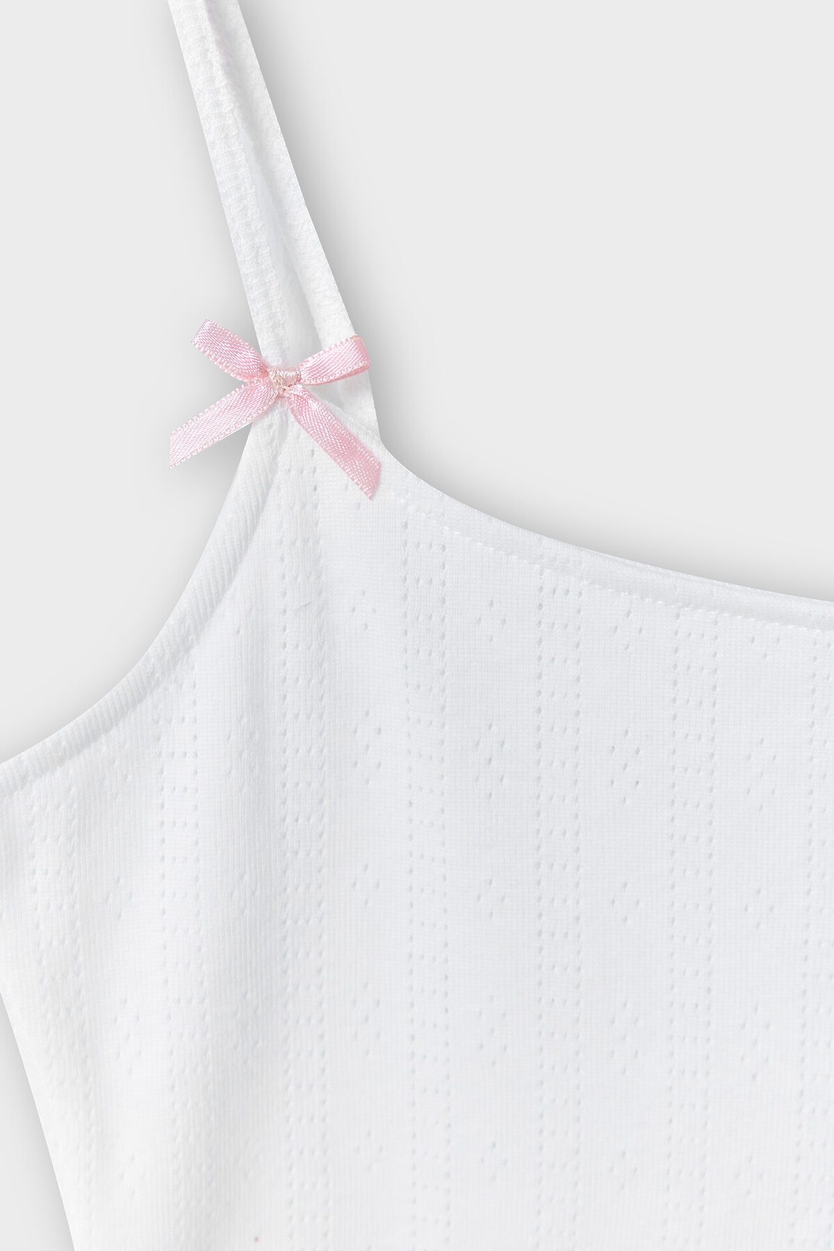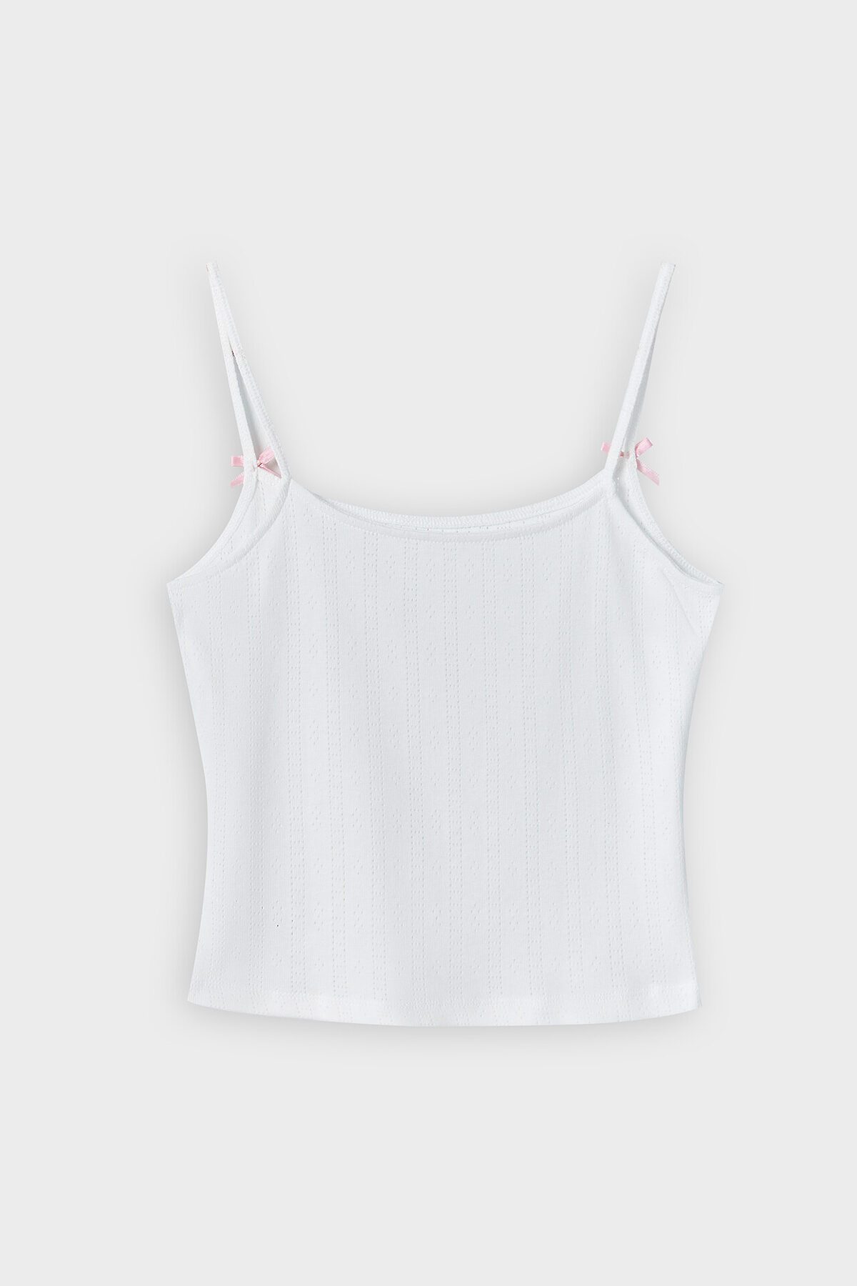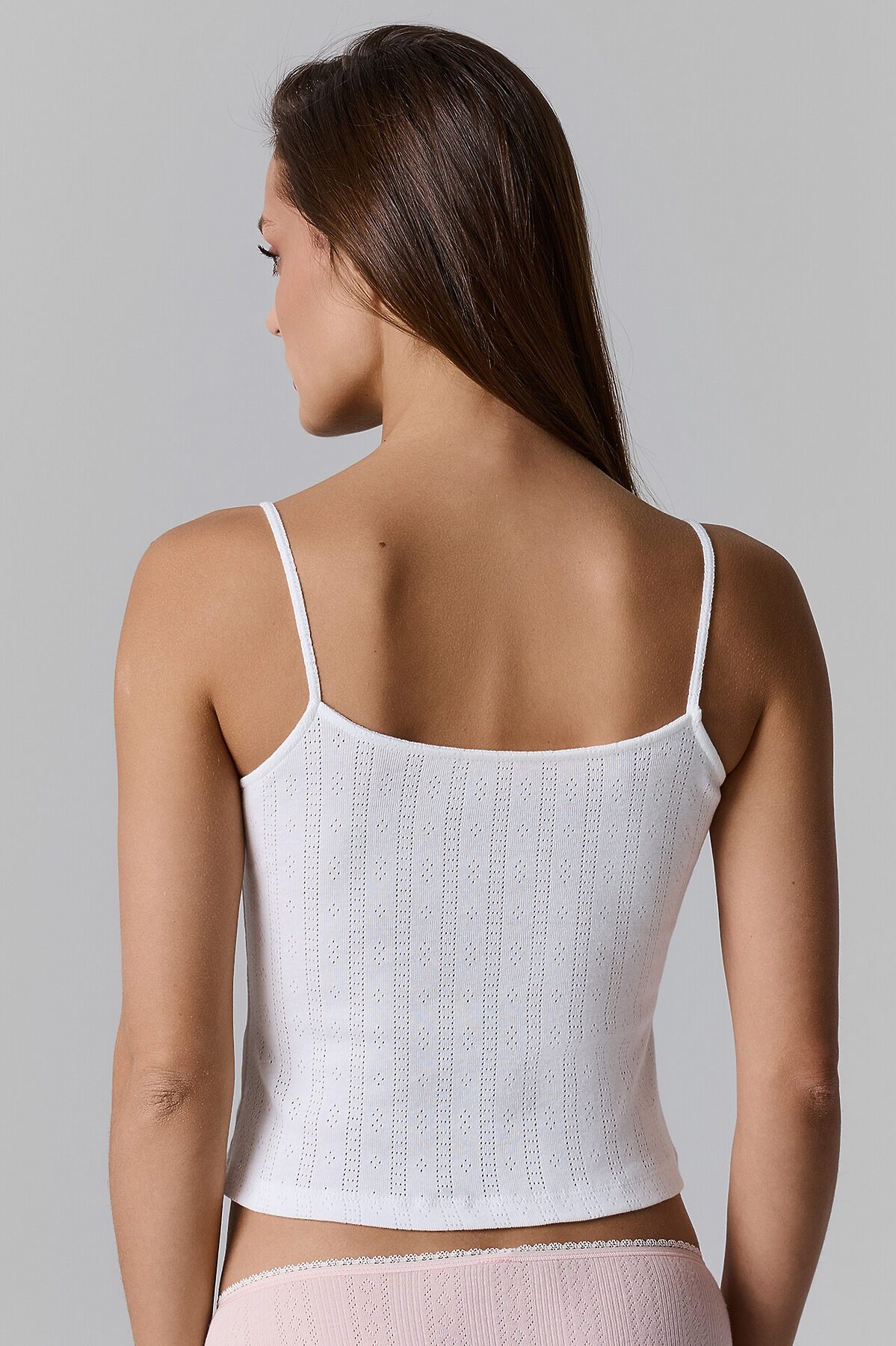 Топ прилегающего силуэта. Верхний край изделия обработан бейкой, переходящей в бретели. Низ изделия обработан в подгибку.