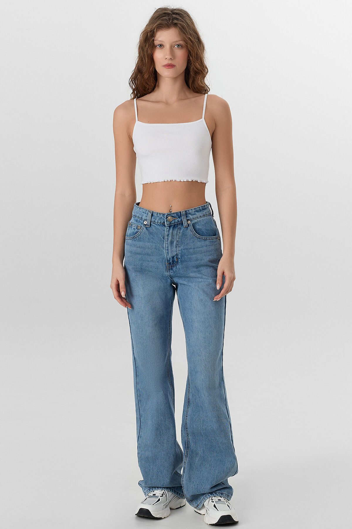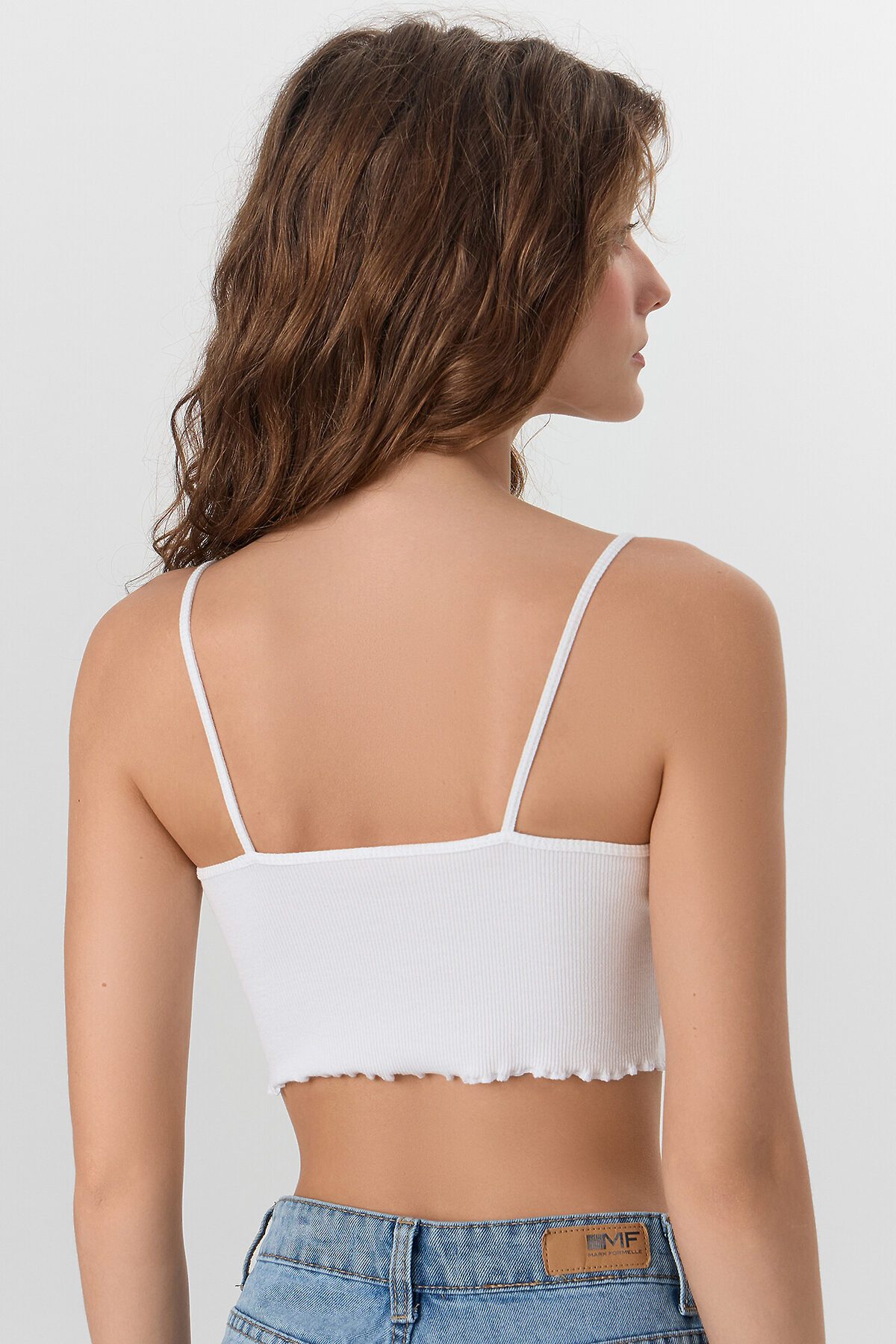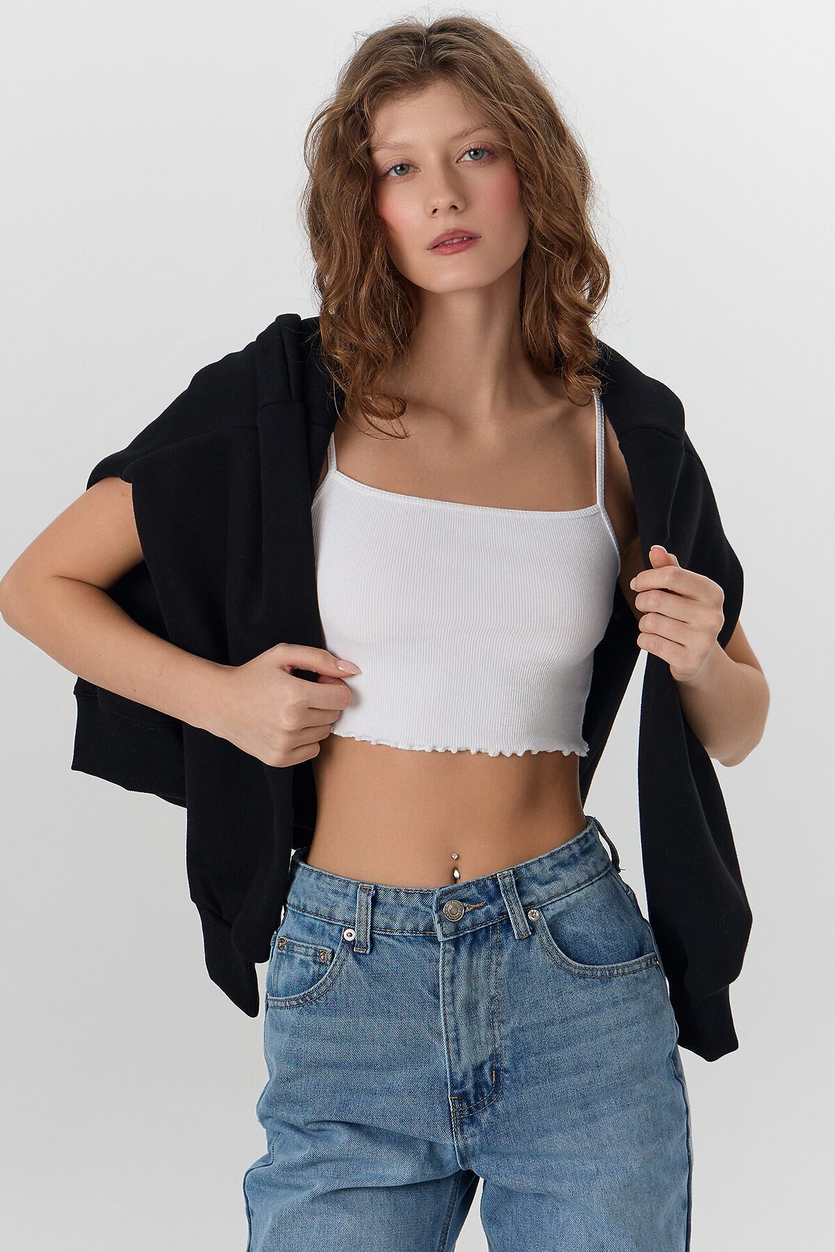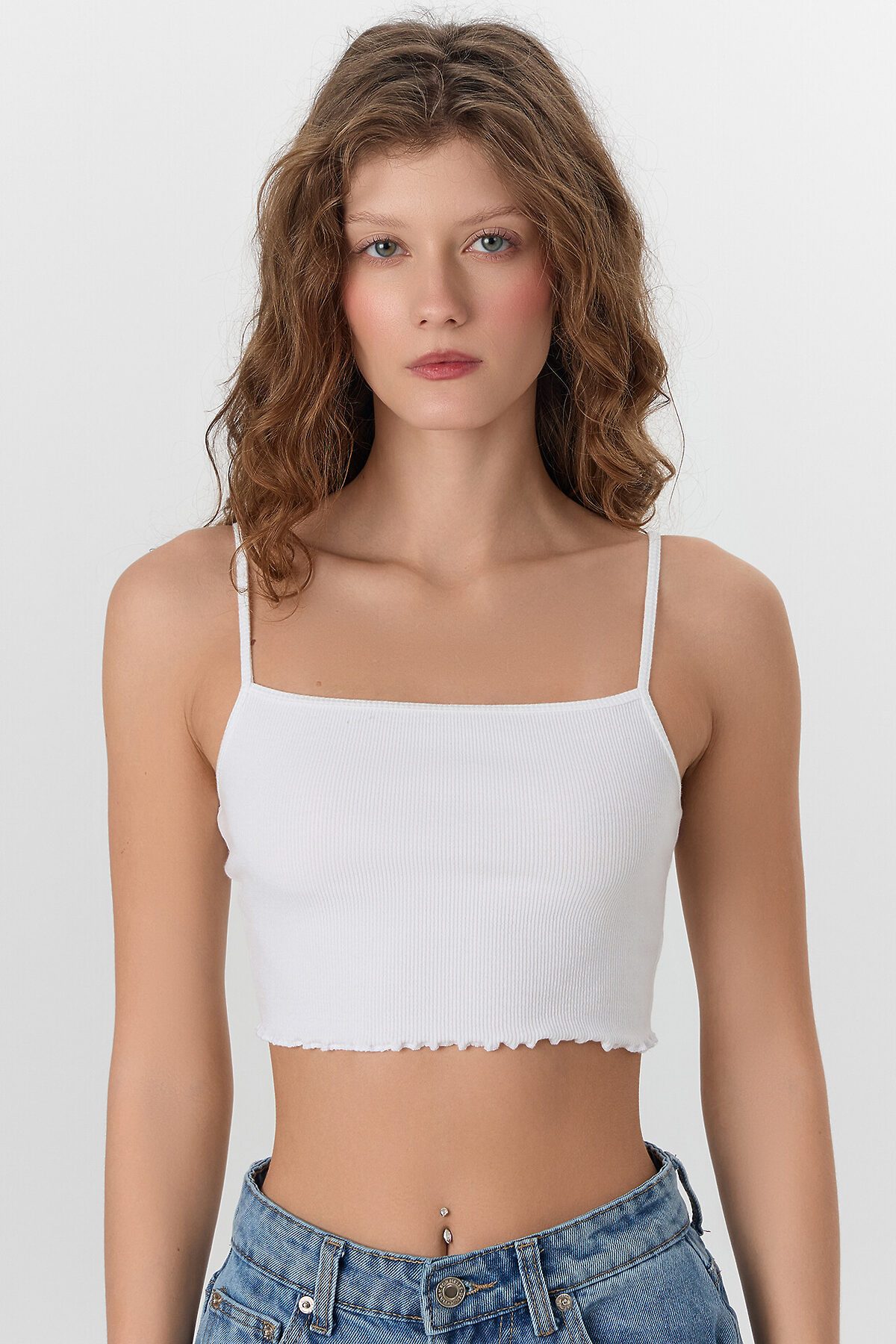 Стильный топ на тонких бретелях. Выполнен из хлопковой трикотажной рибаны в рубчик. Особенность модели – закрученный нижний срез. Идеальное решение для теплого времени года!
