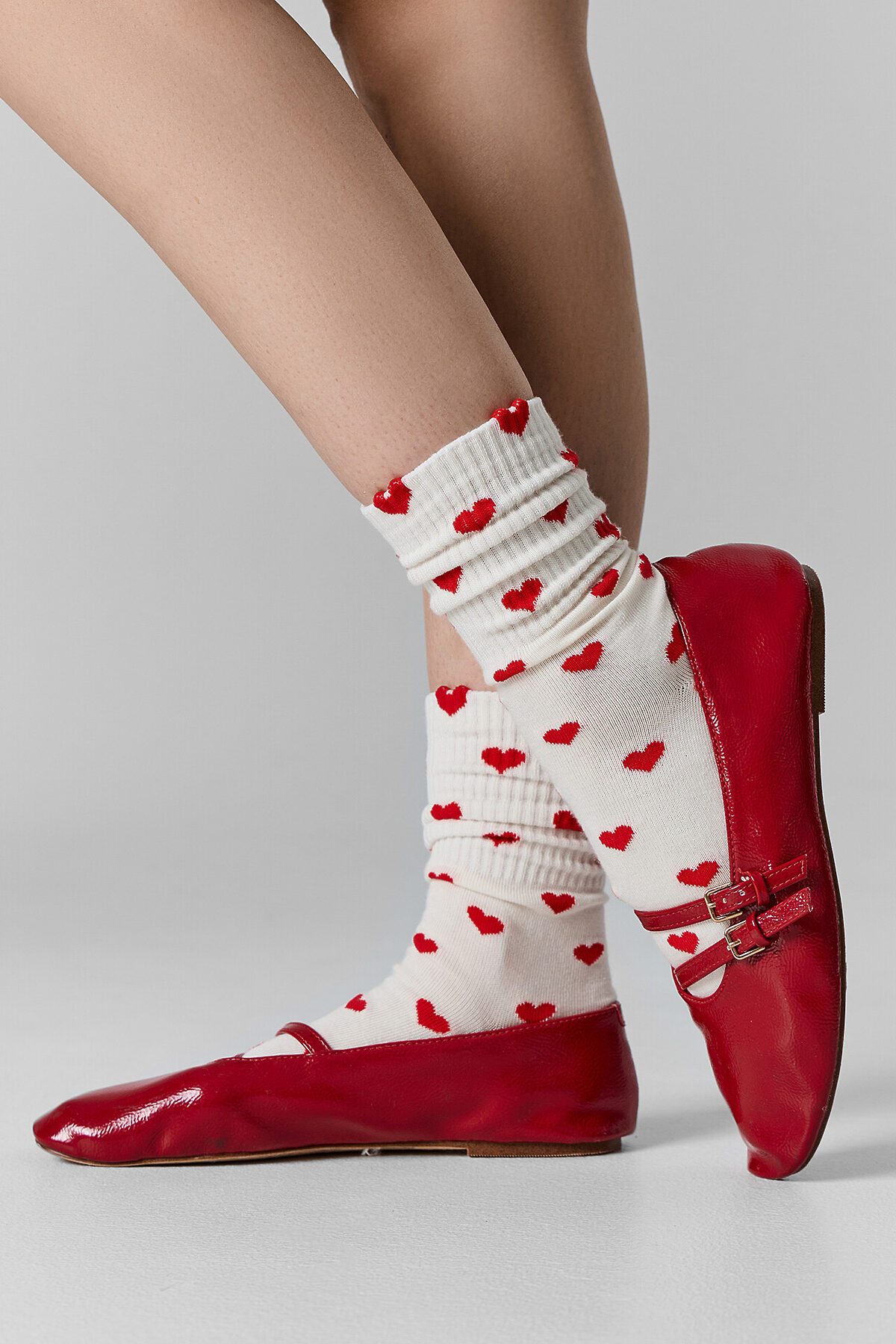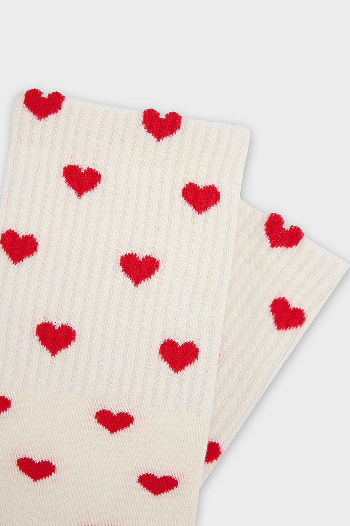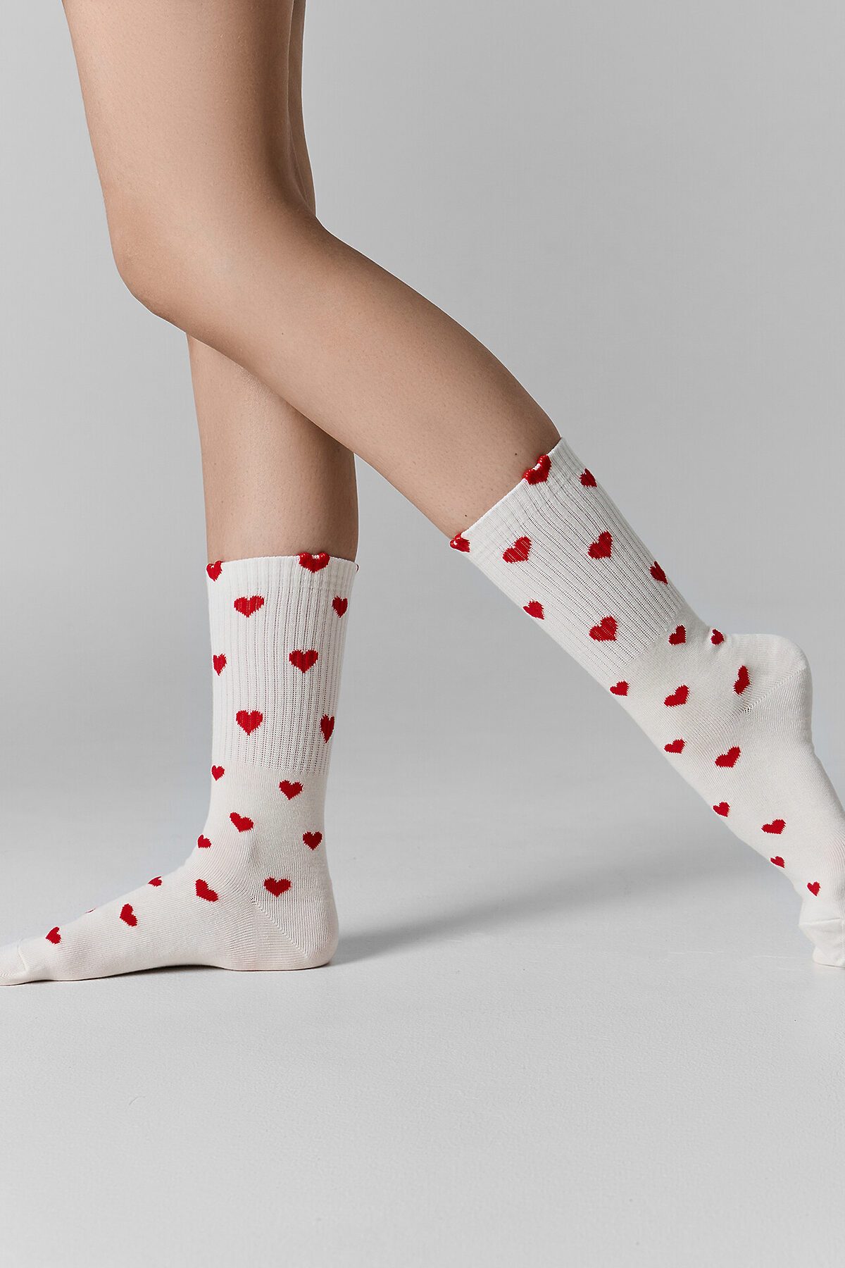 Женские носки с сердечками — это нежный аксессуар, который превратит обычный день в романтический момент. Носки украшены очаровательным принтом в виде сердечек, нанесенным по всей поверхности, что добавляет образу игривости и трогательности. Высокий плотный борт мягко облегает щиколотку, не сползая и не оставляя следов.