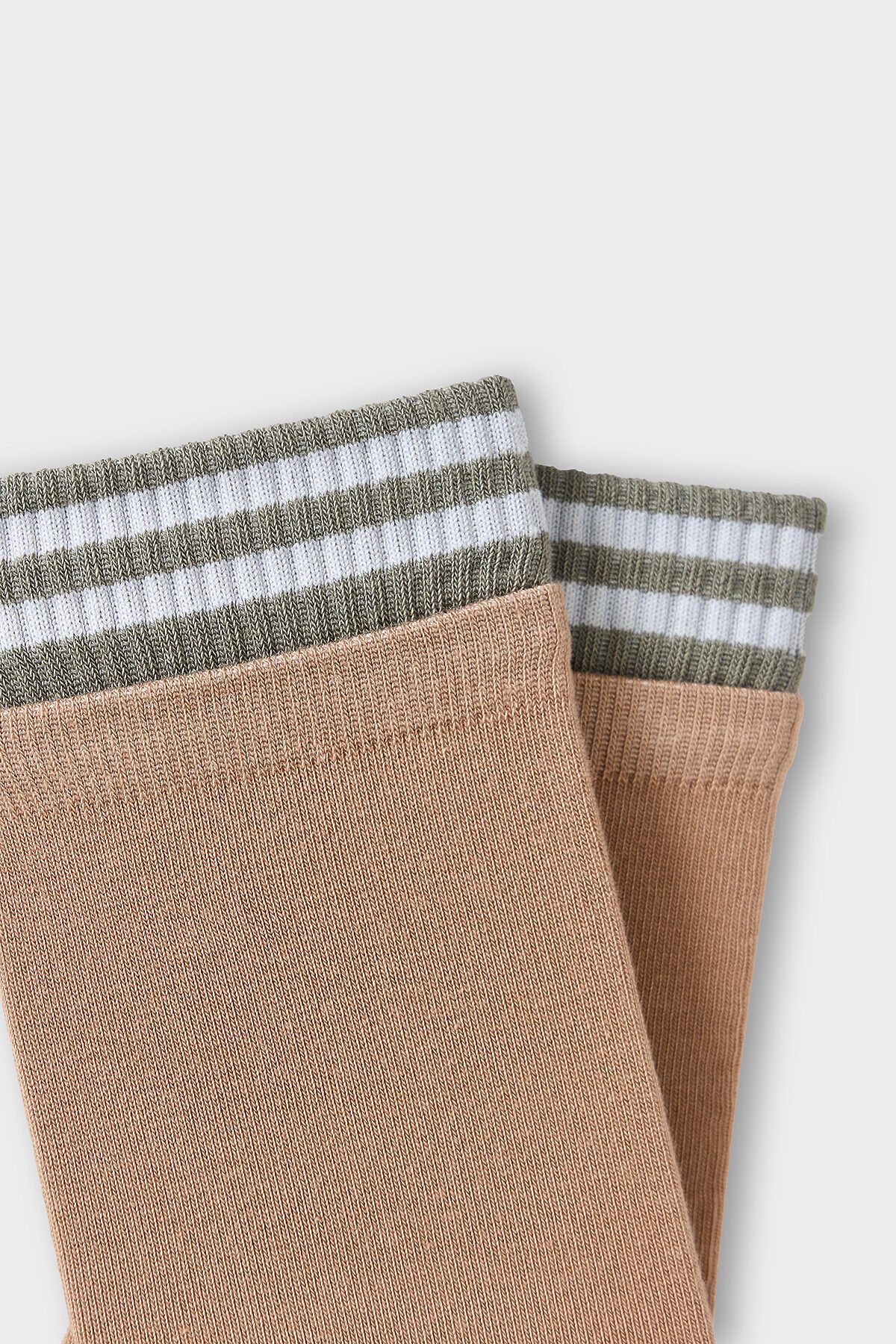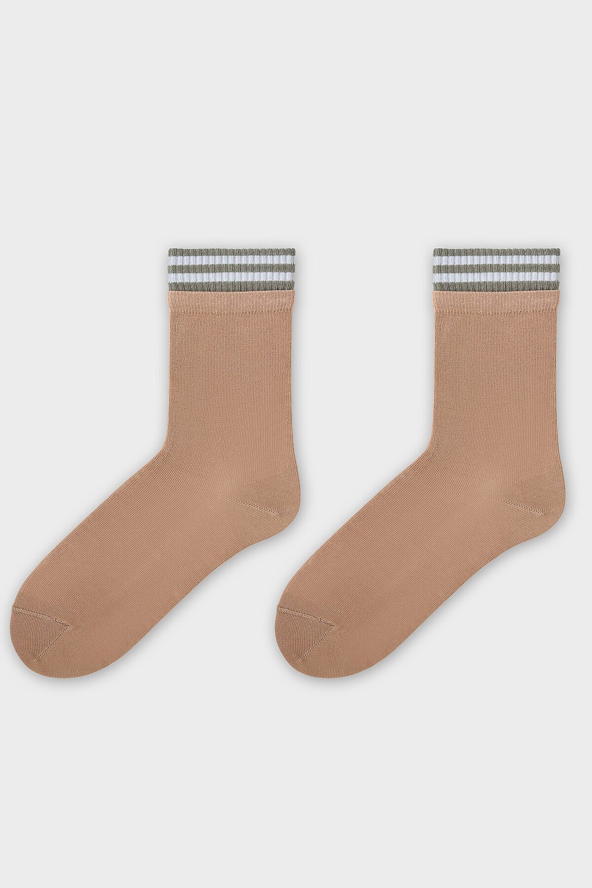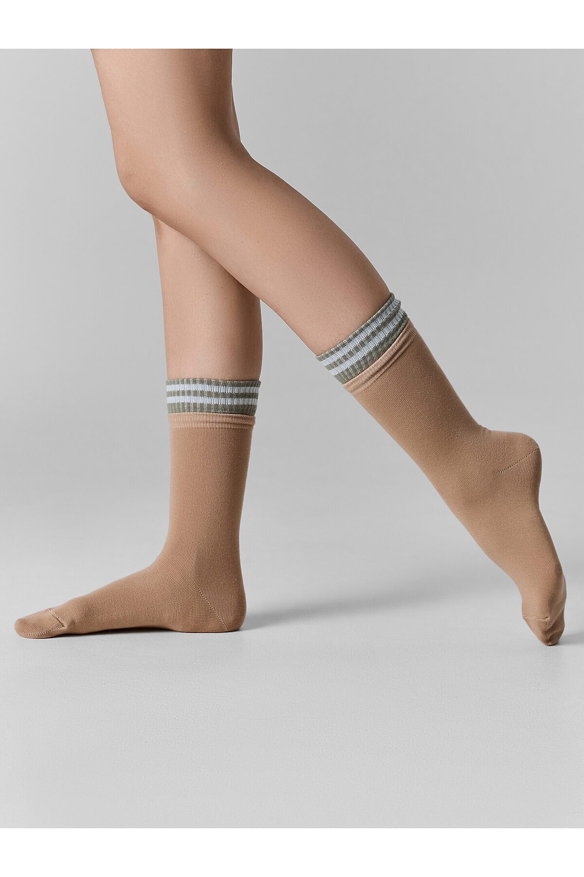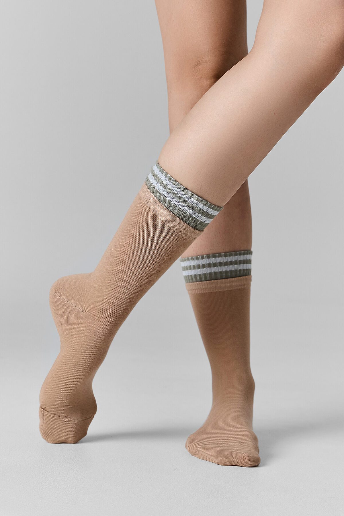 Женские носки высокие с многослойным бортом — это стильный аксессуар, который сочетает в себе лаконичный дизайн и повседневный комфорт. Модель украшена рисунком в виде полосок и многослойным бортом, что добавляет образу динамичности и современности.