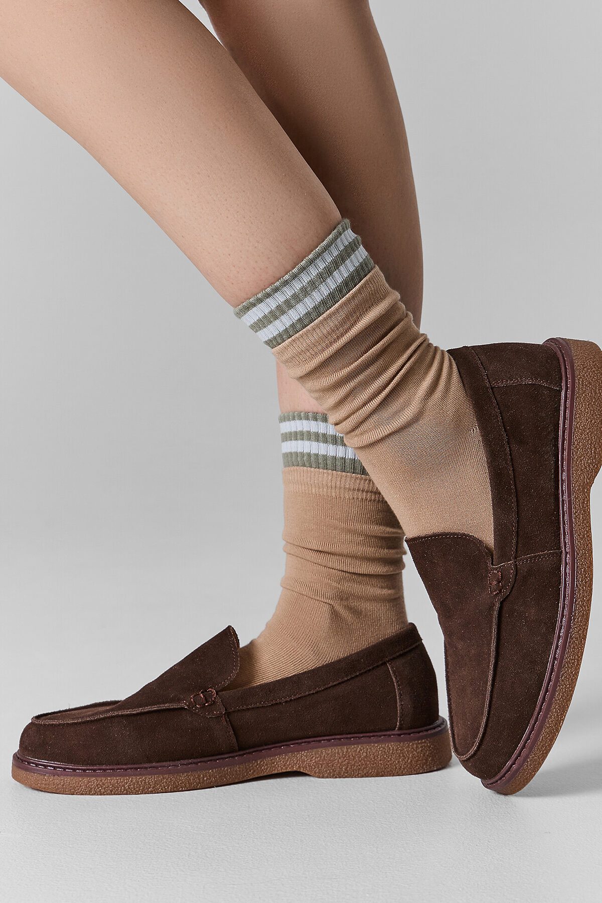 Высокие носки с полосками легко сочетаются с обувью на плоской подошве, кроссовками или ботинками. Они подходят для прогулок, занятий спортом или повседневной носки, даря ногам комфорт в течение всего дня.
