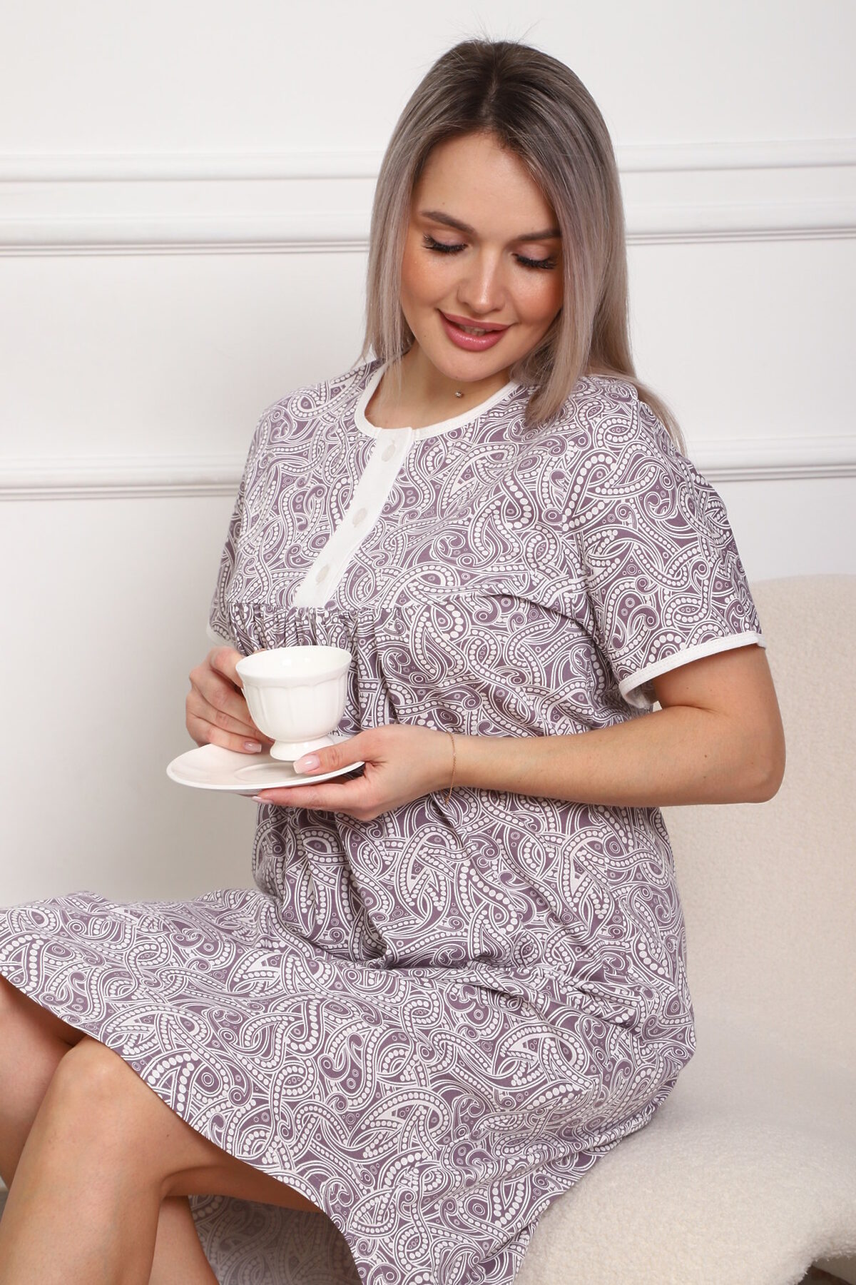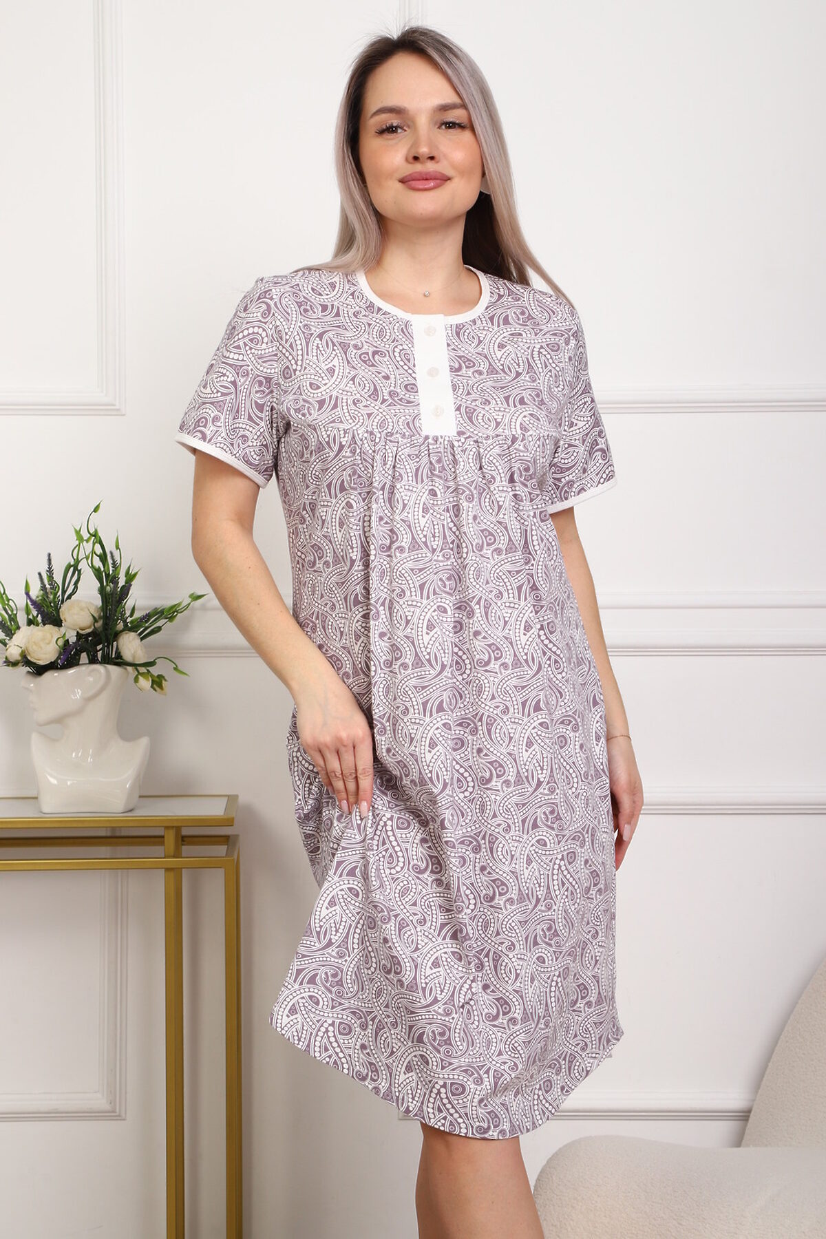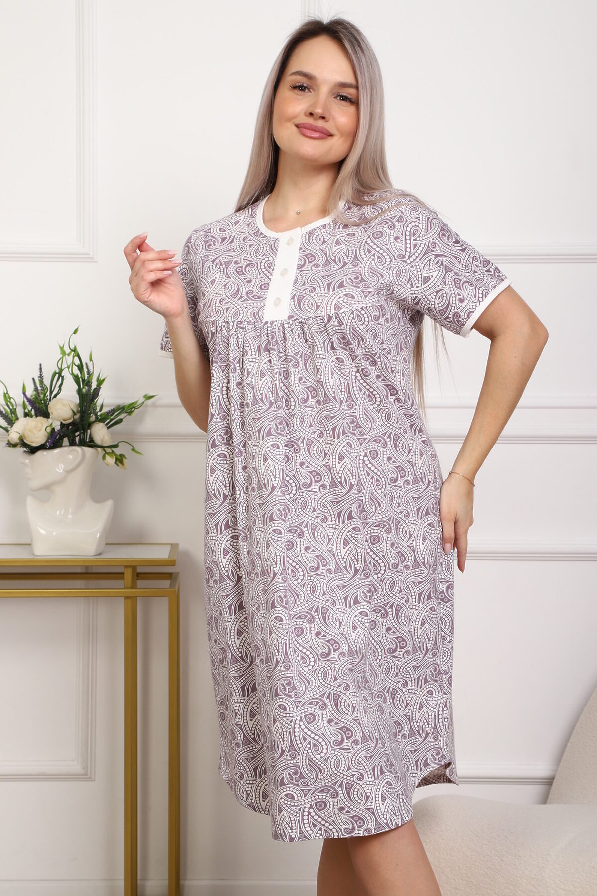 Приятная к телу сорочка из кулирного хлопкового полотна . Удобный короткий рукав, кокетка с планкой на пуговицах. Фасон достаточно свободный за счет хорошей сборки на полочке. Низ изделия фигурный, подшит на плоскошовной машине. Горловина и рукава обработаны окантовкой. из кулирки,