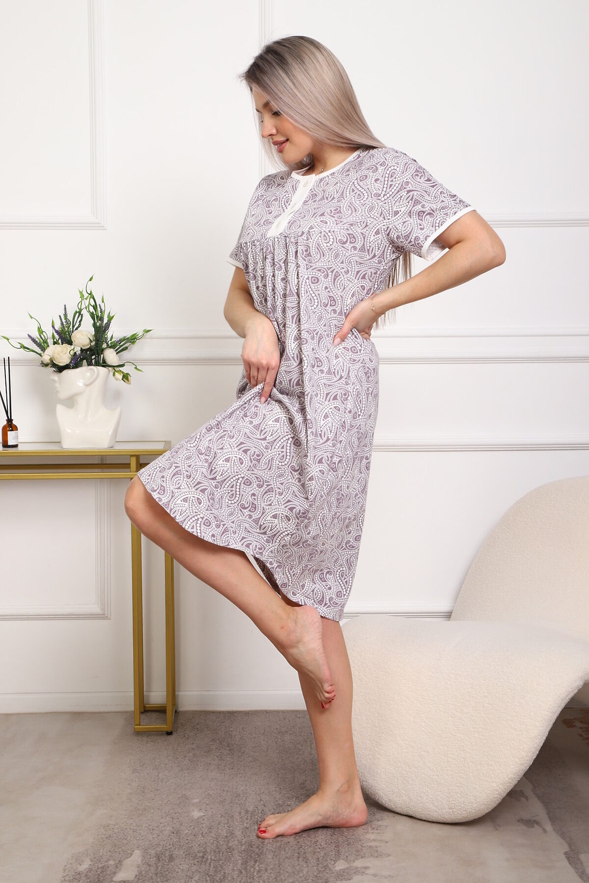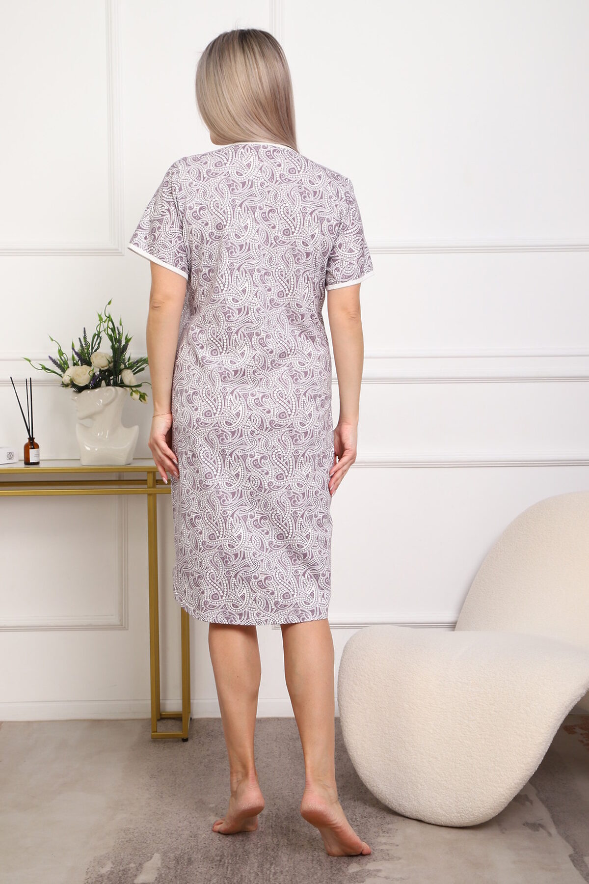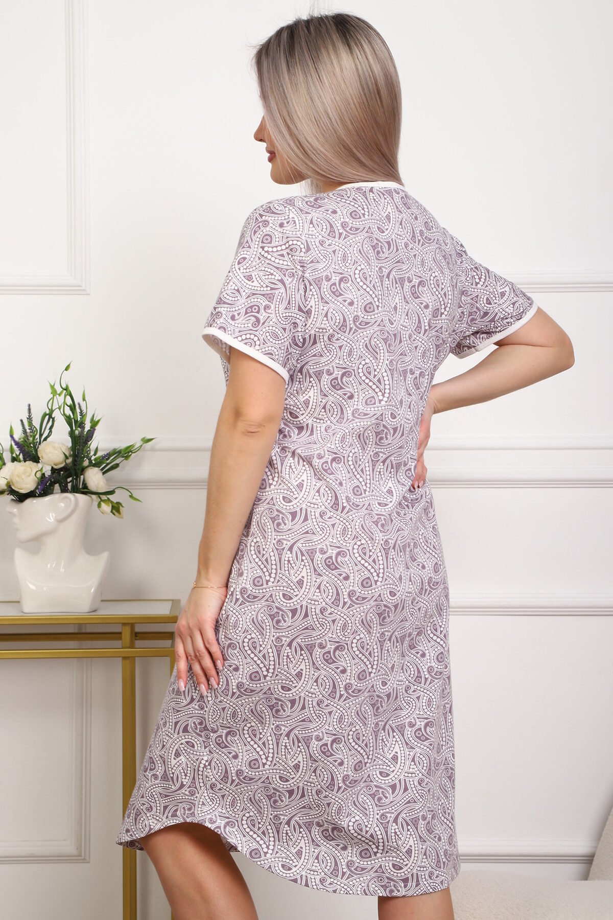 Приятная к телу сорочка из кулирного хлопкового полотна . Удобный короткий рукав, кокетка с планкой на пуговицах. Фасон достаточно свободный за счет хорошей сборки на полочке. Низ изделия фигурный, подшит на плоскошовной машине. Горловина и рукава обработаны окантовкой. из кулирки,