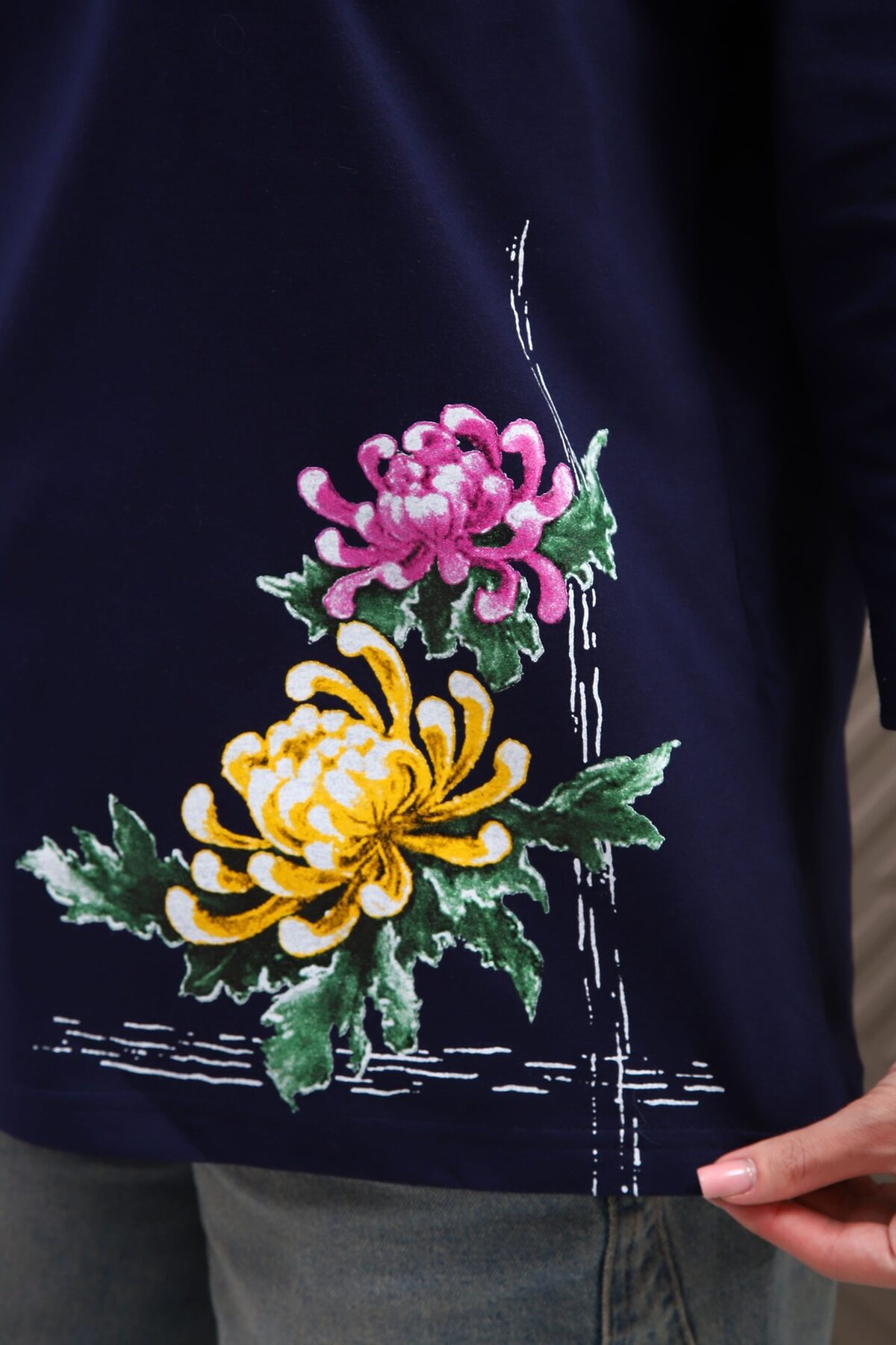 Туника женская. Ткань кулирка, хлопок 100%. Крой свободный, горловина круглой формы, обработана окантовкой. Линия плеч спущена. Длинна рукава 3/4, со швом по локтю. Низ изделия прямой. На полочке принт, шелкография.