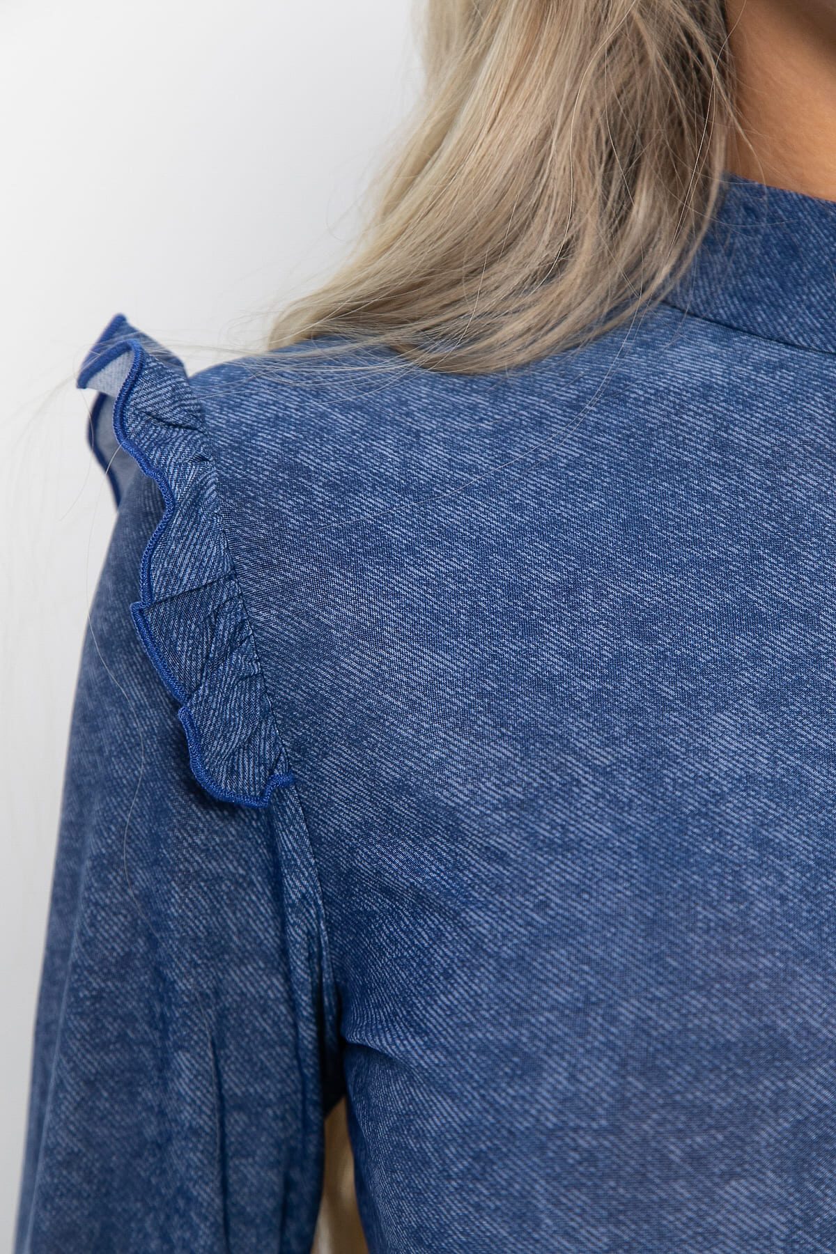 Замечательная блуза в модном синем цвете под джинсу. Декоративные элементы в виде рюш в плечах. Идеально подойдет к джинсам, брюкам и юбке.