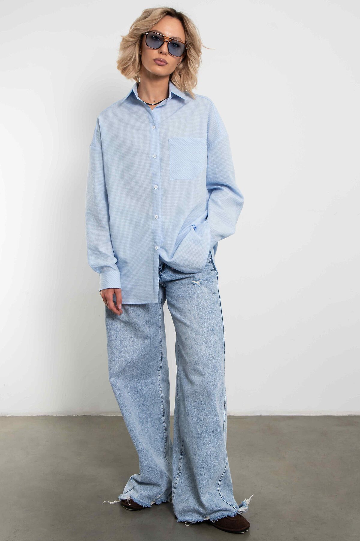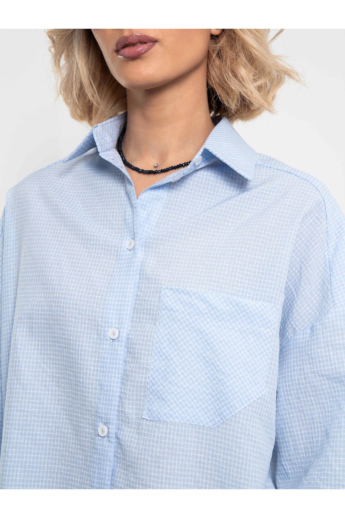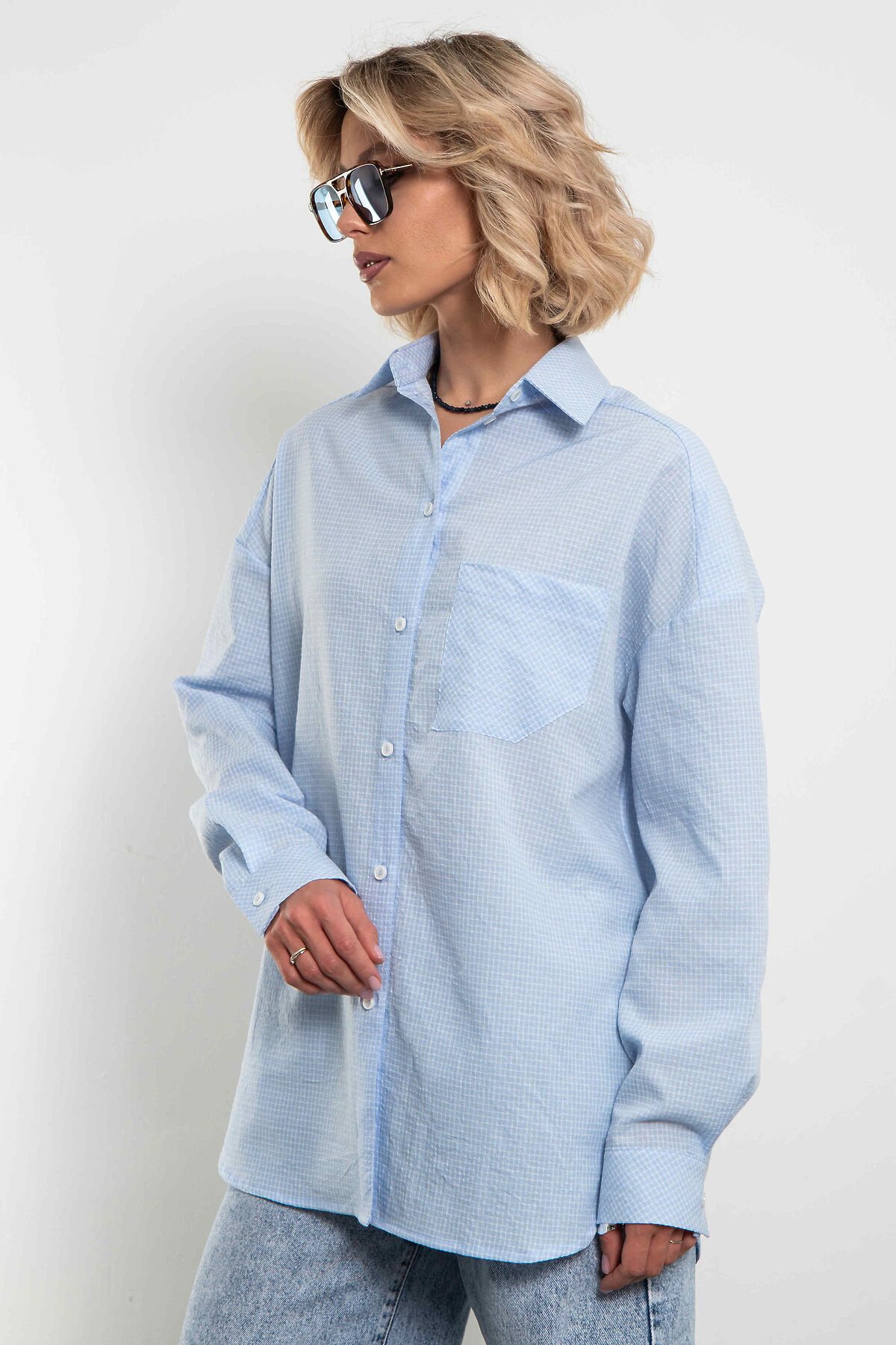Женская стильная рубашка в голубую клетку — это сочетание элегантности и комфорта. Универсальная клетчатая рубашка oversize с нагрудным карманом. Застегивается на пуговицы.Модель отличается свободным кроем, мягкой тканью и утонченными деталями. Рубашку можно носить, как с джинсами и юбками, так и с брюками, создавая разнообразные образы от casual до полуформального стиля. Голубая клетка остается актуальной тенденцией, подчеркивая женственность и индивидуальность обладательницы.