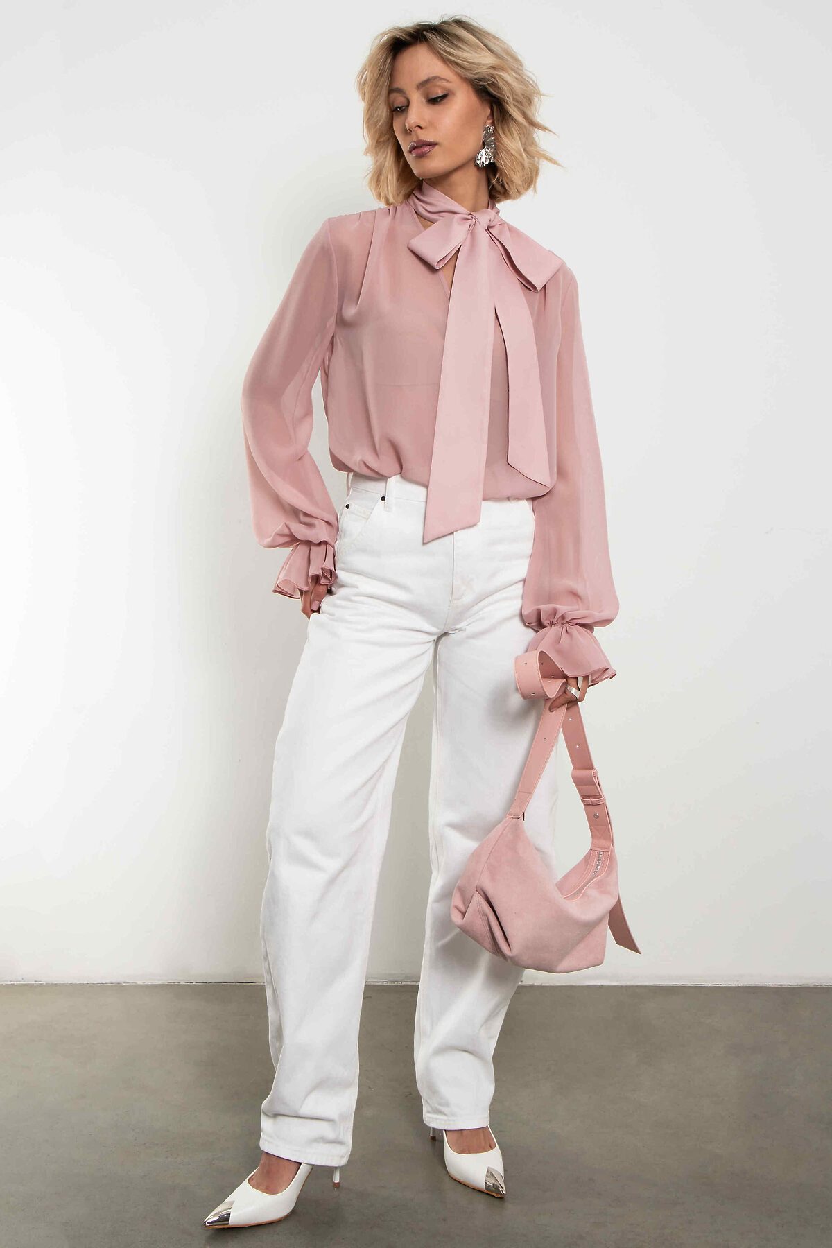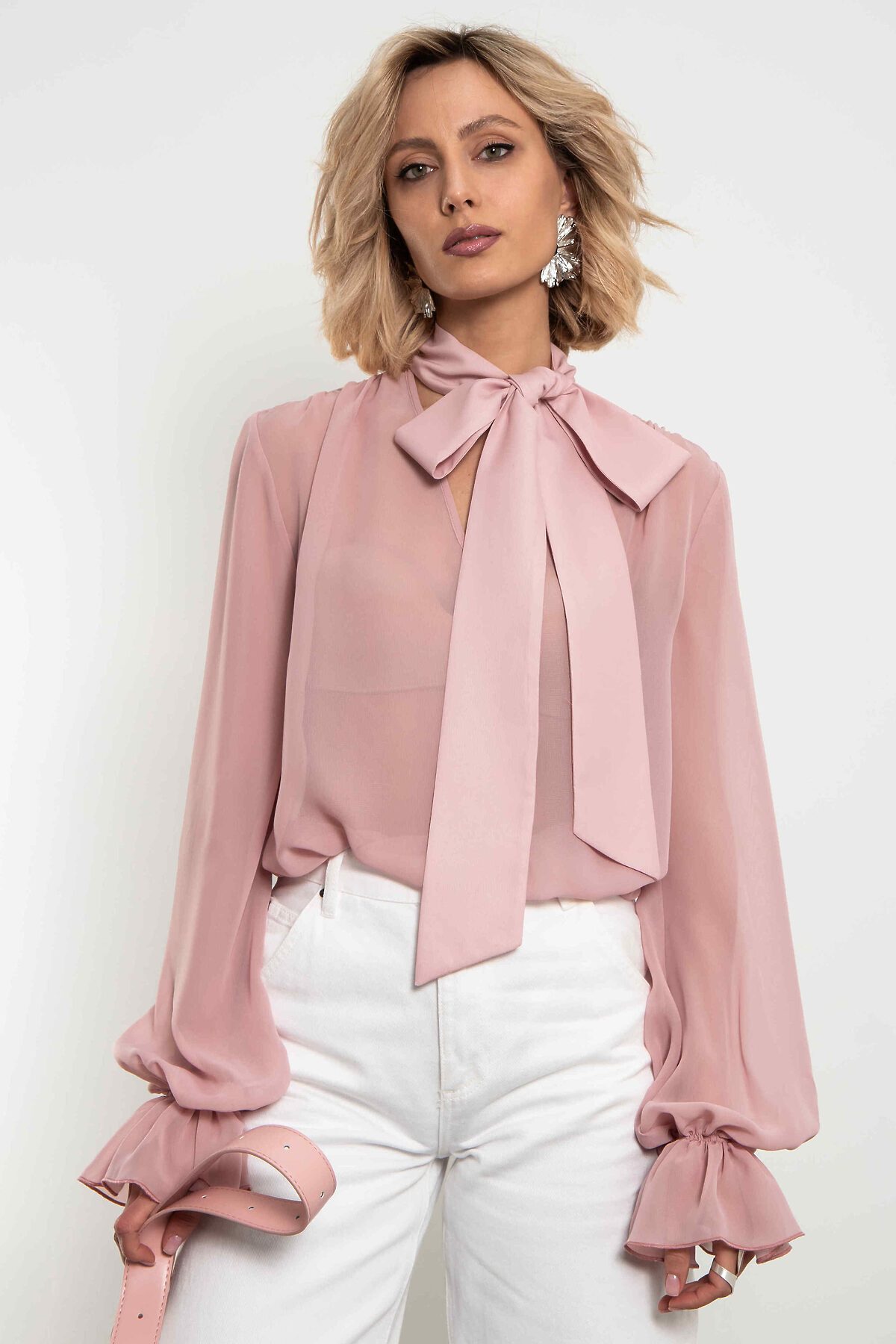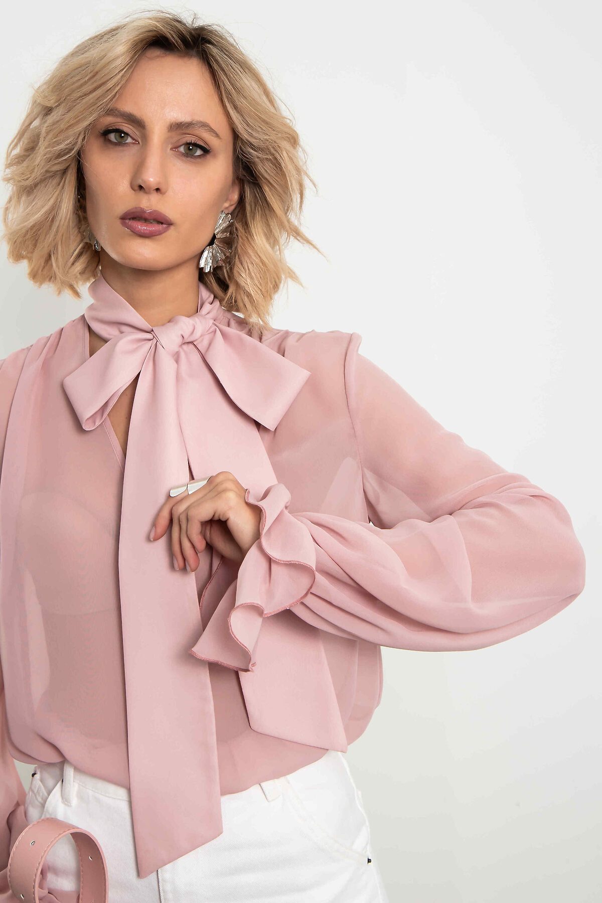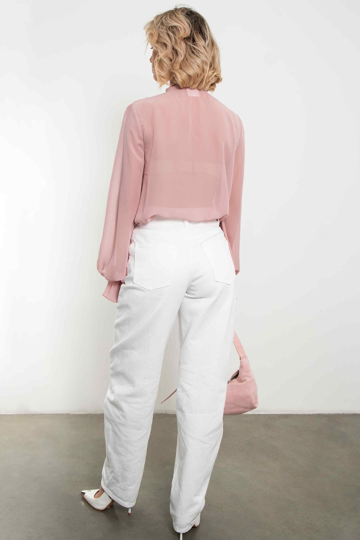 Невесомая шифоновая блуза в нежнейшем пыльно-розовом оттенке. Большой бант на воротнике, объёмные рукава с мягкими сборками по манжетам и полупрозрачная ткань, которая струится при каждом движении — эта модель создана, чтобы вы чувствовали себя легко, женственно и немного сказочно. Идеальна для романтических образов, свиданий, особенных выходов и тех дней, когда хочется выглядеть утончённо без усилий. Носите с джинсами, юбкой-карандаш, брюками палаццо или поверх платья — везде смотрится изысканно. Уход: бережная стирка при температуре 30°С не отбеливать сушка в барабане запрещена химчистка запрещена утюжить при максимальной температуре утюга до 110°