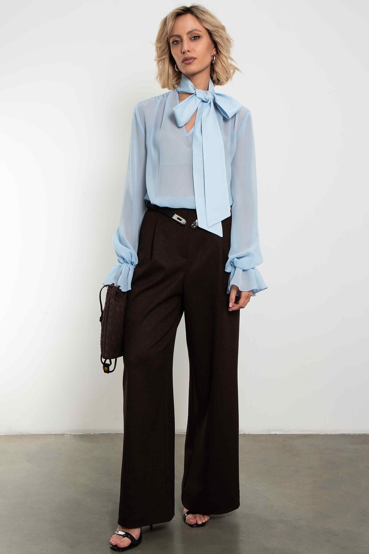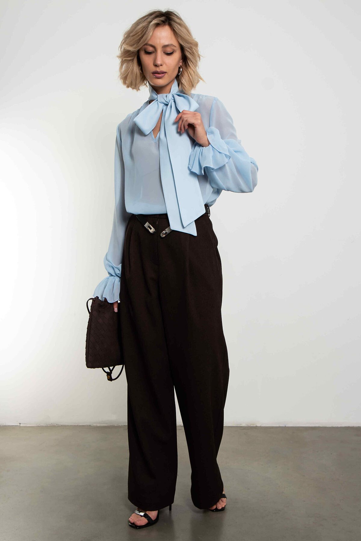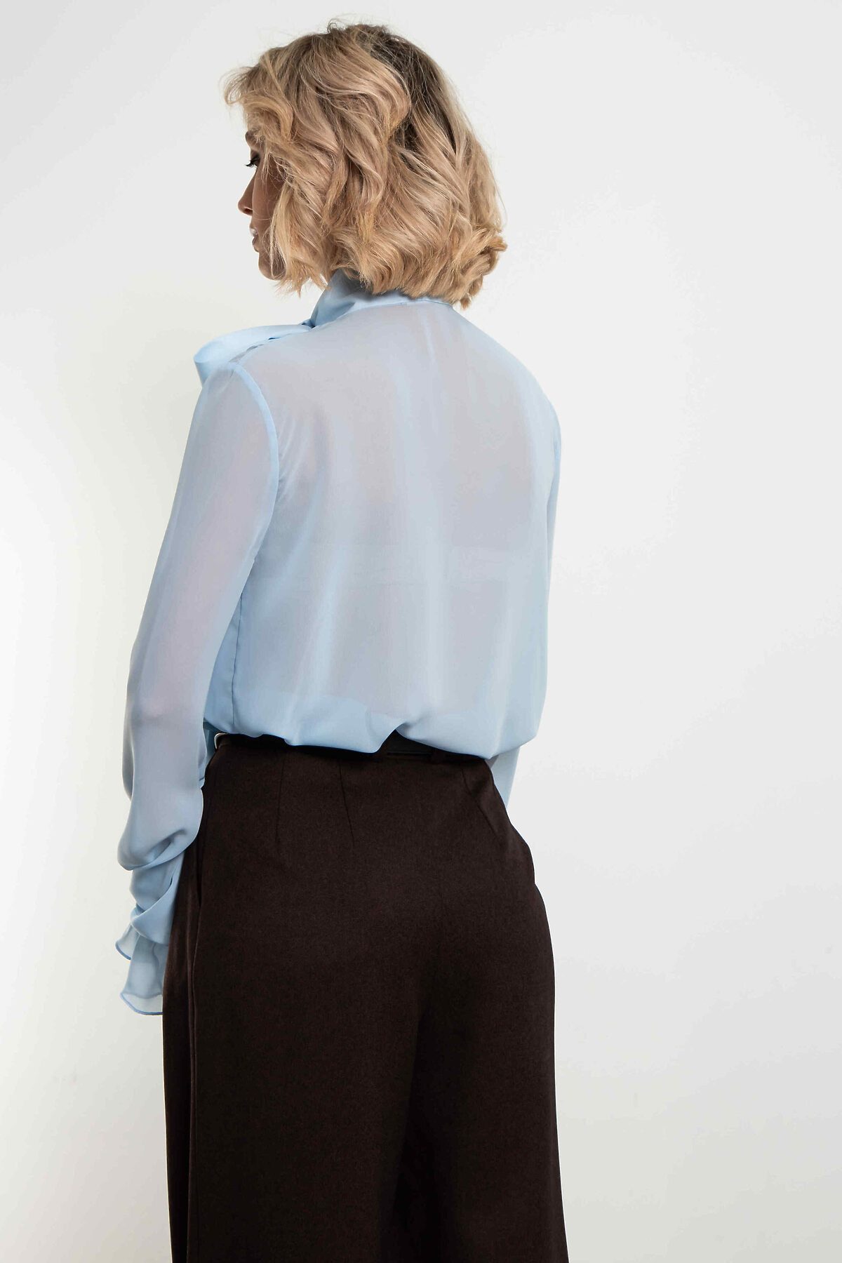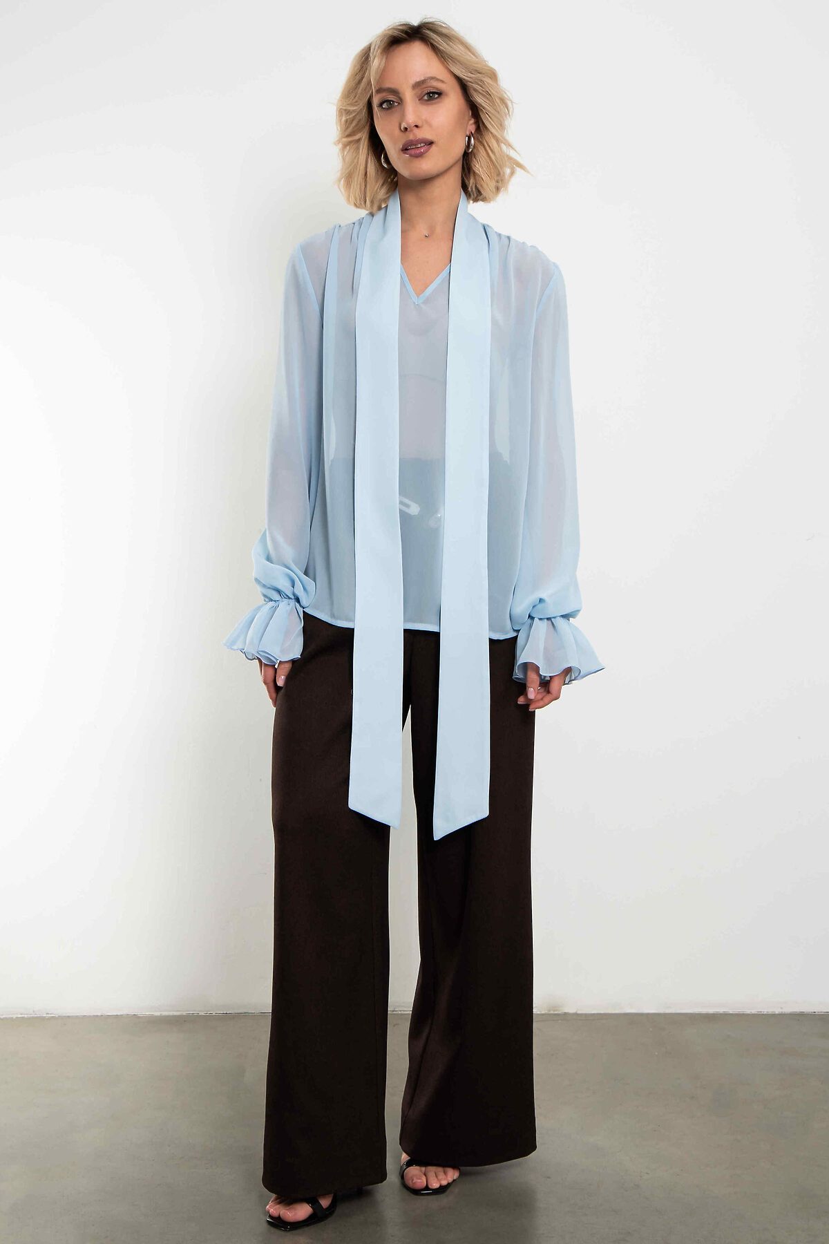 Невесомая шифоновая блуза в нежнейшем небесно-голубого оттенке. Большой бант на воротнике, объёмные рукава с мягкими сборками по манжетам и полупрозрачная ткань, которая струится при каждом движении — эта модель создана, чтобы вы чувствовали себя легко, женственно и немного сказочно. Идеальна для романтических образов, свиданий, особенных выходов и тех дней, когда хочется выглядеть утончённо без усилий. Носите с джинсами, юбкой-карандаш, брюками палаццо или поверх платья — везде смотрится изысканно. Уход: бережная стирка при температуре 30°С не отбеливать сушка в барабане запрещена химчистка запрещена утюжить при максимальной температуре утюга до 110°