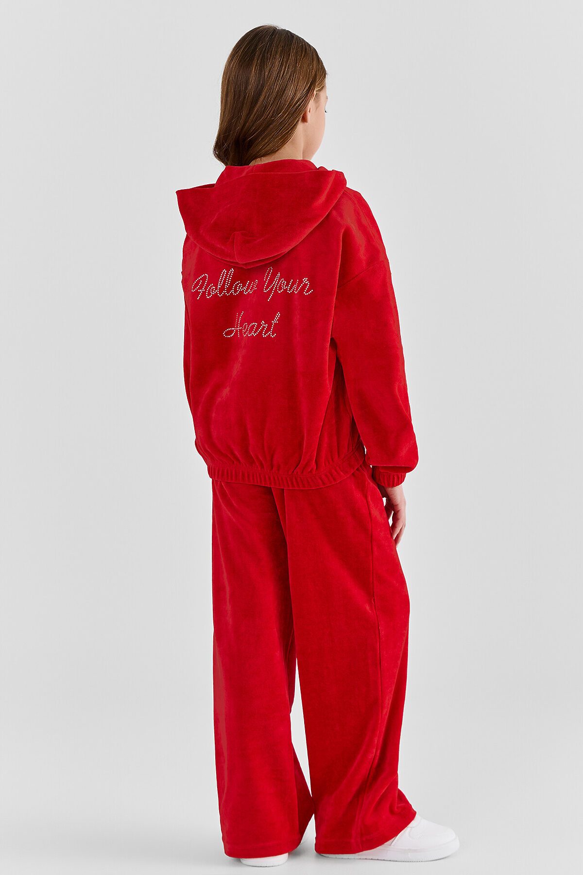 Толстовка детская свободного силуэта с капюшоном, спинка цельнокроеная. Горловина круглой формы. Капюшон двойной . Плечо слегка спущено, пройма углублена. Низ рукава и изделия обработан в подгибку с резиной внутри 30RV. Перед с центральной застежкой на молнию. Брюки свободного силуэта с высокой посадкой. Пояс цельнокроеный с эластичной тесьмой внутри 30RV. Карманы в боковых швах. Низ брюк обработан швом вподгибку.
