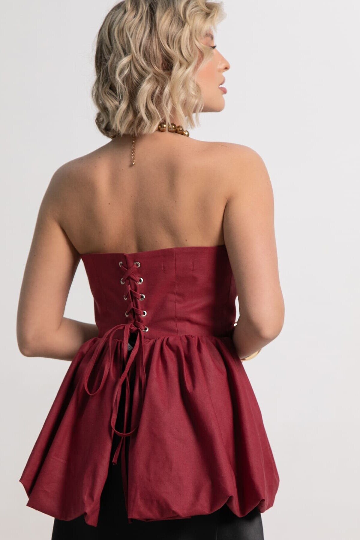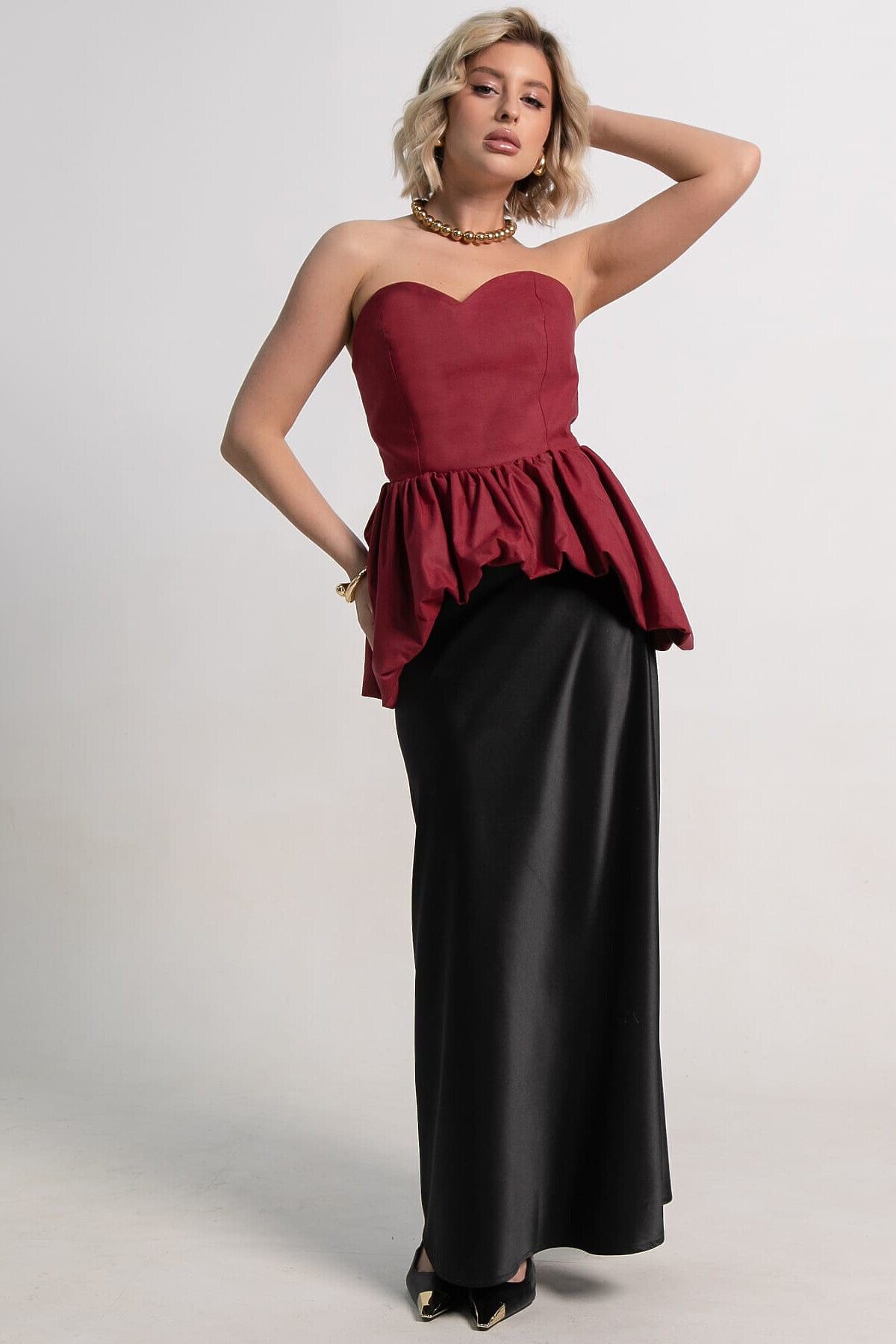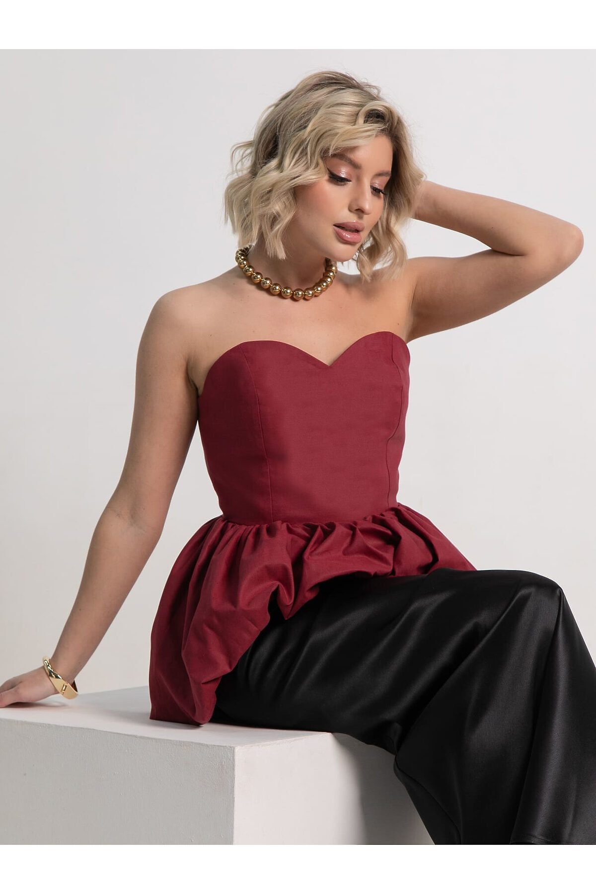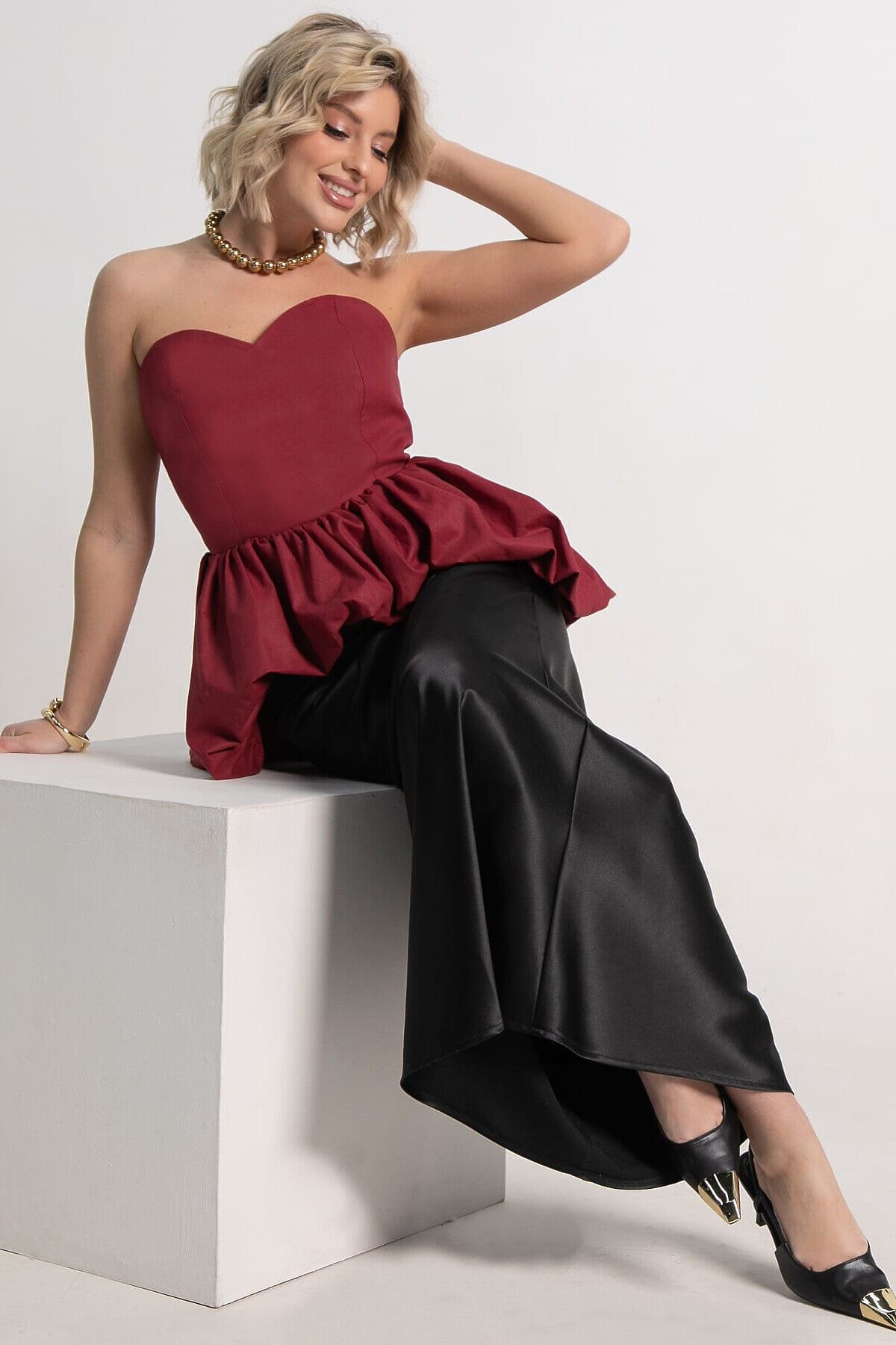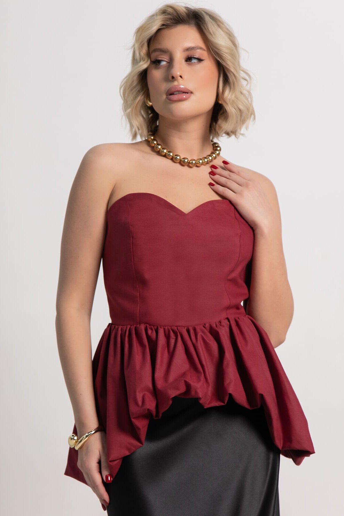 Праздничный женский корсет с баской в вишневой расцветке станет основой для праздничных образов на день рождения, вечеринку, корпоратив в офис. Или сделайте однотонный топ-бандо основой более изящных минималистичных образов на учебу или в офис. В топе с открытыми плечами вы будете чувствовать себя музой в современных городских луках в стиле кэжуал, смарт-кэжуал и даже спорт-шик. Деликатная стирка.