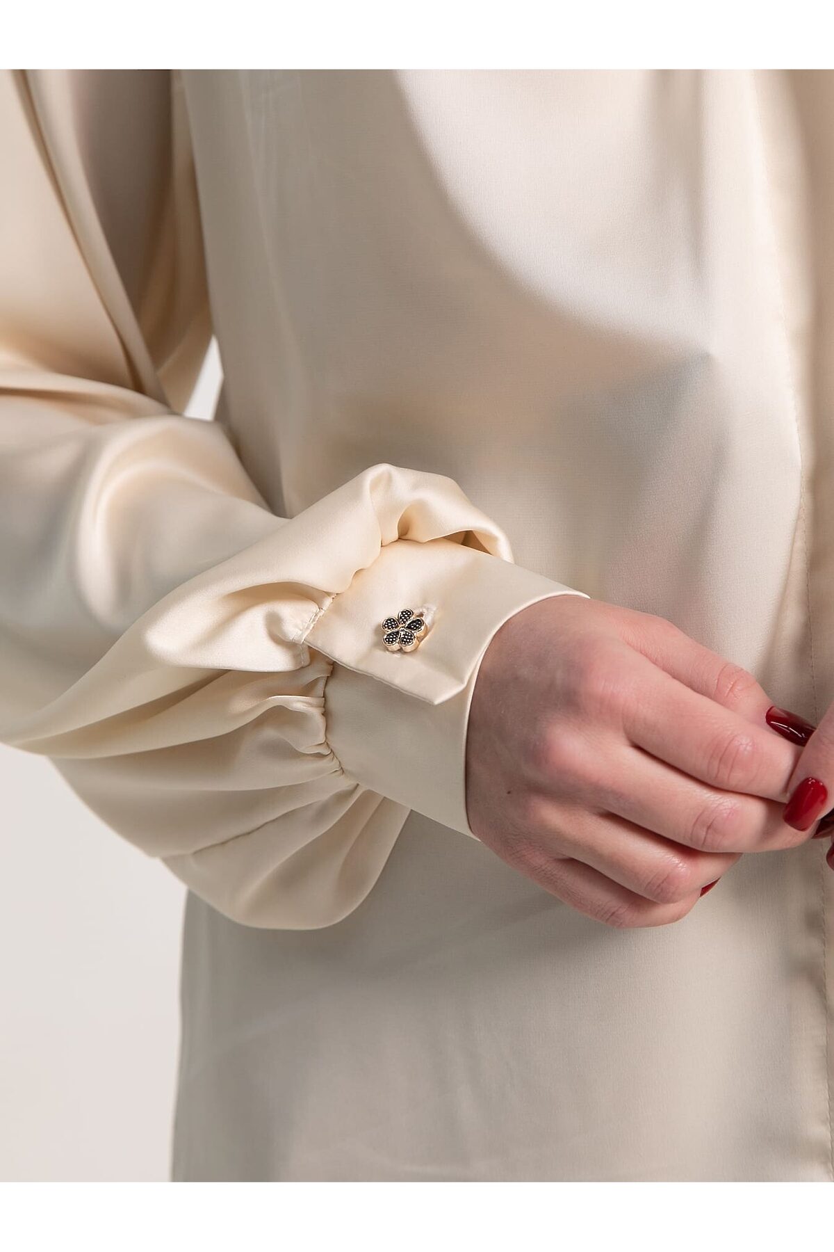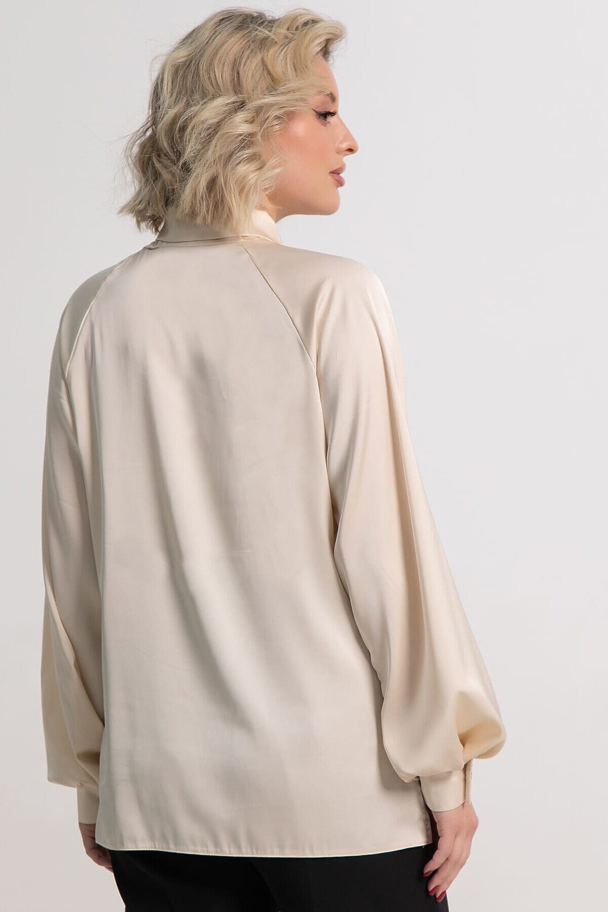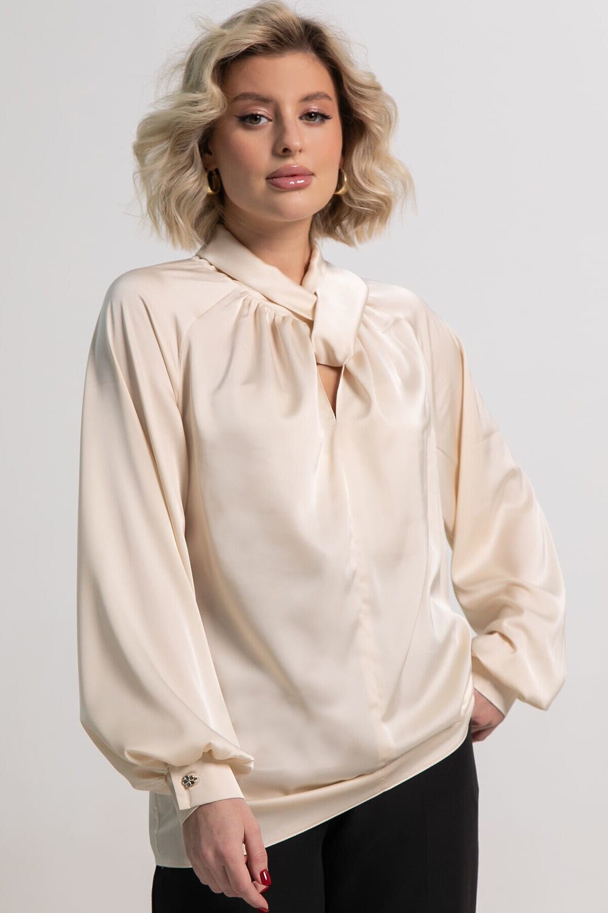 С помощью этой элегантной блузки в красивом жемчужном цвете вы сможете создать неповторимый образ, который будет привлекать внимание. Модель с длинными рукавами реглан и манжетами на пуговицах выглядит очень стильно. Воротник оформлен в виде декоративного узла, что придаёт образу особую изысканность. Блузка прекрасно сочетается с джинсами, юбками и брюками.