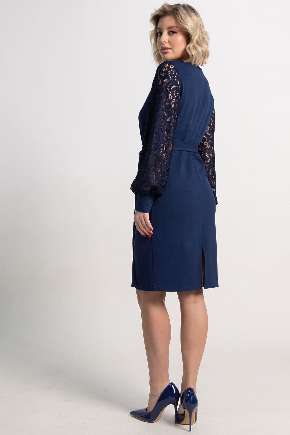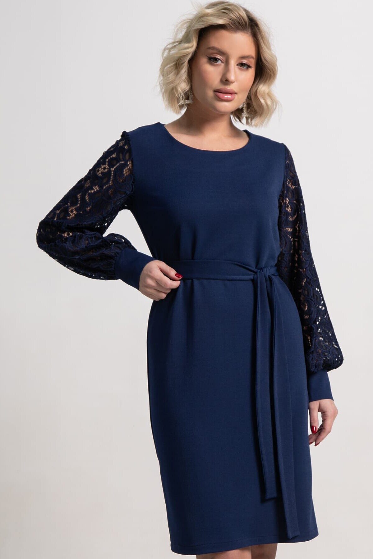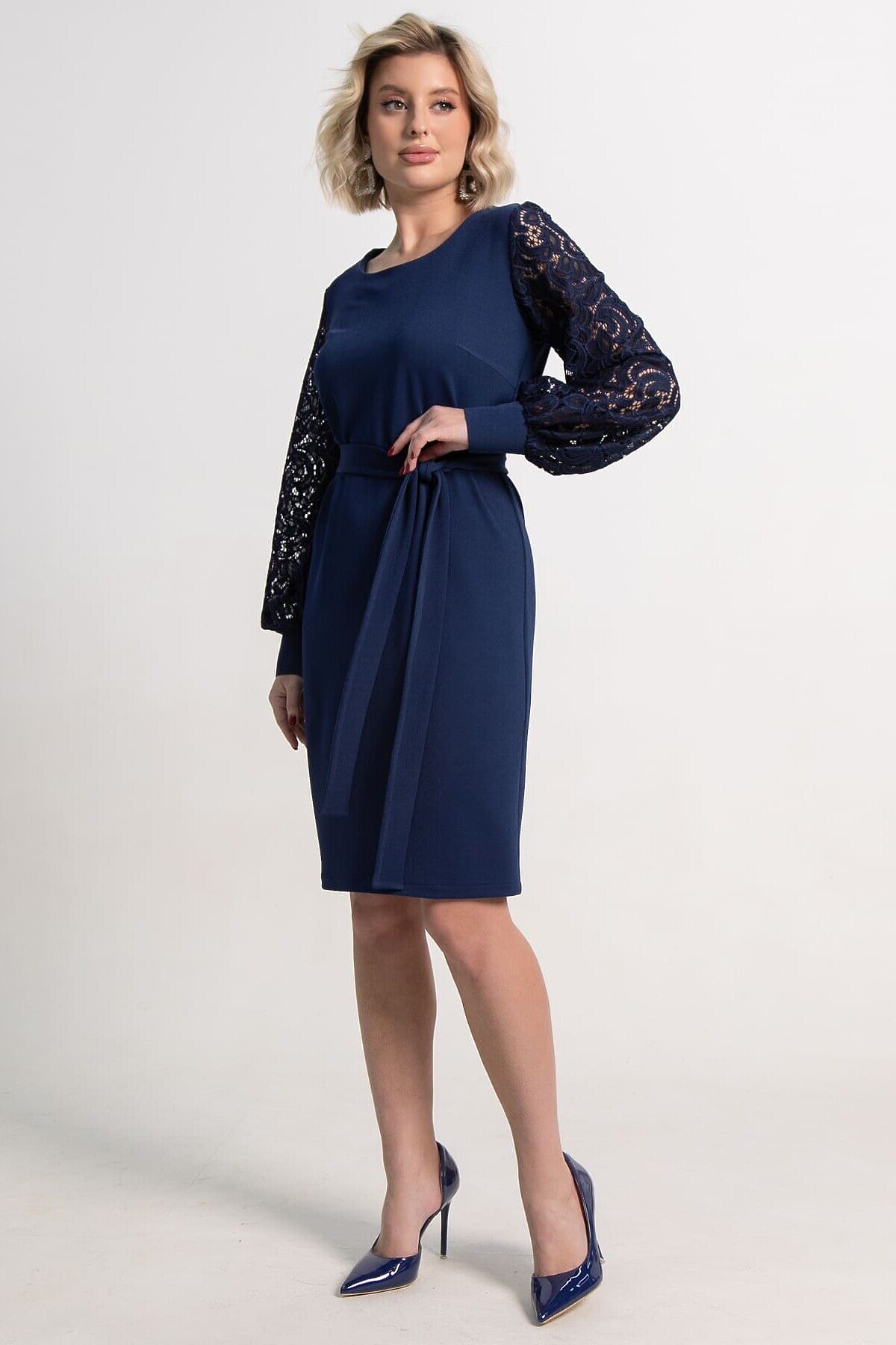Изысканное темно-синее платье, которое станет жемчужиной вашего гардероба. Модель имеет полуприлегающий силуэт средней длины, придающий образу женственность и гармонию. Длинные втачные рукава из кружева в тон основной ткани украшены широкими манжетами внизу. Пояс из основной ткани входит в комплект, с помощью которого можно подчеркнуть талию. Это платье идеально для торжественных случаев и особых моментов.
