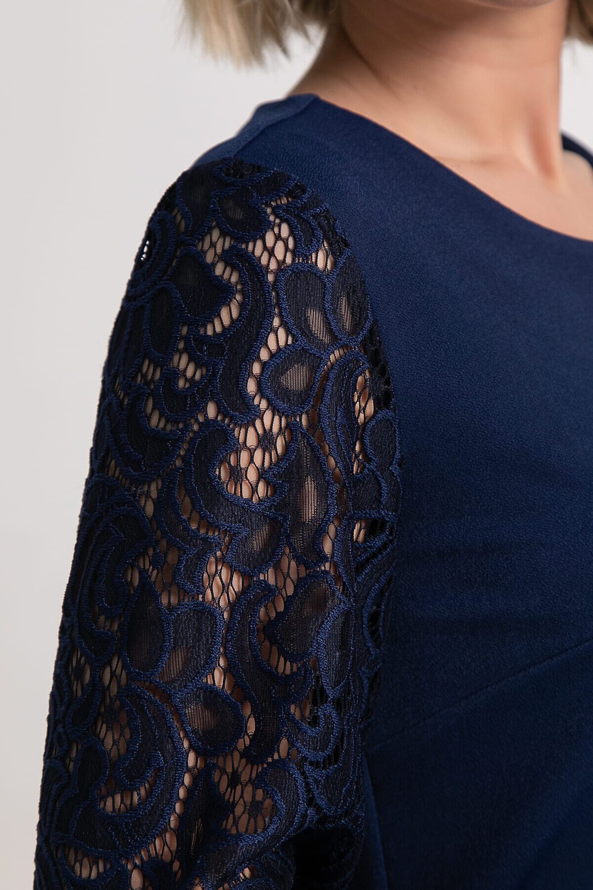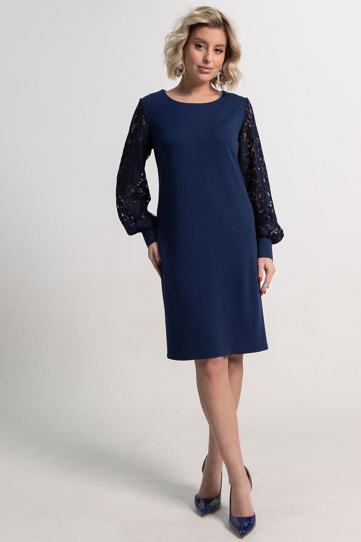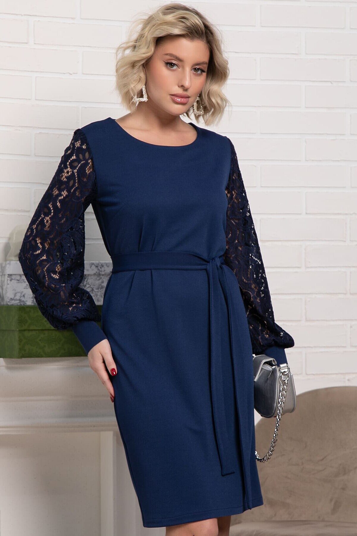 Изысканное темно-синее платье, которое станет жемчужиной вашего гардероба. Модель имеет полуприлегающий силуэт средней длины, придающий образу женственность и гармонию. Длинные втачные рукава из кружева в тон основной ткани украшены широкими манжетами внизу. Пояс из основной ткани входит в комплект, с помощью которого можно подчеркнуть талию. Это платье идеально для торжественных случаев и особых моментов.