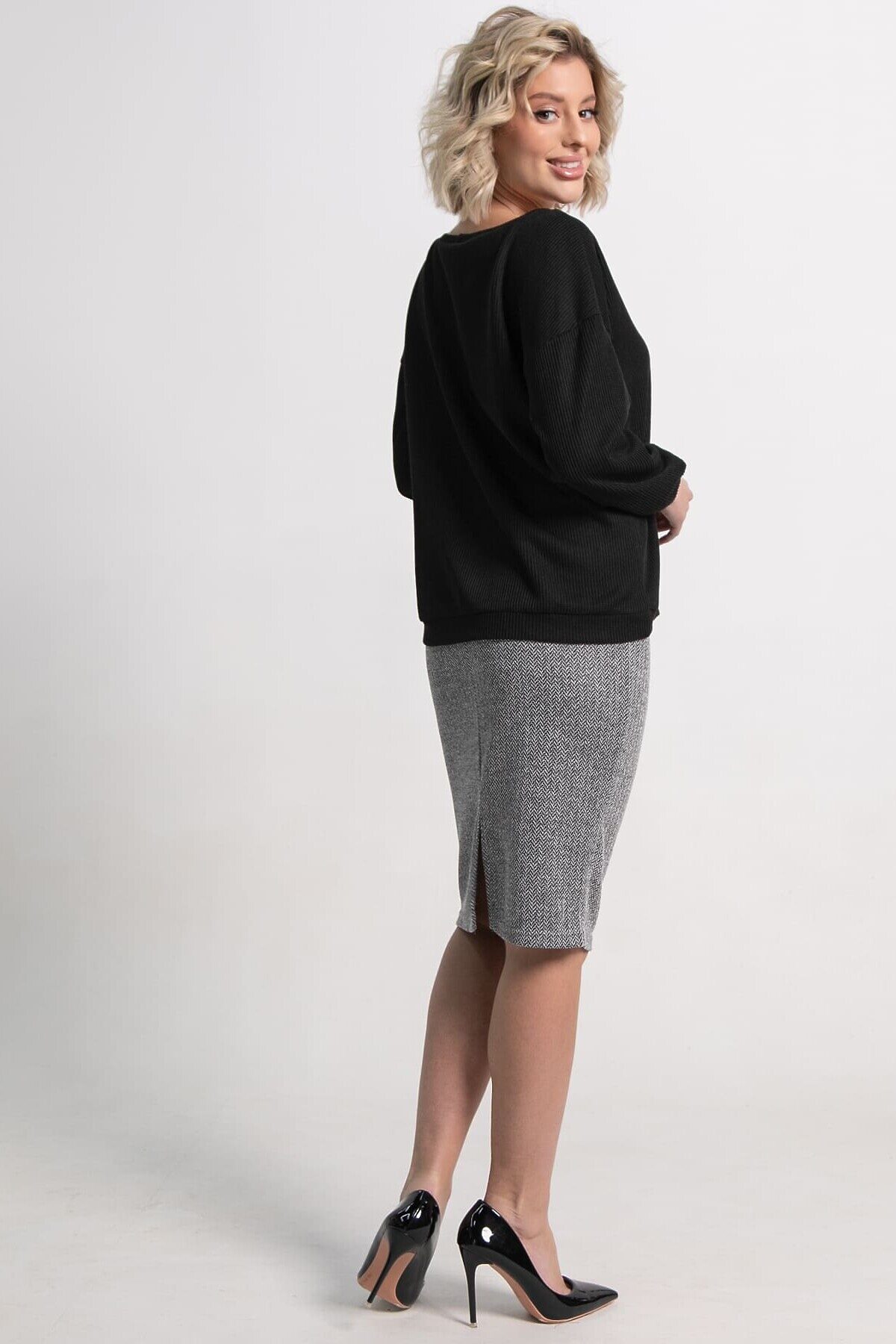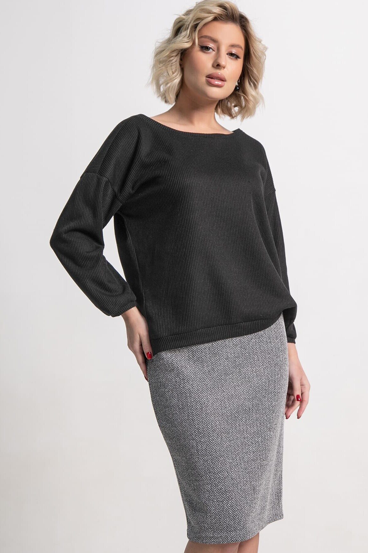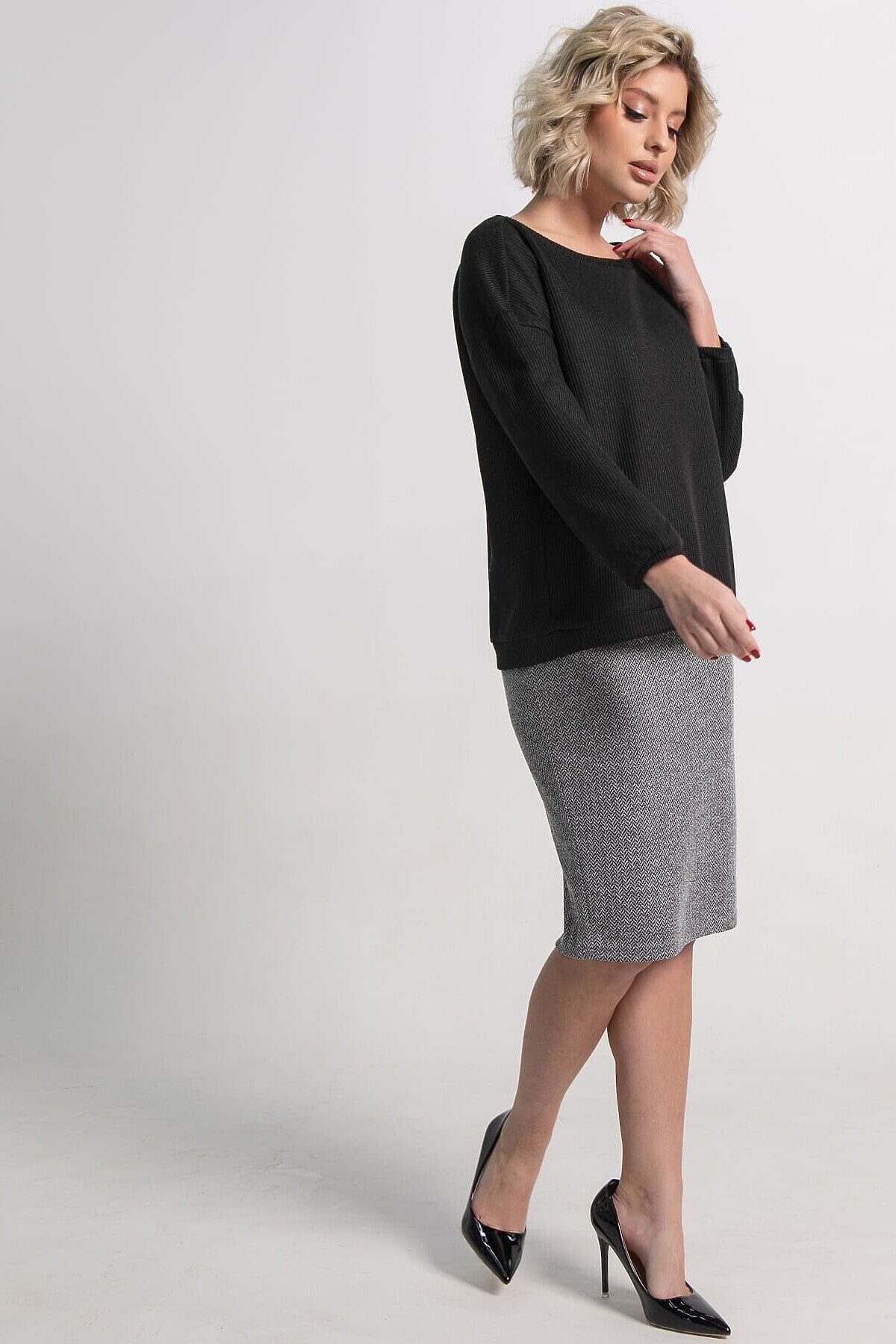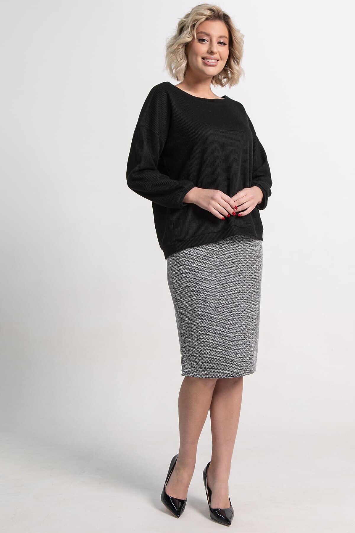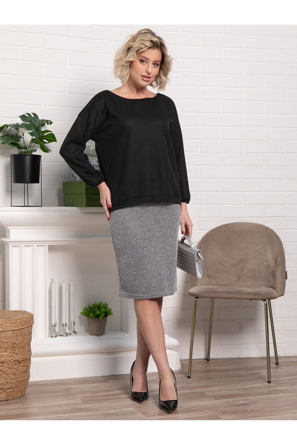 Элегантный костюм из джемпера черного цвета и юбки серого оттенка — ваш выбор для стильных образов. Подчеркните свою индивидуальность и безупречный вкус! Почему стоит выбрать этот костюм: Универсальность: черный джемпер и серая юбка идеально сочетаются между собой, а также с другой одеждой из вашего гардероба. Комфорт: мягкая, тактильно приятная ткань дарит ощущение уюта в течение всего дня. Актуальный дизайн: классический крой и нейтральные цвета делают костюм вечной классикой, которая всегда будет в тренде. Идеальная посадка: костюм подчеркивает достоинства фигуры, создавая женственный и утонченный силуэт. Этот костюм станет основой для множества эффектных образов – от деловых встреч до вечерних рандеву. Создавайте стильные комбинации и будьте на высоте, независимо от повода!