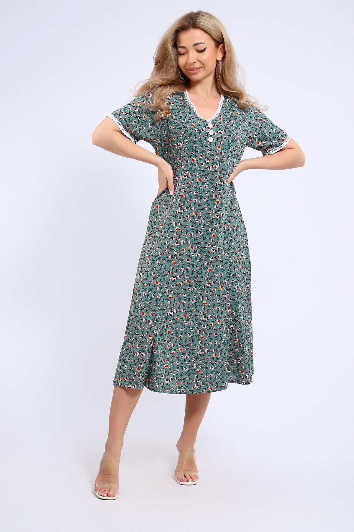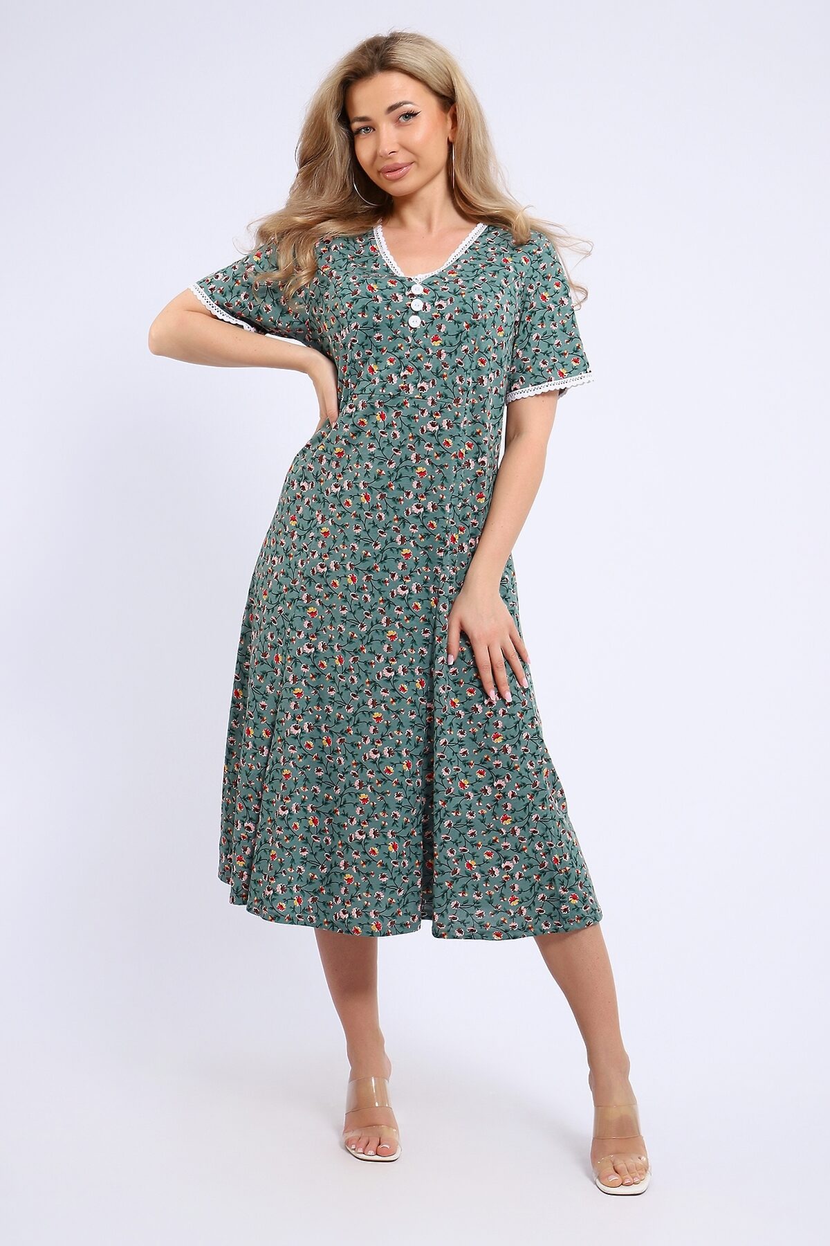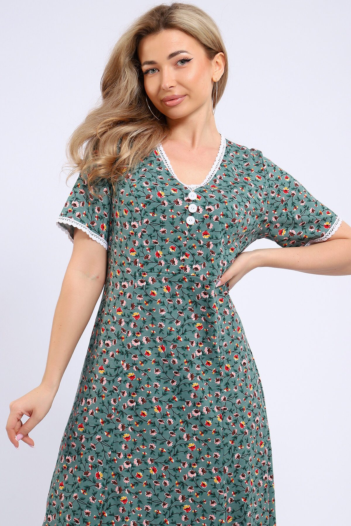 Платье женское выполнено в романтичном стиле из кулирки 100% хлопок. Платье с коротким рукавом, в области груди-подрез, горловина и края рукавов отделаны красивым х/б кружевом, пуговицы без петель. Платье очень женственное, комфортное, имеет отличную посадку по фигуре, подойдет для романтичных образов.