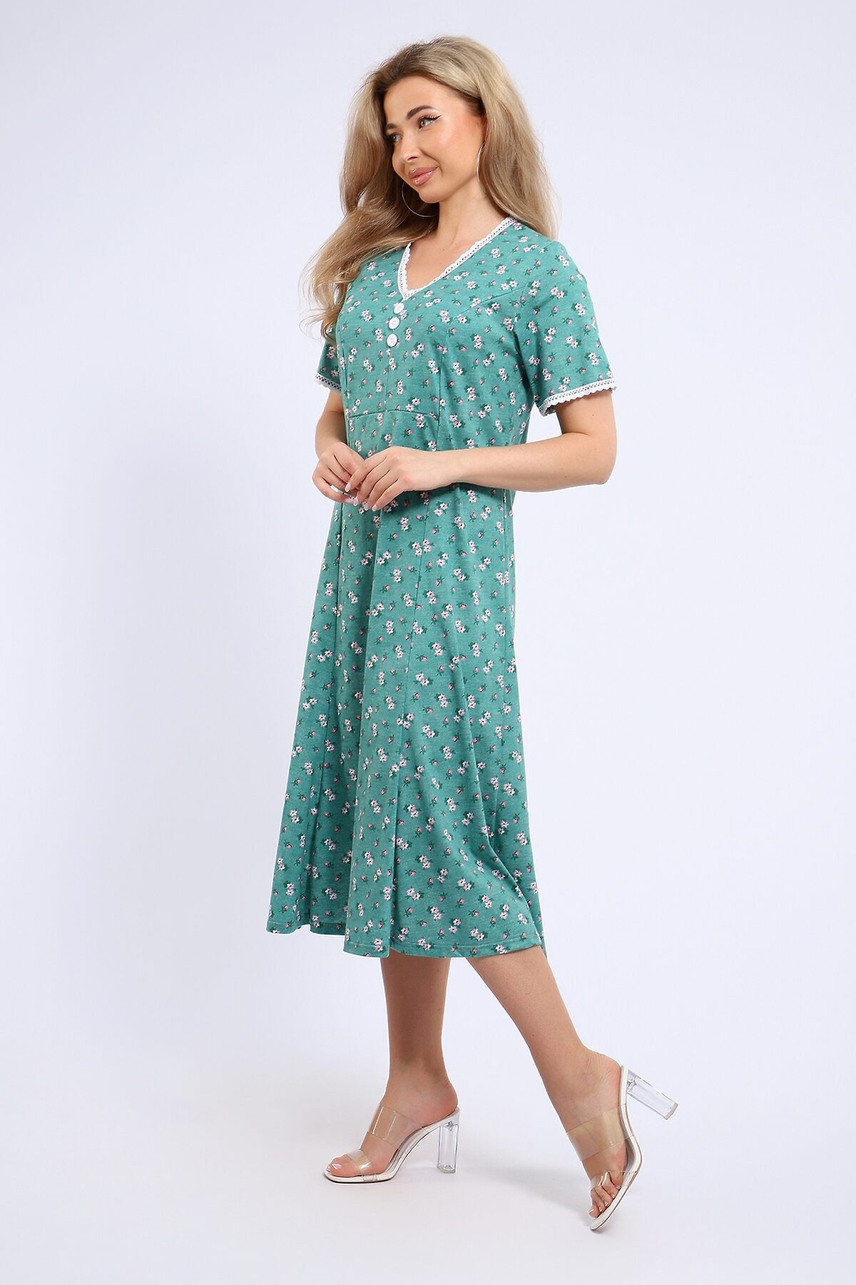 Платье женское выполнено в романтичном стиле из кулирки 100% хлопок. Платье с коротким рукавом, в области груди-подрез, горловина и края рукавов отделаны красивым х/б кружевом, пуговицы без петель. Платье очень женственное, комфортное, имеет отличную посадку по фигуре, подойдет для романтичных образов.