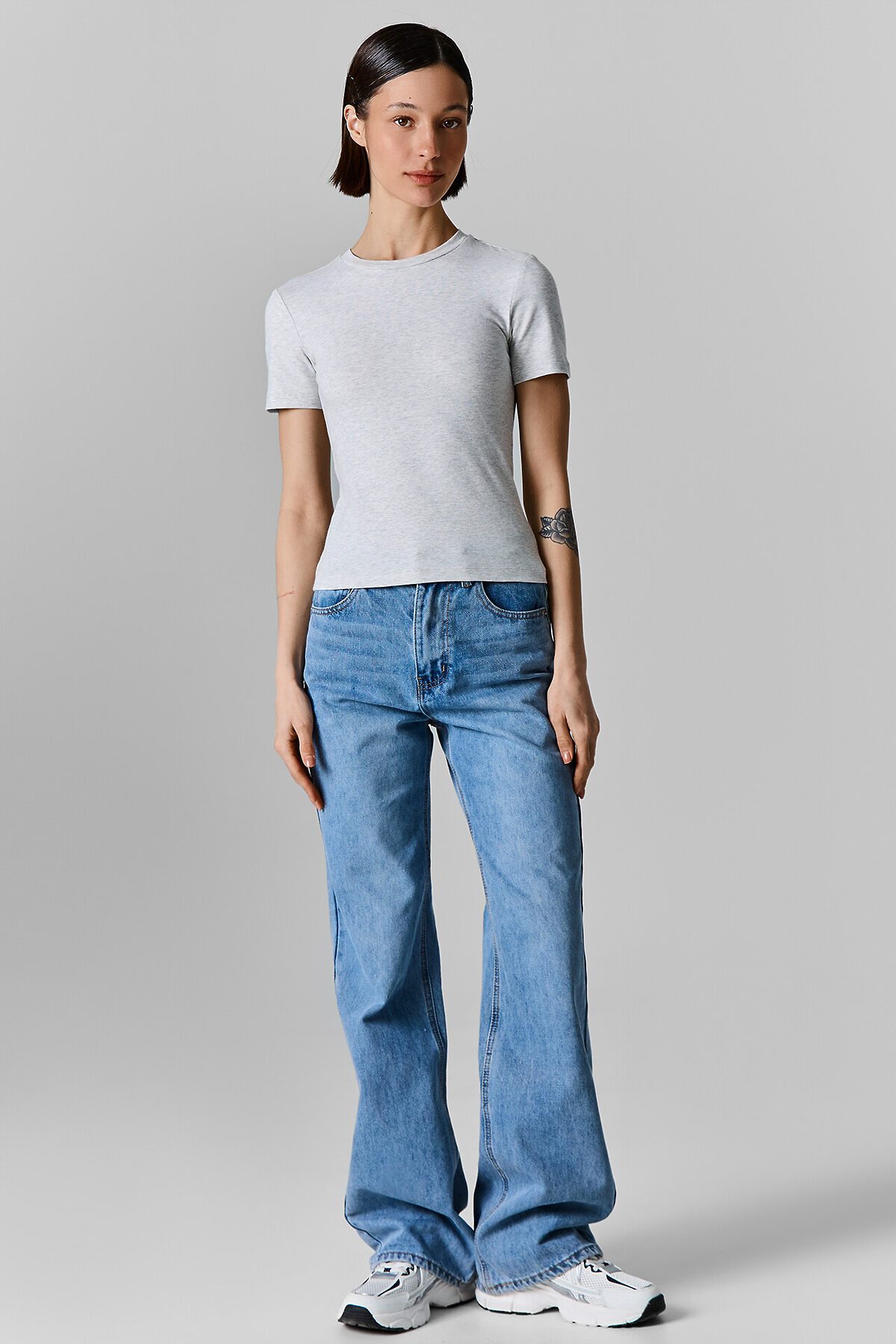 Джемпер прилегающего силуэта. Перед и спинка цельнокроеные. Рукава короткие, втачные. Горловина обработана обтачкой из основного полотна. Низ и рукава вподгибку. Навесной ярлык premium base по заданию.