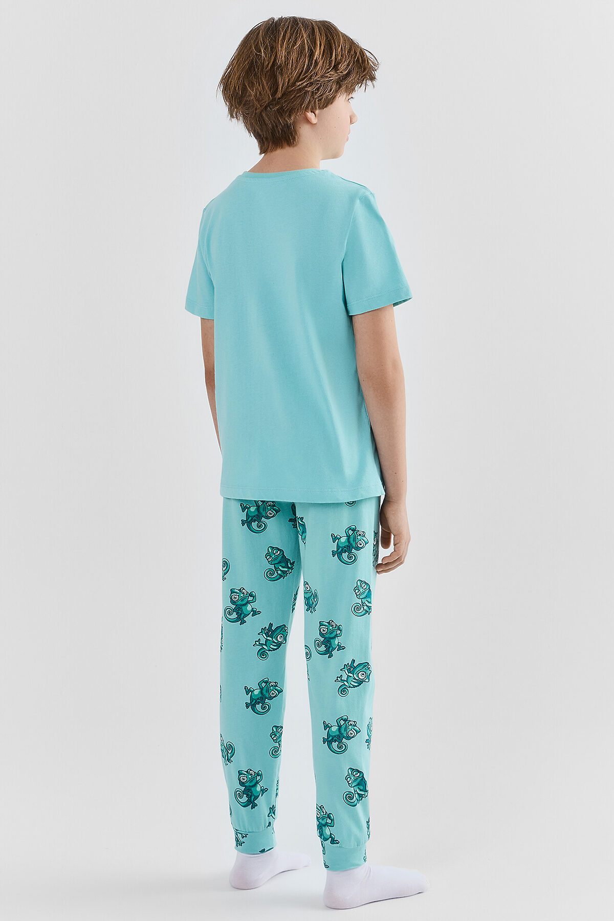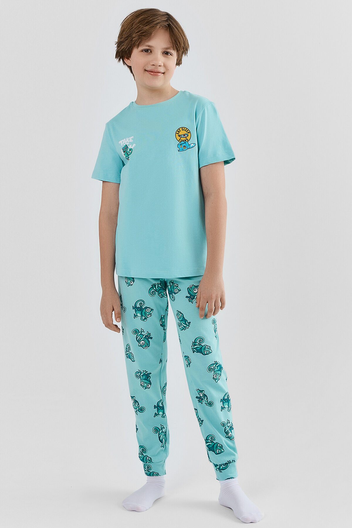 Стильная и уютная пижама для мальчиков. Выполнена из хлопковой трикотажной кулирки. Пижама состоит из футболки с коротким рукавом и длинных брюк с эластичной резиной в поясе. Штанины завершаются манжетами. Для самых комфортных снов!