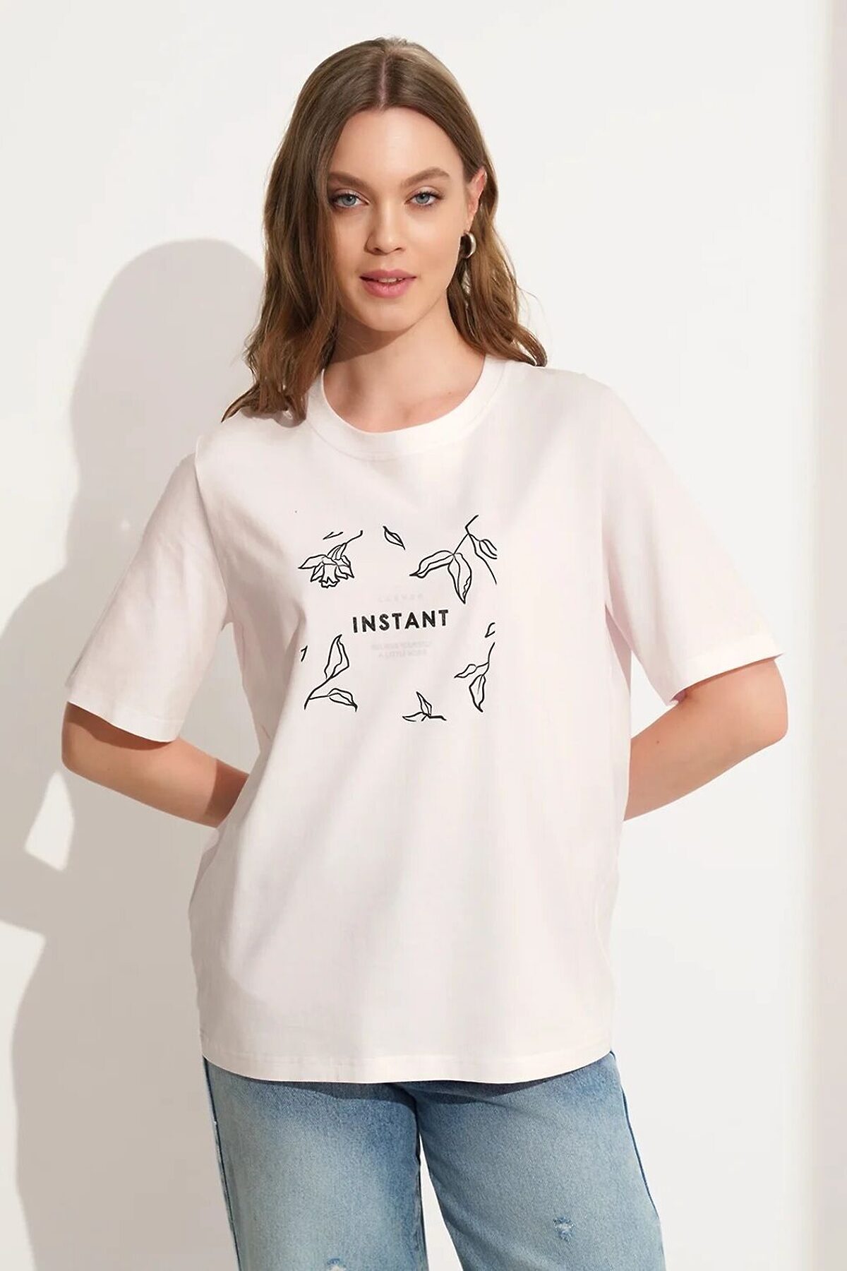 Футболка из хлопкового трикотажного полотна, прямого силуэта. Короткий втачной рукав. Округлая горловина с обтачкой. По переду принт.