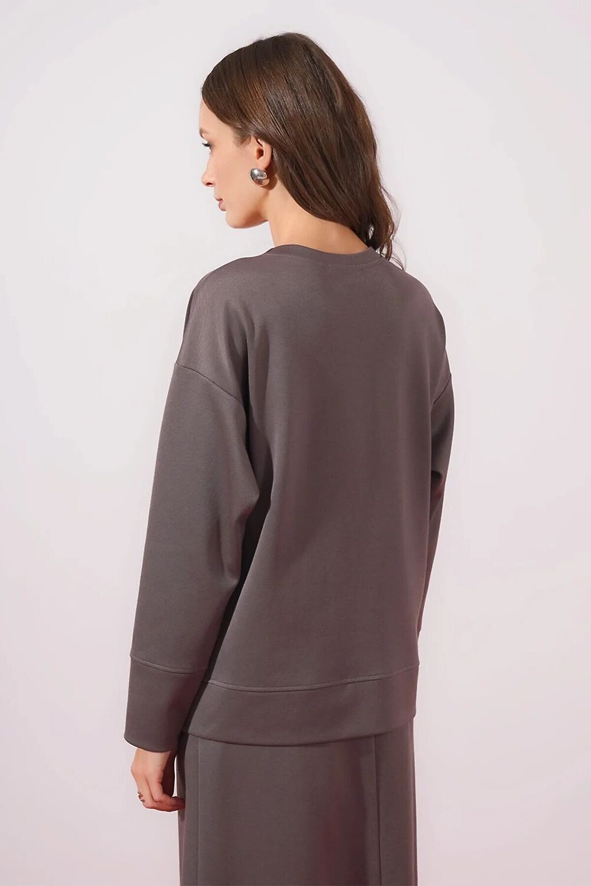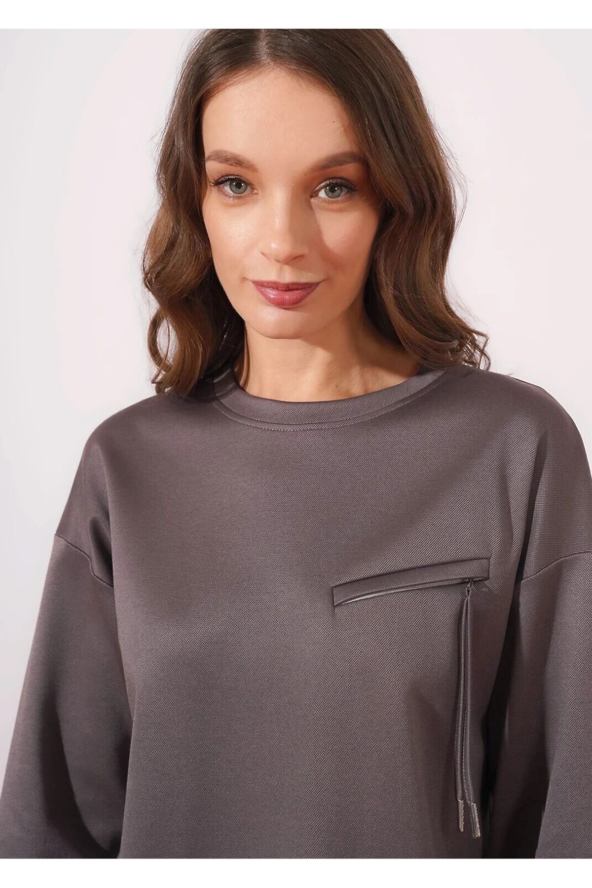 Джемпер из трикотажного полотна джинс-трикотаж, свободного кроя. Длинный рукав со спущенной линией плеча. Округлая горловина с обтачкой. Спереди карман листочка с молнией и шнуром из окантовки. По низу рукава, изделия широкий манжет. Боковые разрезы.