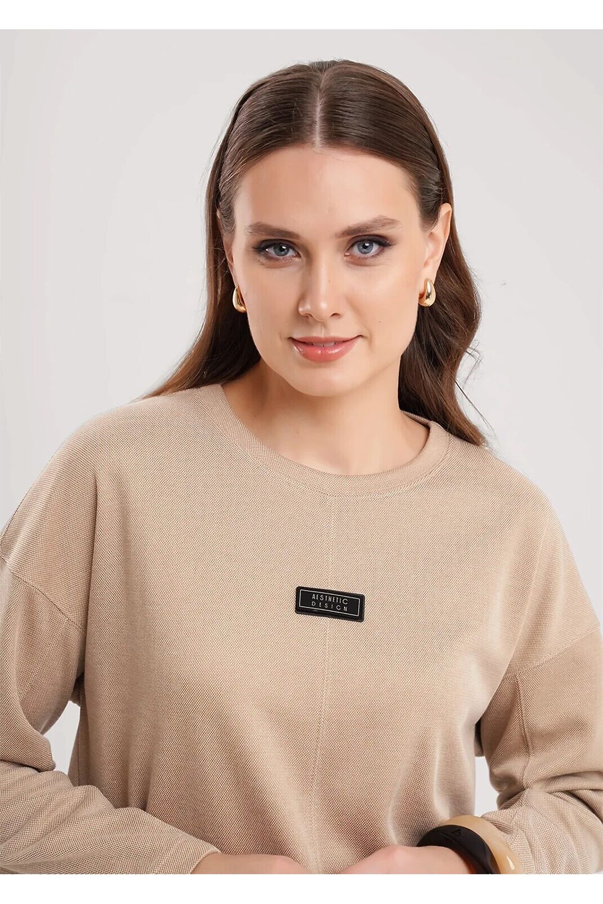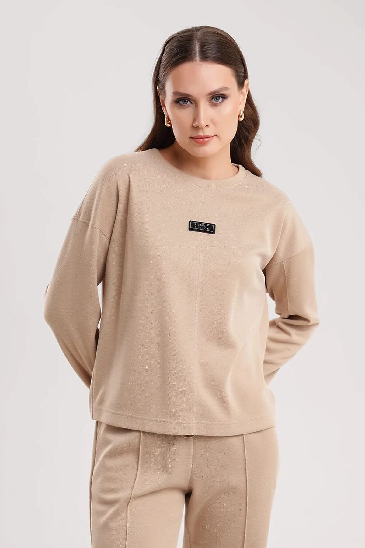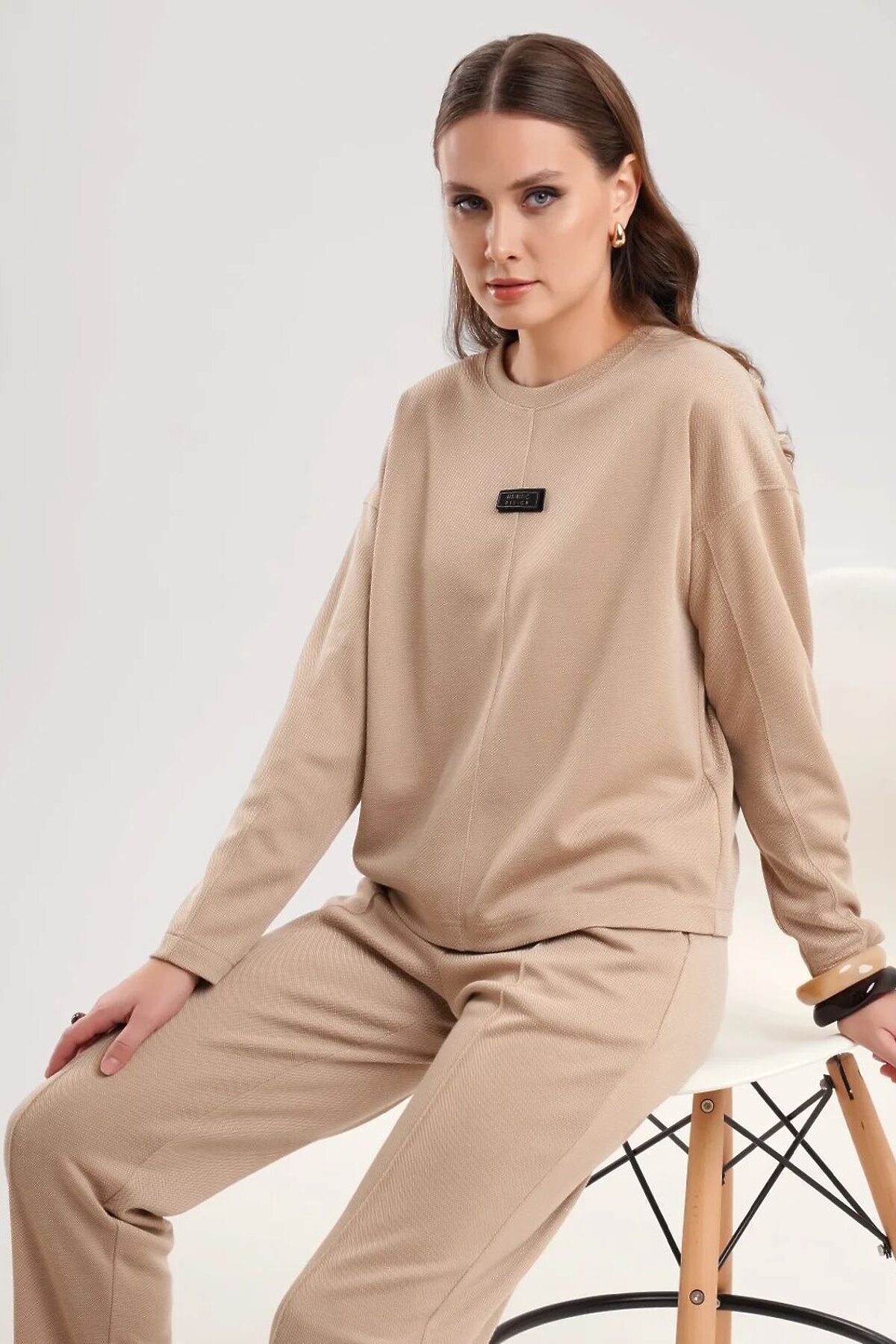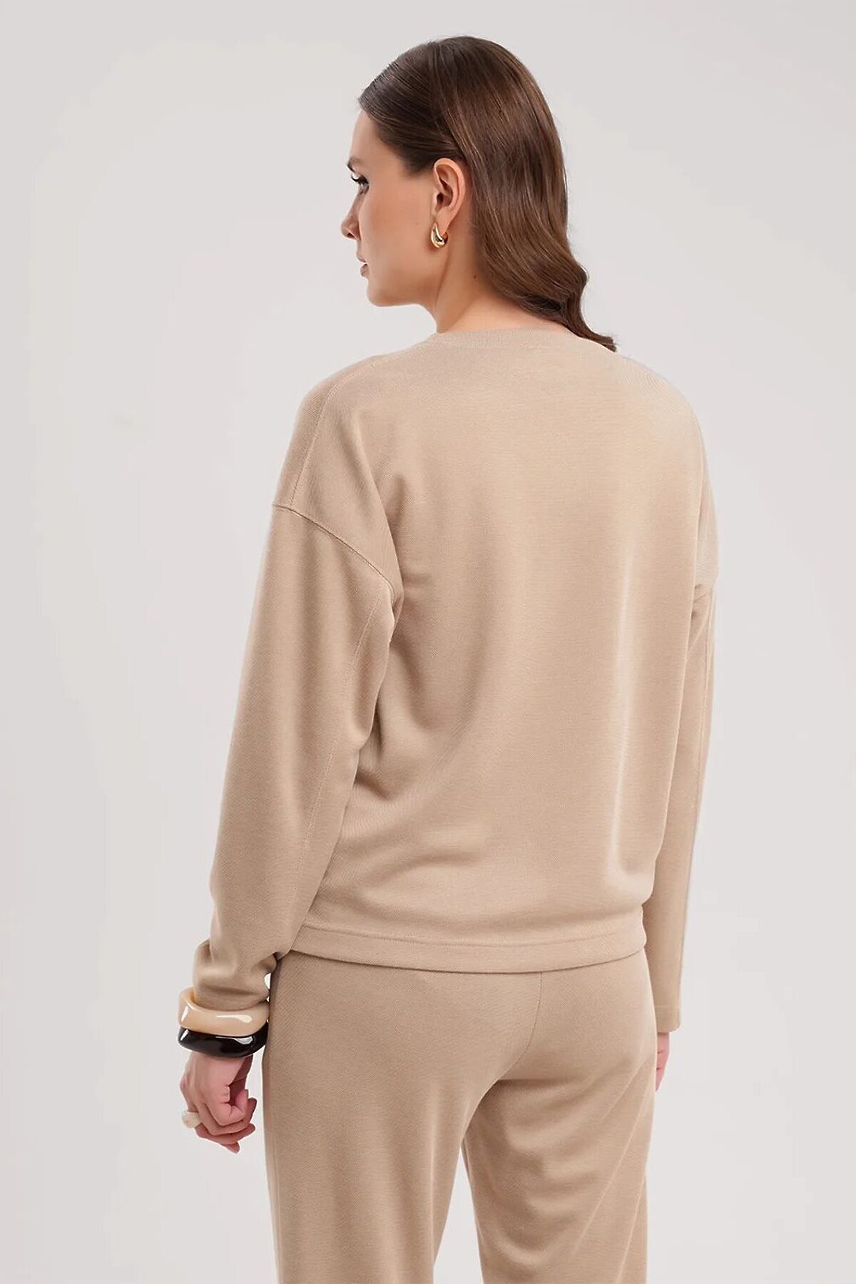 Джемпер объёмный из трикотажного полотна пике жаккард. Округлая горловина с обтачкой. По переду средний шов, нашивка. Длинный спущенный рукав, по рукаву резы. Средний шов, пройма и резы отстрочены.