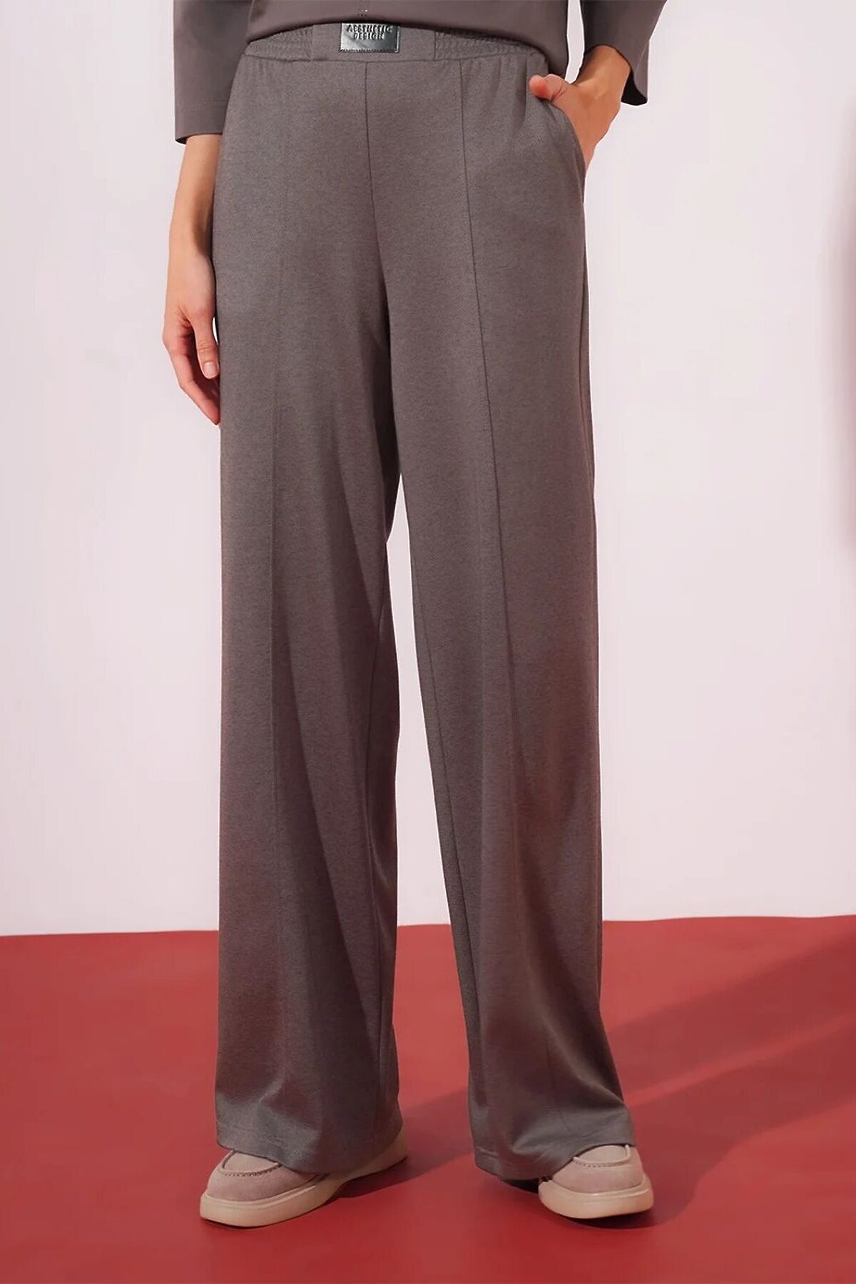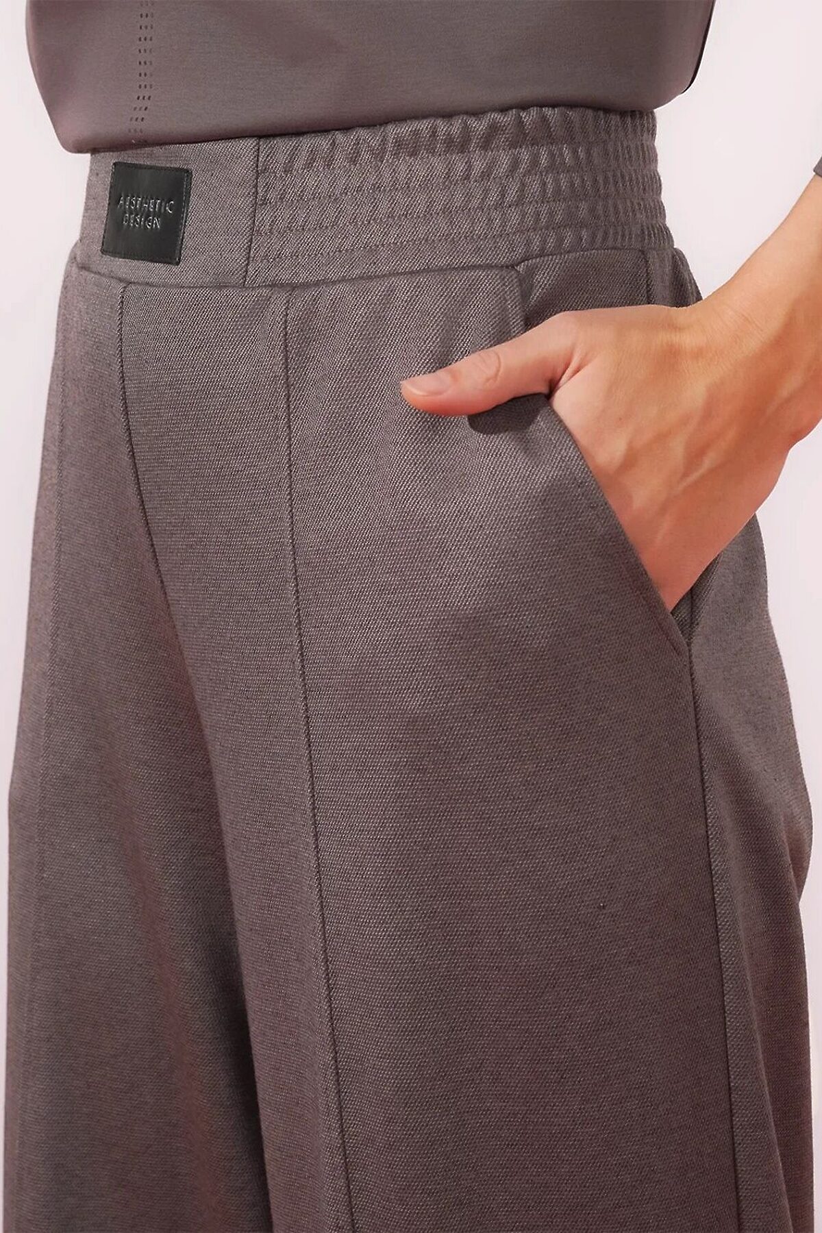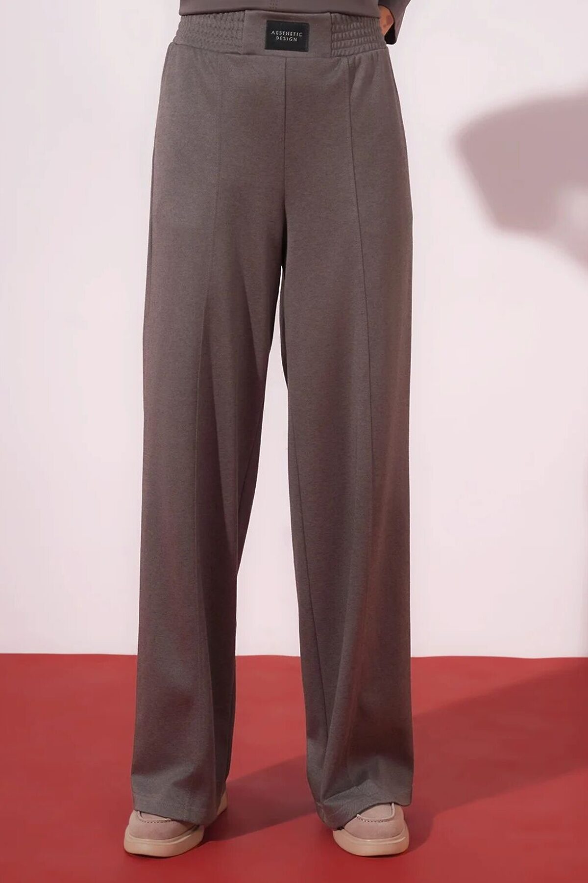 Брюки из трикотажного полотна джинс-трикотаж, широкие. По талии притачной пояс на внутренней резинке, спереди нашивка. По переду застроченные резы. Боковые карманы с отрезным бочком.