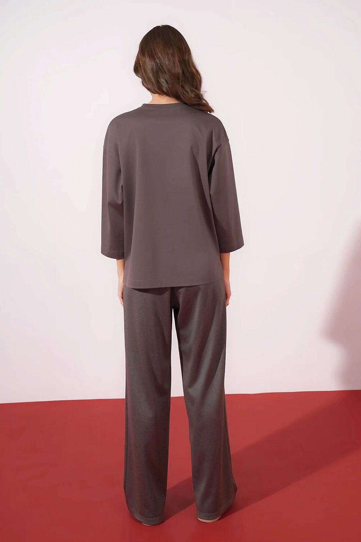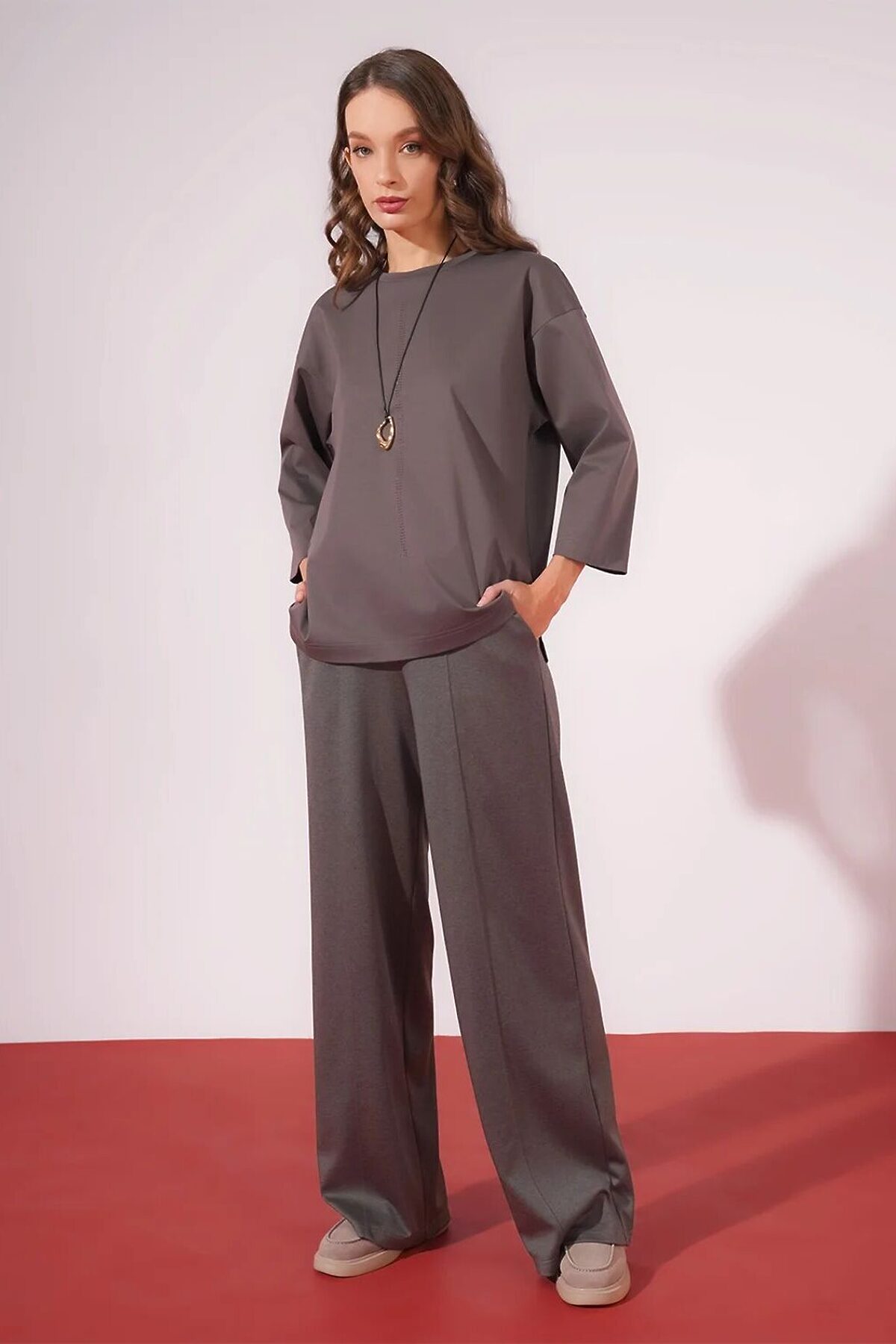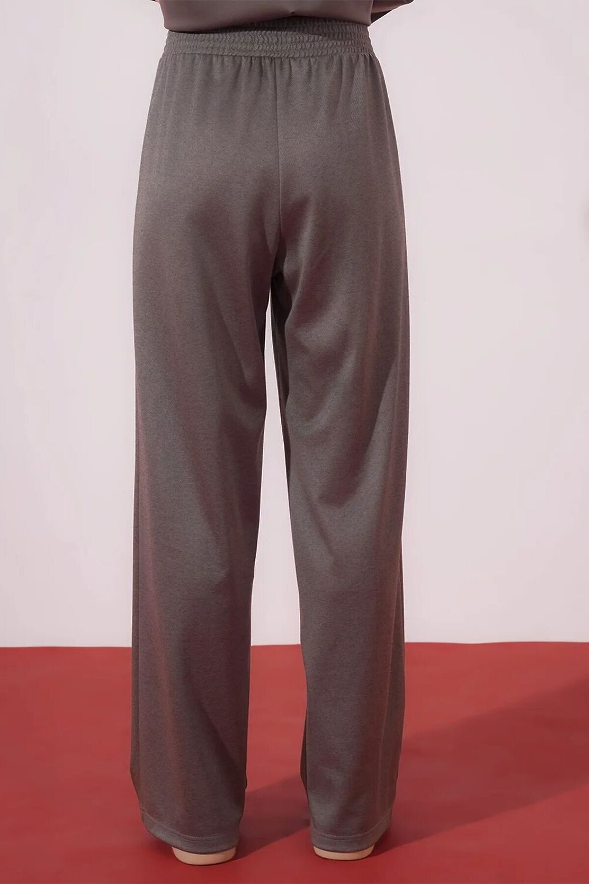 Брюки из трикотажного полотна джинс-трикотаж, широкие. По талии притачной пояс на внутренней резинке, спереди нашивка. По переду застроченные резы. Боковые карманы с отрезным бочком.