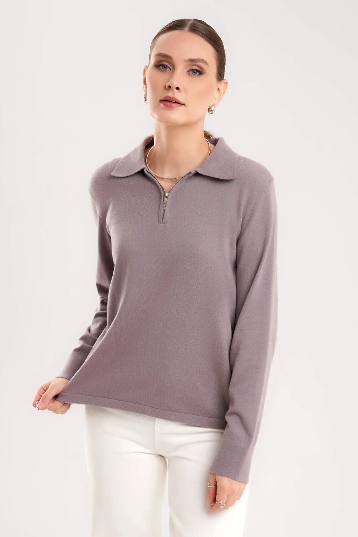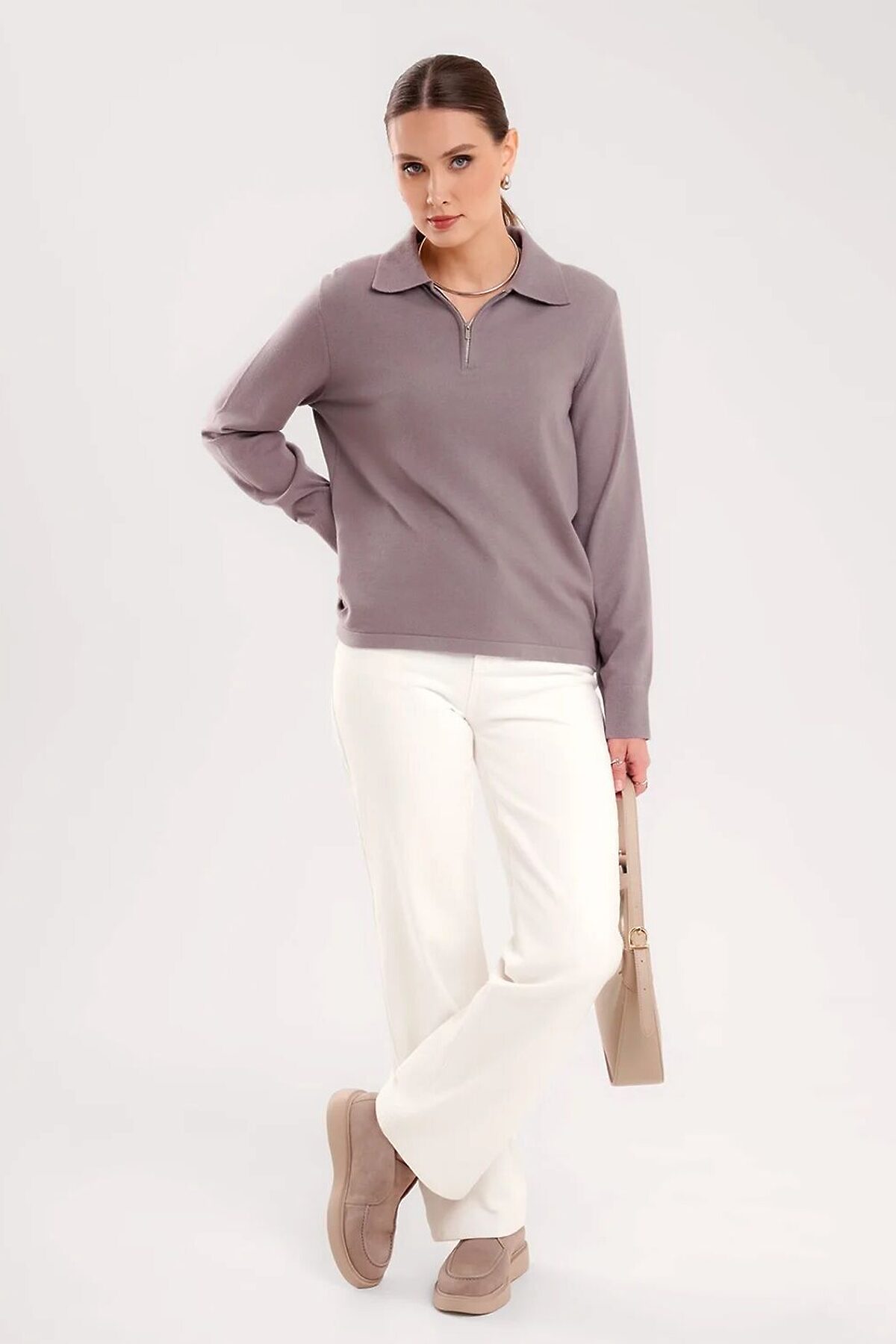 Джемпер из трикотажного полотна джинс-трикотаж, свободного кроя. Длинный рукав со спущенной линией плеча. Округлая горловина с обтачкой. Спереди карман листочка с молнией и шнуром из окантовки. По низу рукава, изделия широкий манжет. Боковые разрезы.