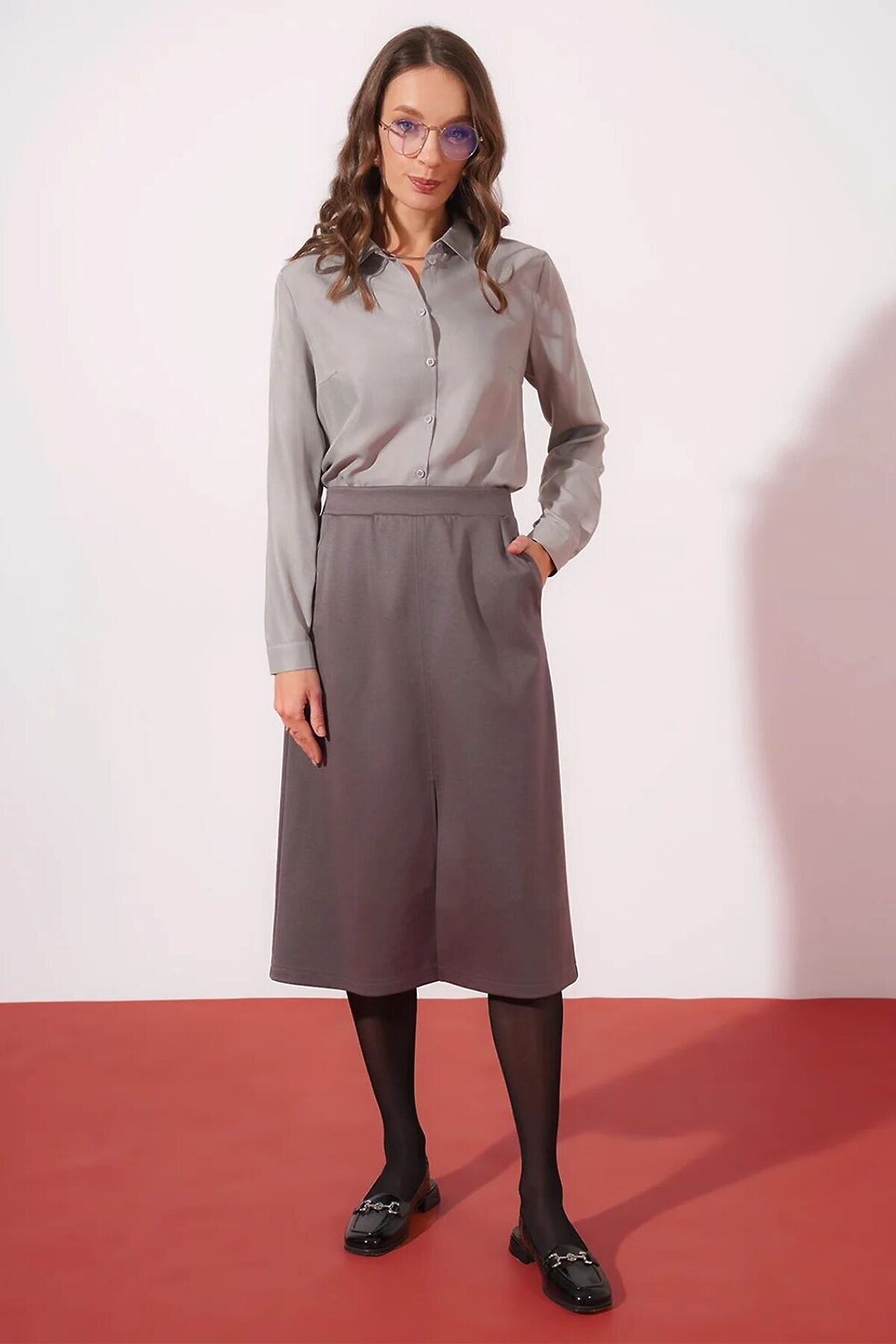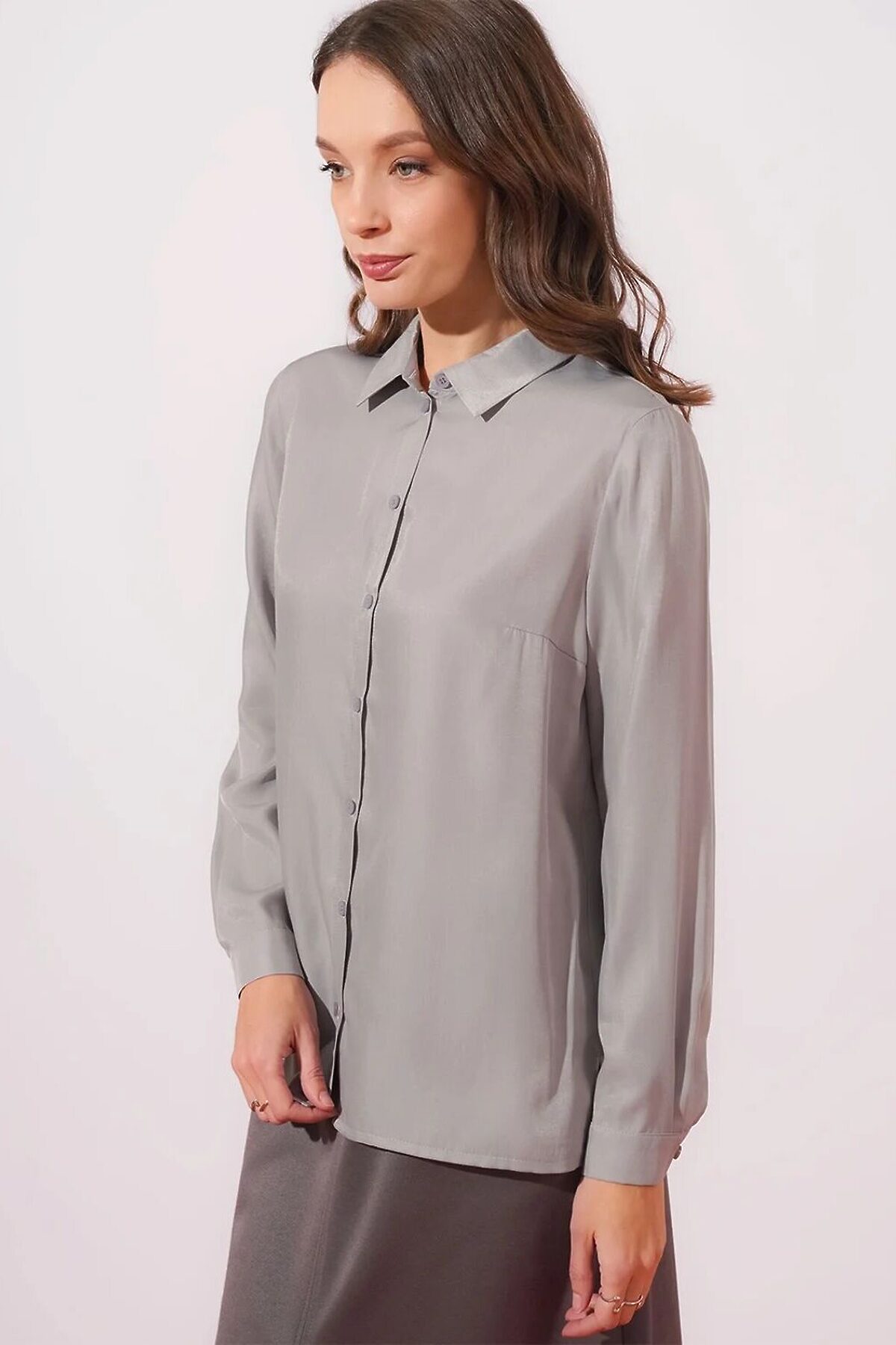 Блузка среднего объема из текстильного полотна штапель. Отложной воротник со стойкой. Цельнокроеная планка с застежкой на пуговицы. Втачной длинный рукав, внизу притачной манжет с застежкой на пуговицу. Низ прямой, по бокам разрезы.