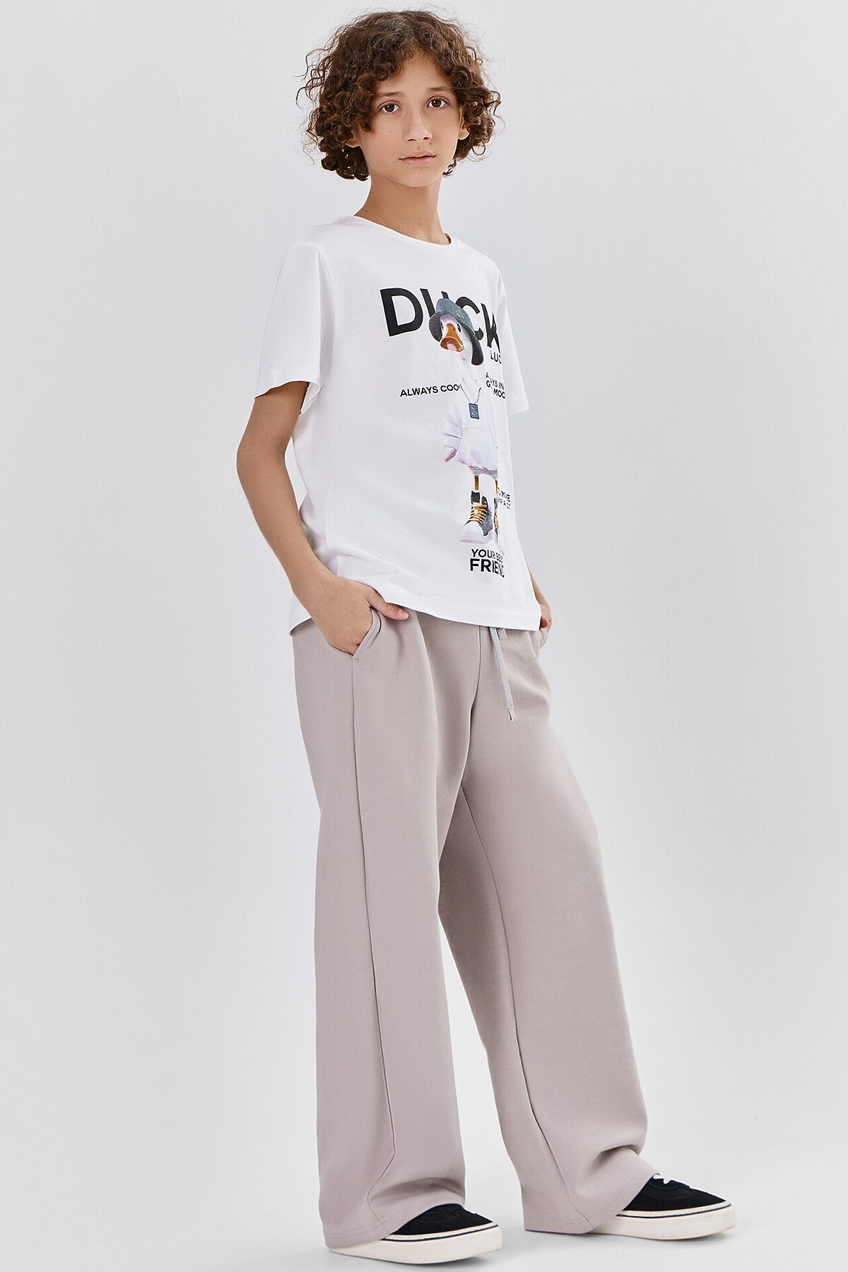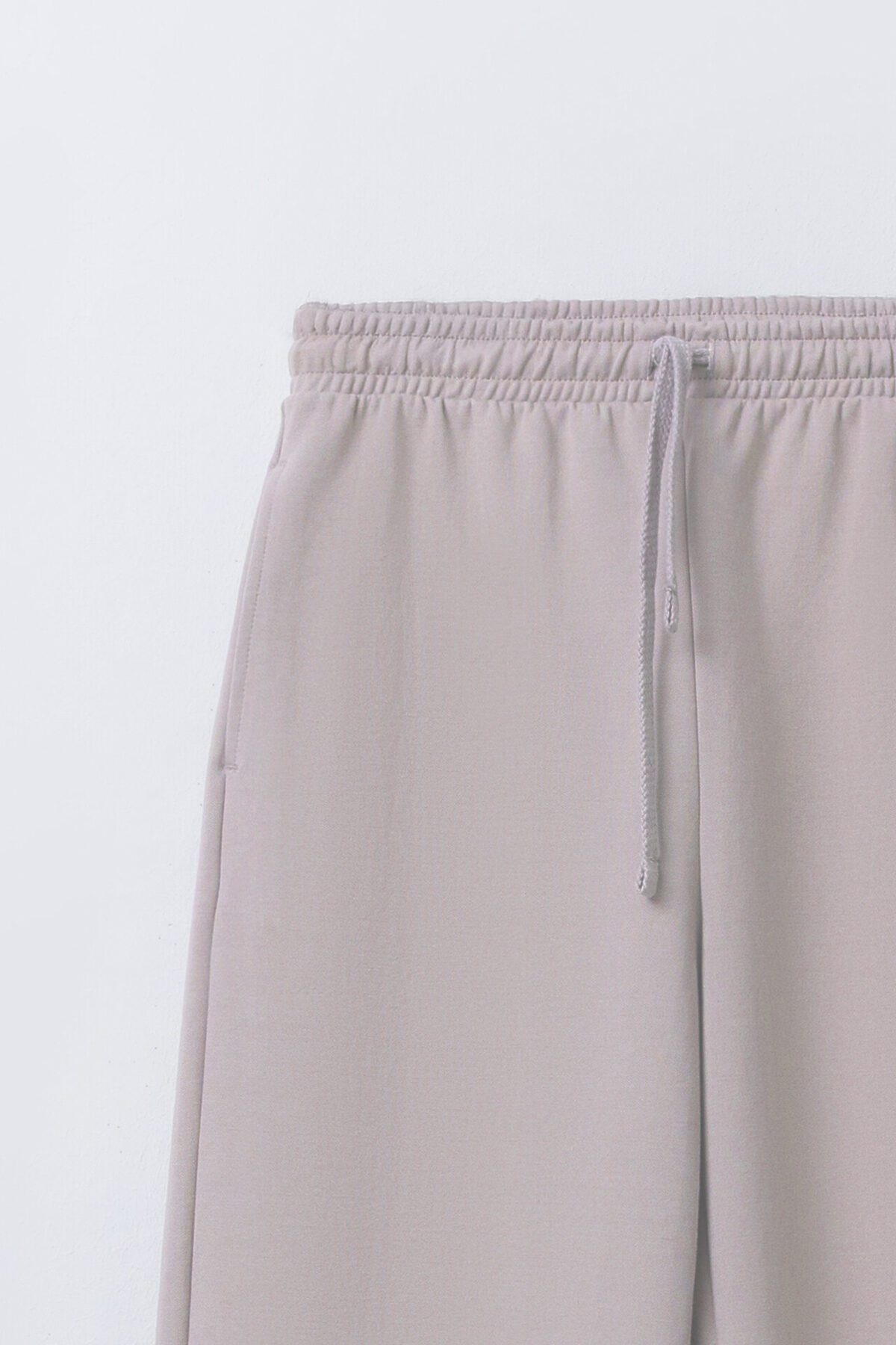 Брюки прямые свободные, посадка средняя. Пояс отрезной, с эластичной тесьмой внутри (внутренняя 40мм 40RV). С внешней стороны пробиты петли и вставлен шнур 10PX-2. В боковых швах обработаны карманы. Нижний срез брюк обработан швом вподгибку.