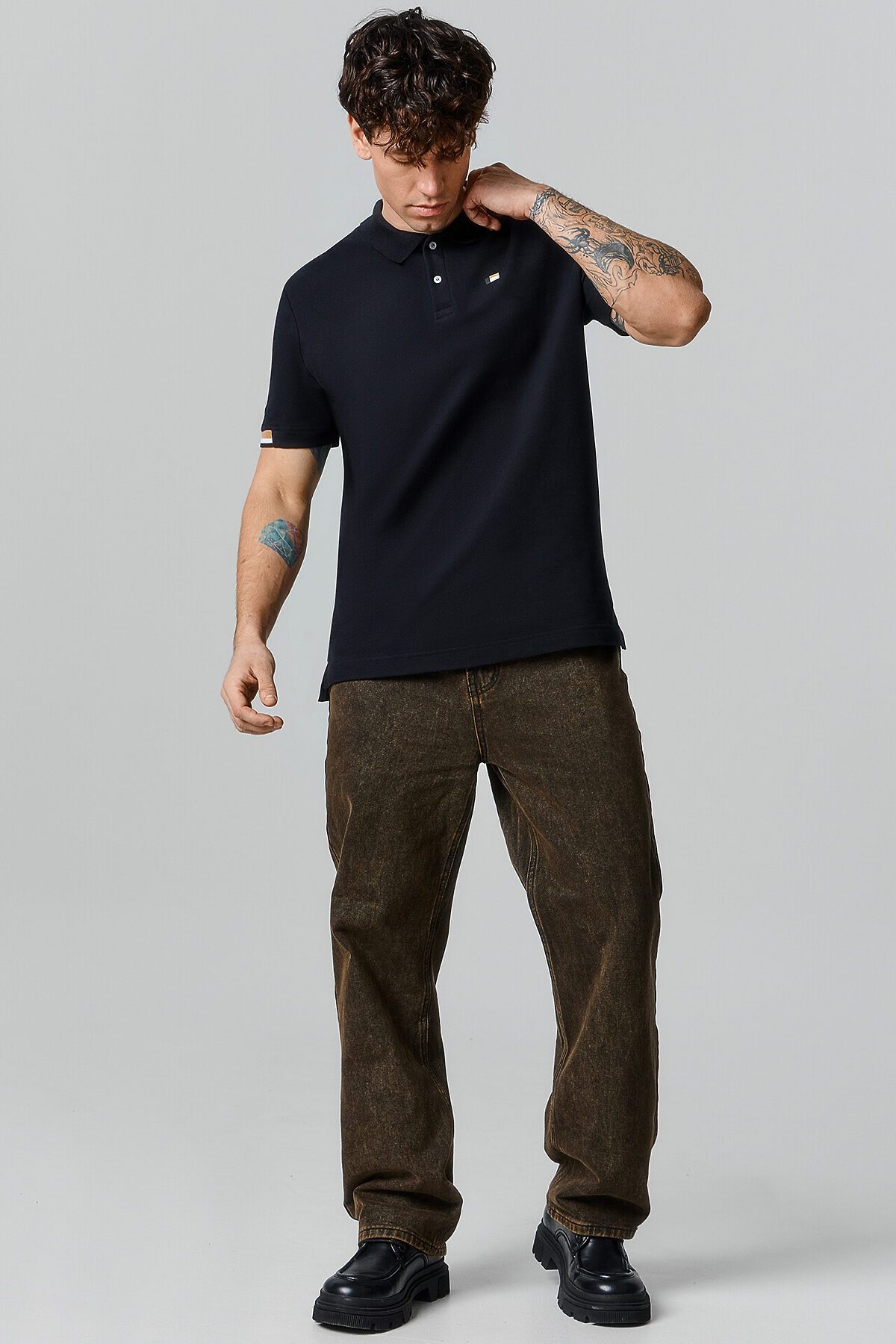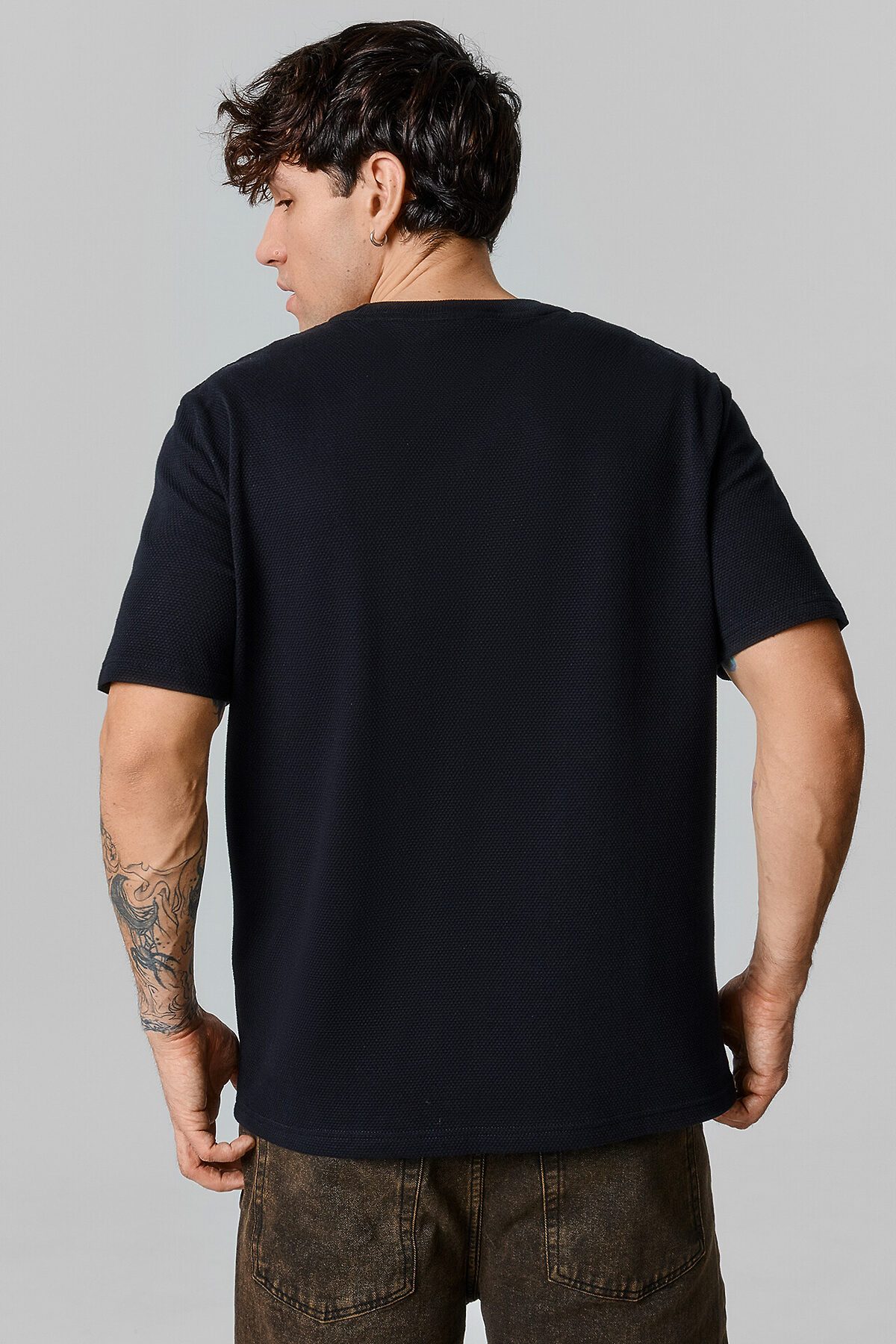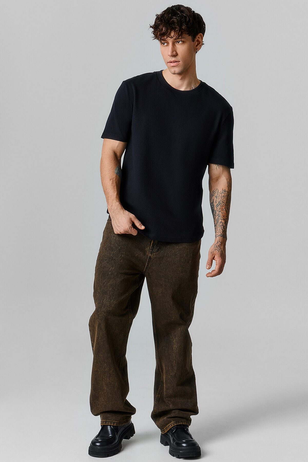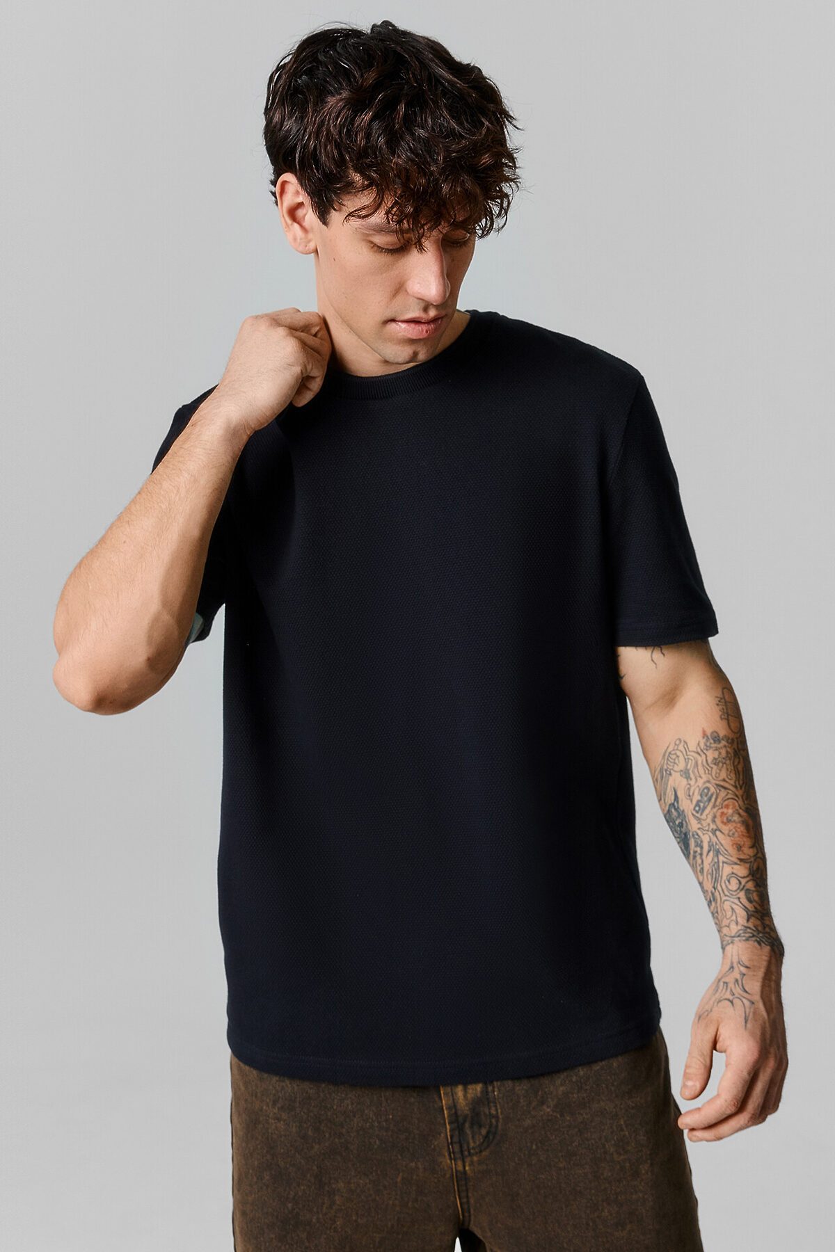 Футболка свободного силуэта из фактурной кулирки. Рукава короткие втачные. Обтачка горловины из довяза арт. DOC-30/001-5/5. Шов обтачивания горловины по спинке закрыт бейкой из основного полотна 10мм. Нижний срез футболки и рукавов обработан швом в подгибку на 2х игольной плоскошовной машине.
