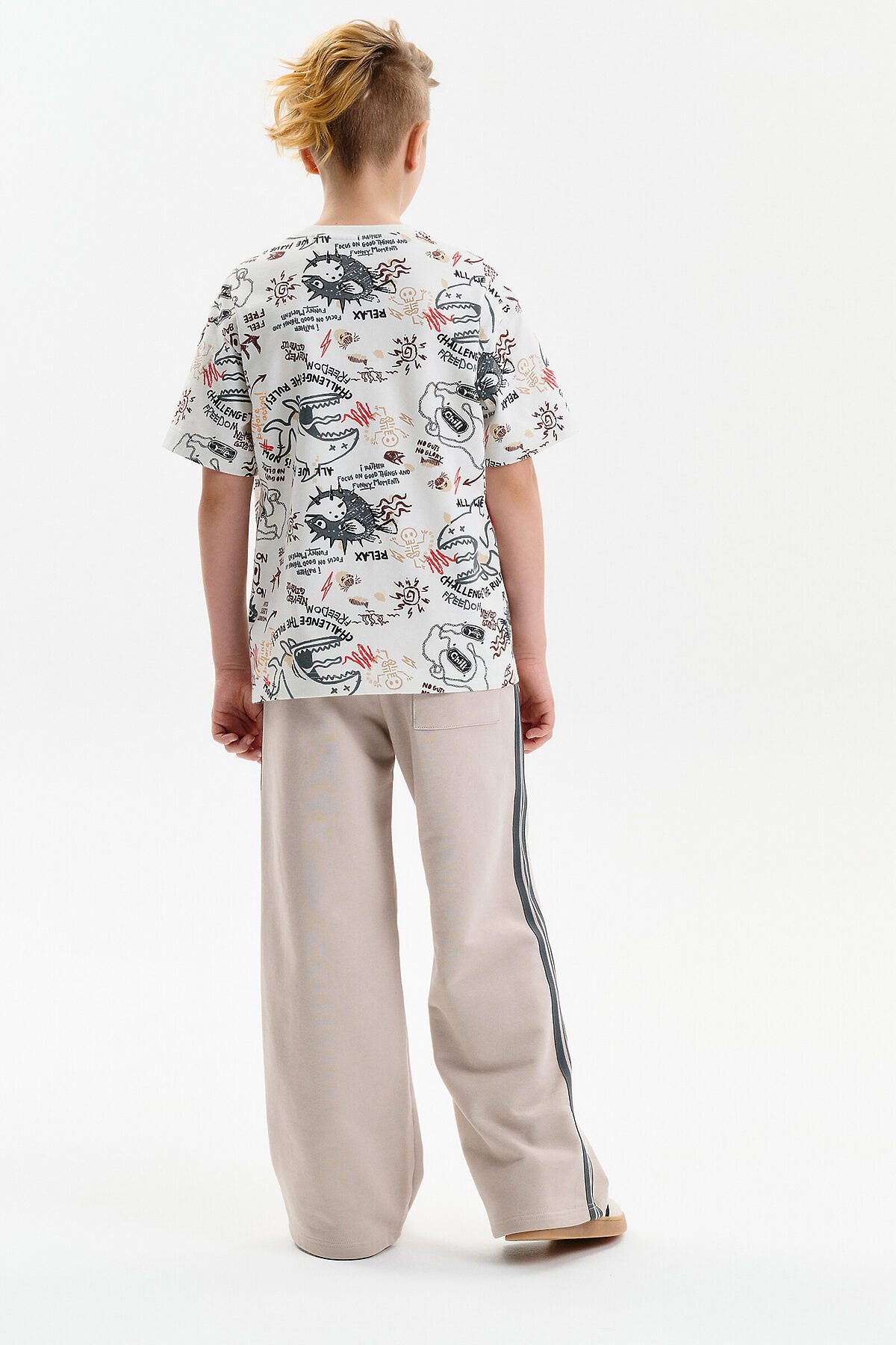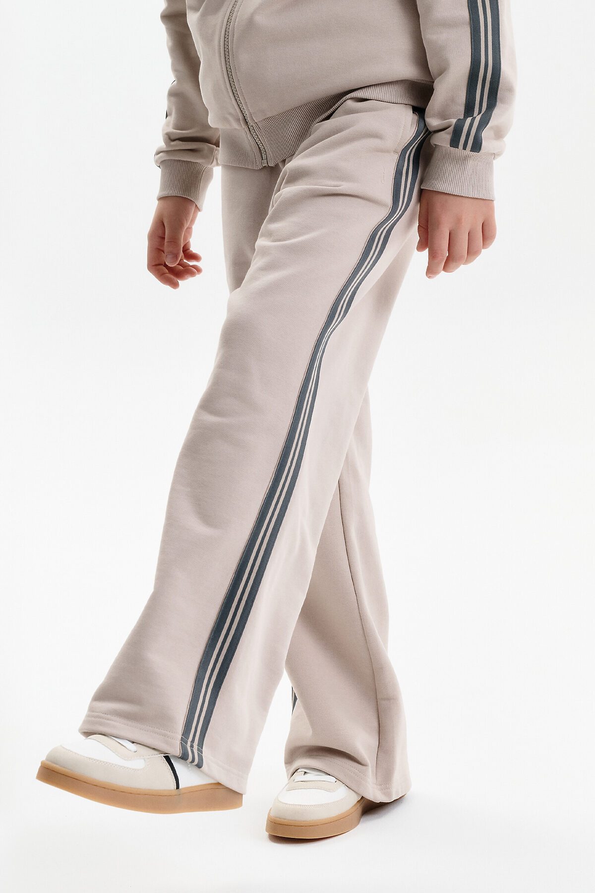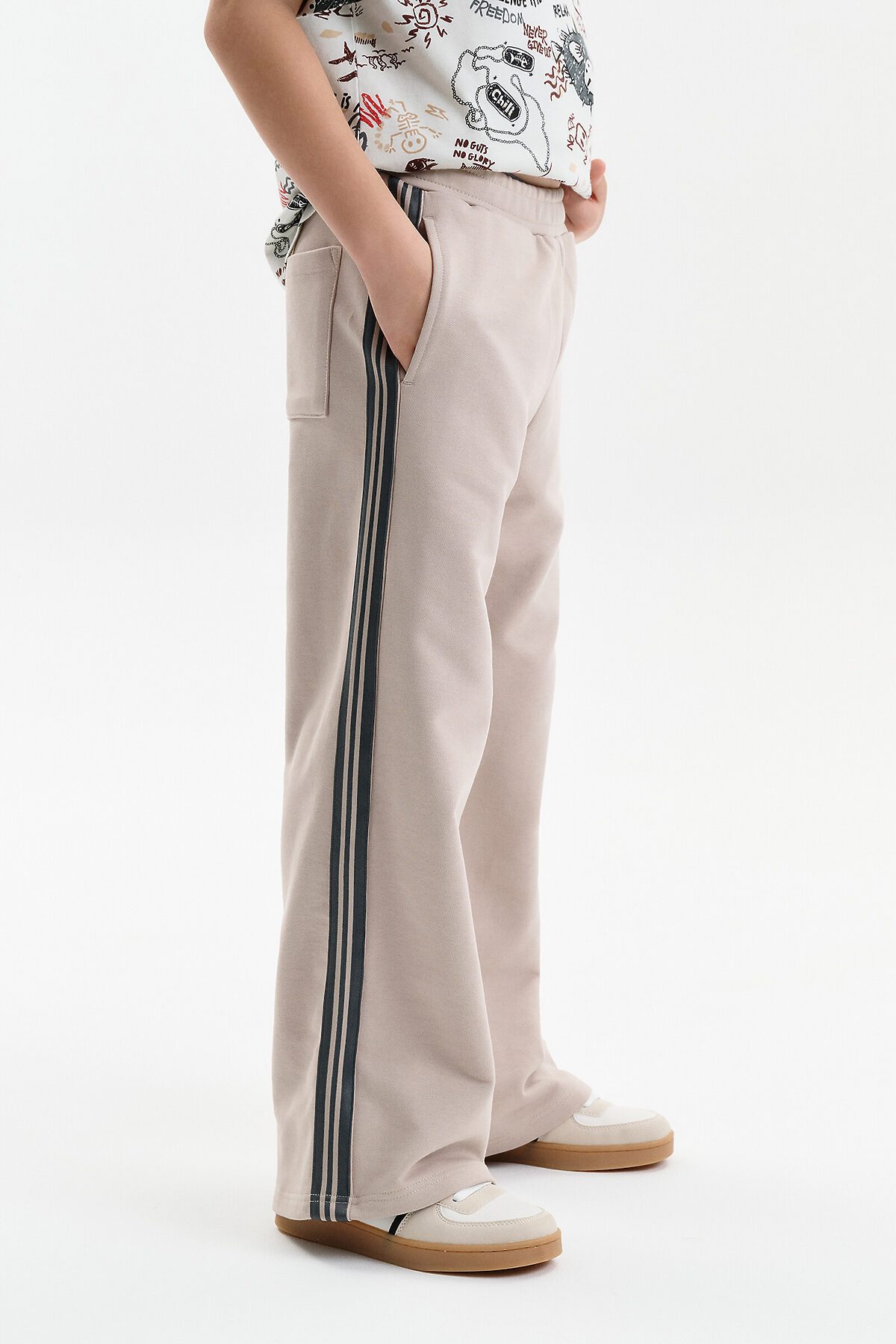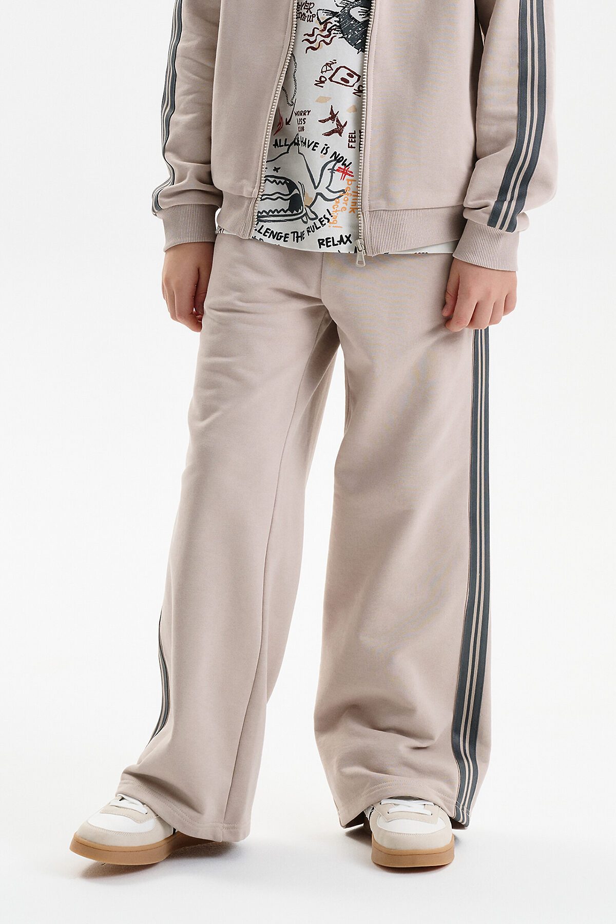 Широкие прямые брюки для мальчика из футера плотностью 350 гр/кв.м. Карманы в боковых швах. На задней половинке брюк справа накладной карман. Пояс из основной ткани, внутри широкий эластик, прострочен двумя строчками. В поясе внутренняя утяжка на шнурок. По бокам трикотажные лампасы.