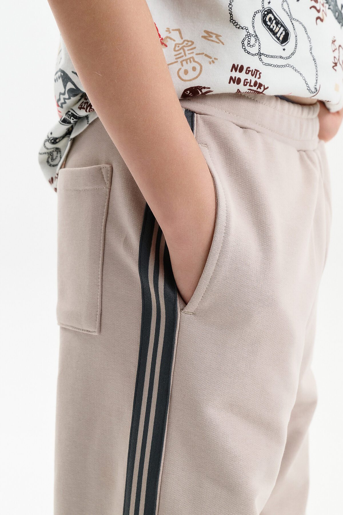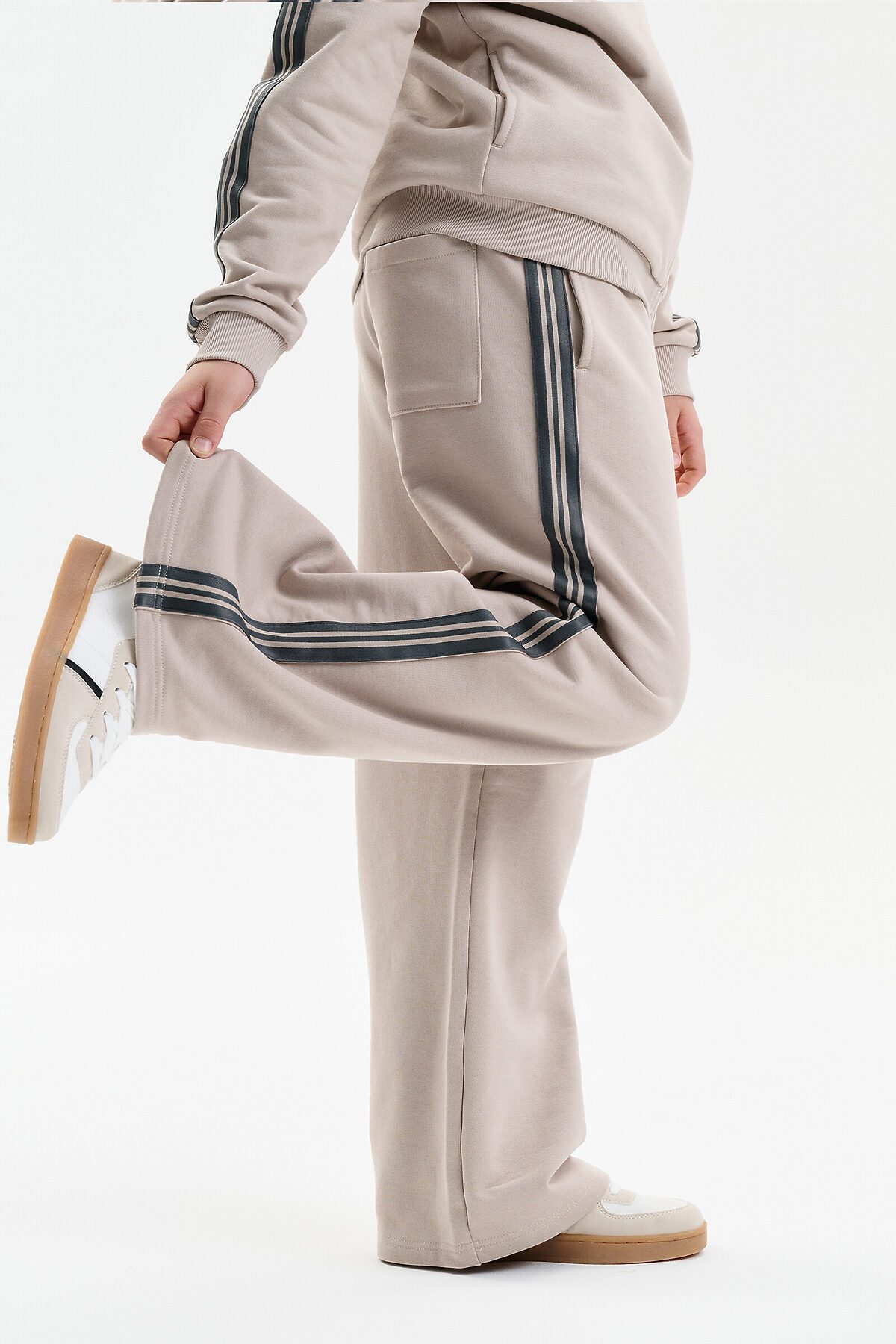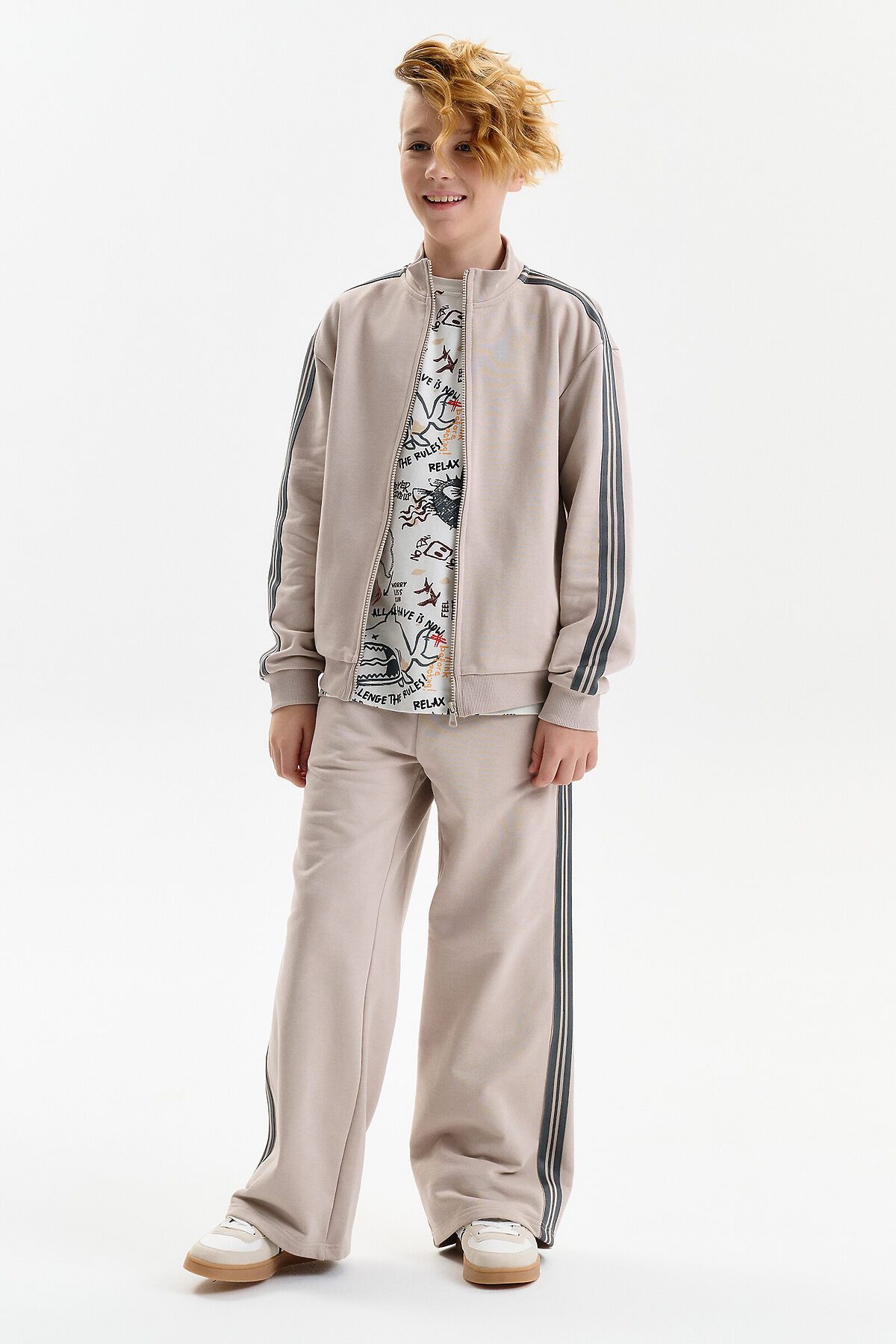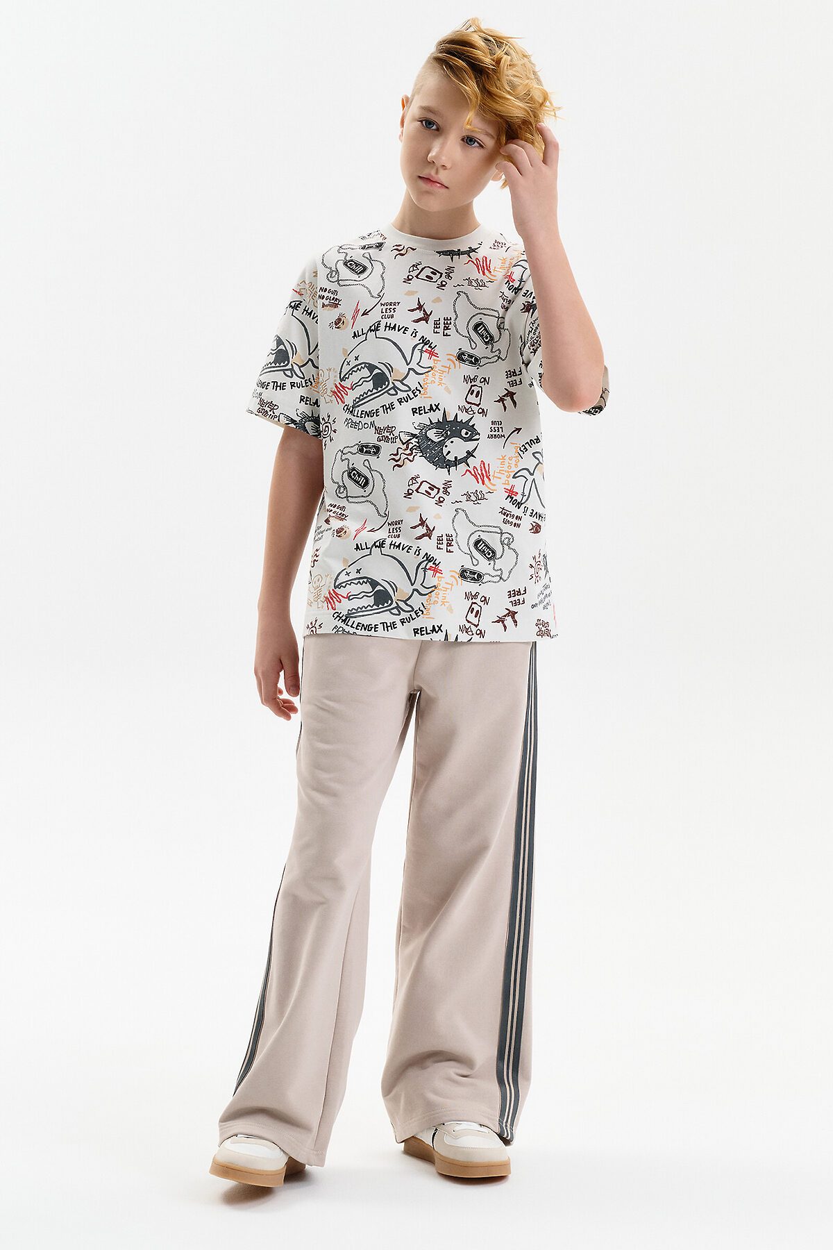 Широкие прямые брюки для мальчика из футера плотностью 350 гр/кв.м. Карманы в боковых швах. На задней половинке брюк справа накладной карман. Пояс из основной ткани, внутри широкий эластик, прострочен двумя строчками. В поясе внутренняя утяжка на шнурок. По бокам трикотажные лампасы.