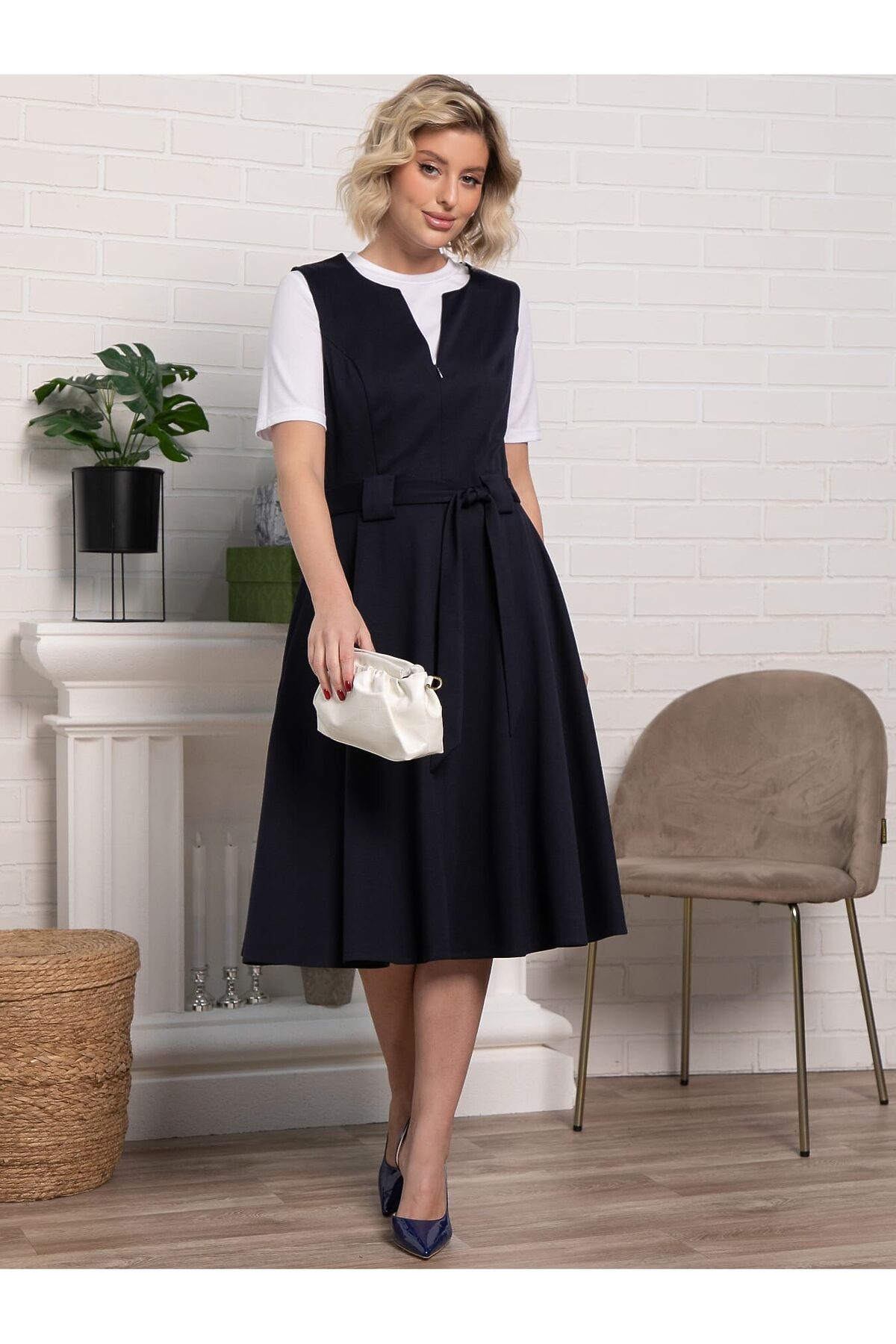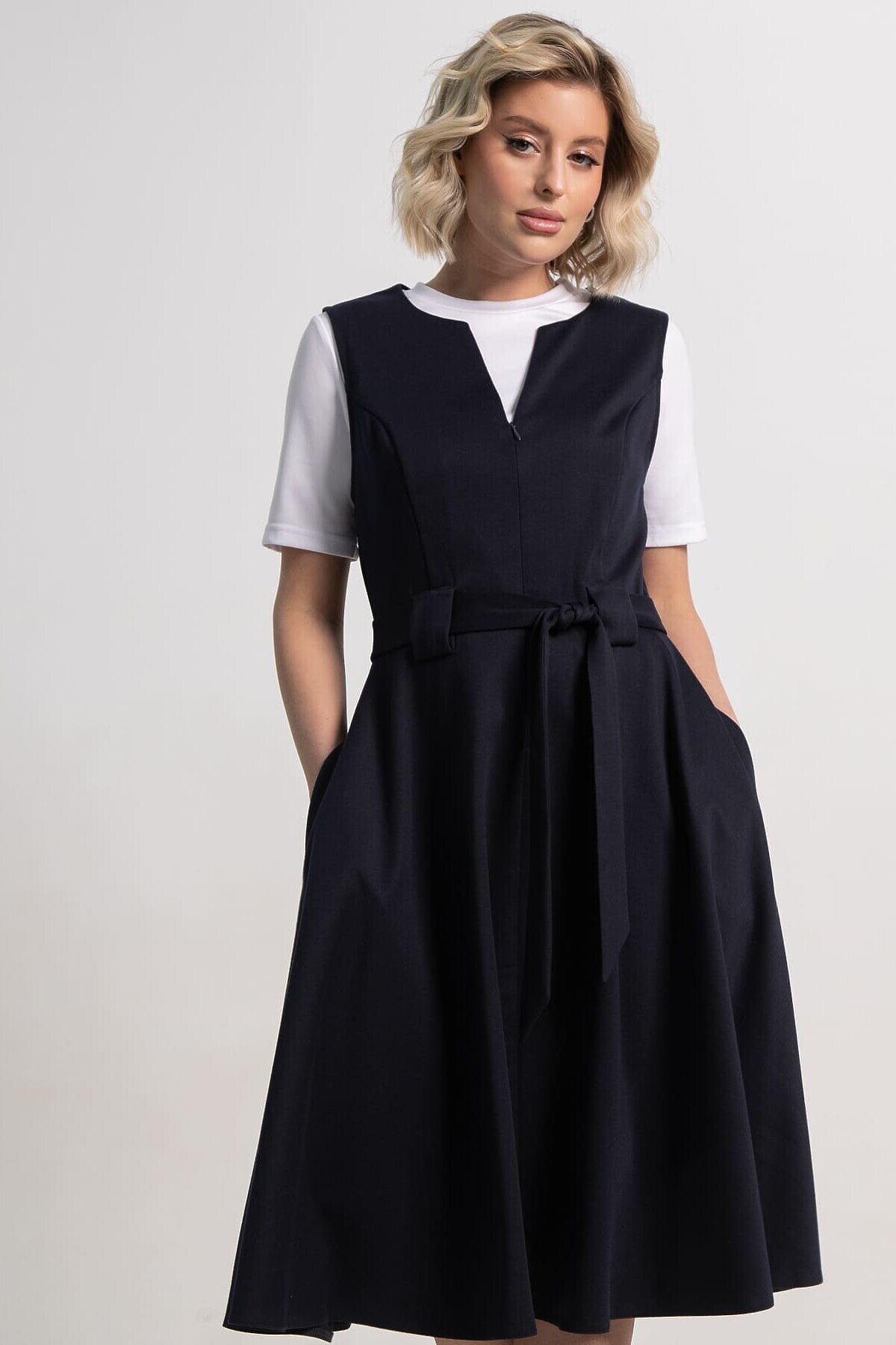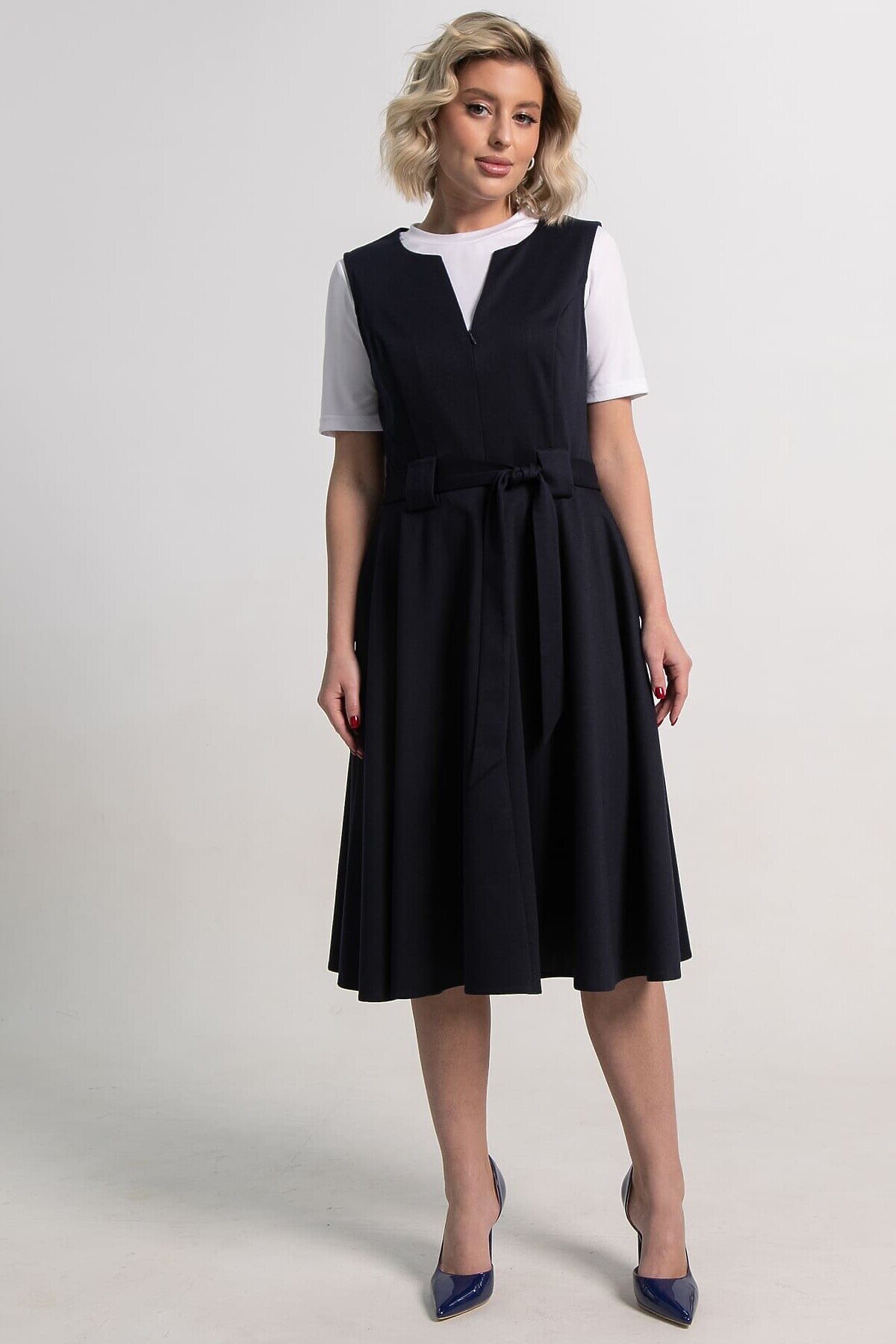 Бережная стирка при 30 градусах. Платье без подкладки! Женское платье — универсальная модель, которая станет базой для стильного делового гардероба. Этот свободный сарафан миди длины до колена выполнен в классическом А-силуэте и V-образным вырезом, что визуально вытягивает силуэт и делает образ более женственным и элегантным. Благодаря широким бретелям сарафан удобно носить с блузкой, водолазкой или рубашкой, создавая строгий и деловой стиль для офиса, учебы или официальных мероприятий. Это платье без рукавов — удачный выбор для тех, кто ценит классический стиль, удобство и универсальность. Оно подчеркнет ваш строгий и элегантный образ, станет незаменимой частью офисного или школьного дресс-кода и позволит выглядеть стильно каждый день.