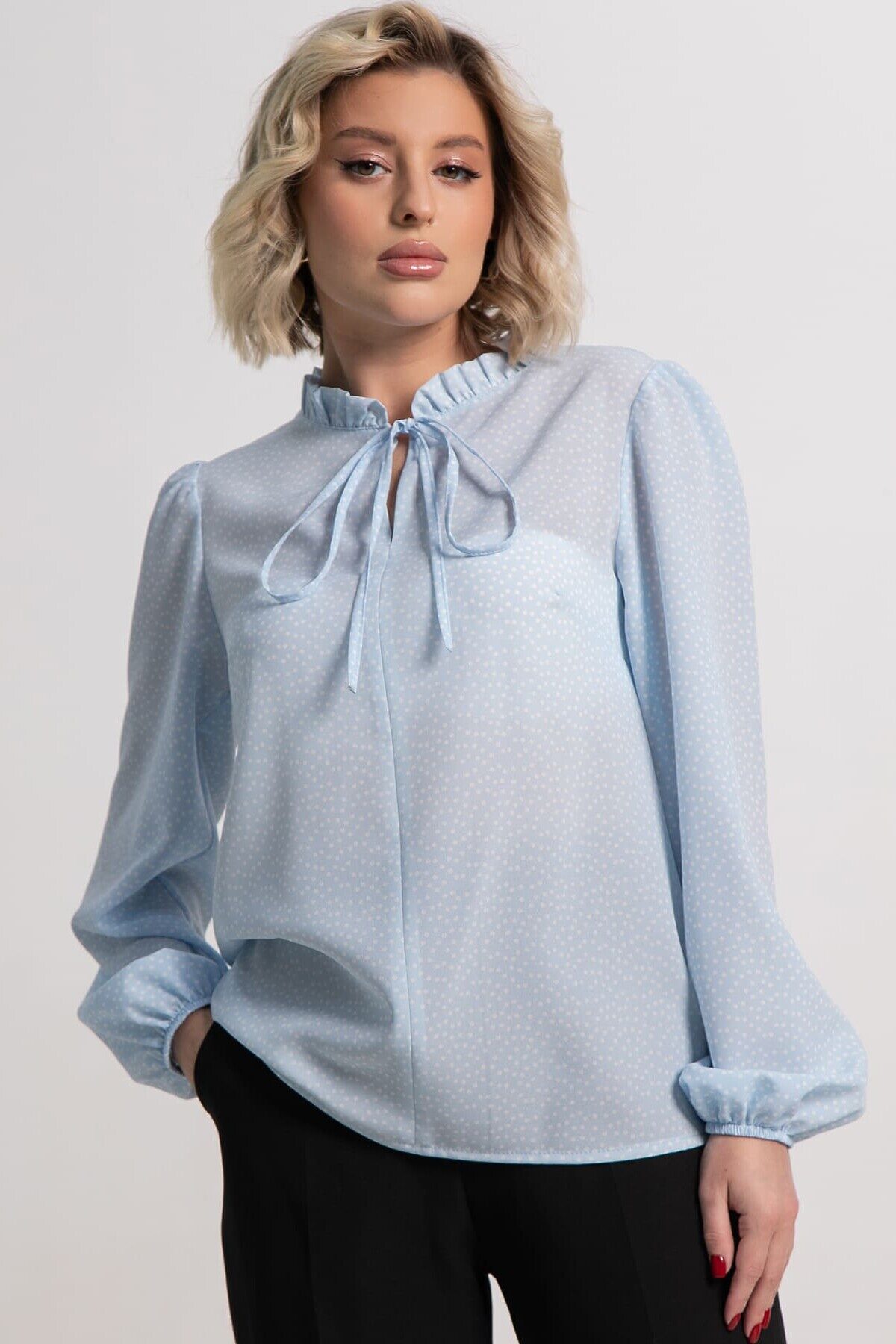 Стильная блузка с завязкой у горловины — элегантный акцент в вашем образе. Модель выполнена в прямом крое с рукавами полной длины, что обеспечивает комфорт. Сборка по окату рукава придает изящность, а низ, собранный на резинку, создает аккуратный силуэт. Горловина украшена рюшей, которая плавно переходит в завязку, подчеркивая женственность и утонченность. Эта блузка отлично сочетается с брюками, юбками, жилетами и пиджаками, становясь универсальной основой для для любого стиля.