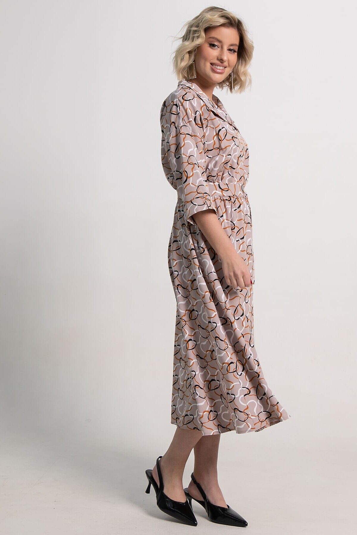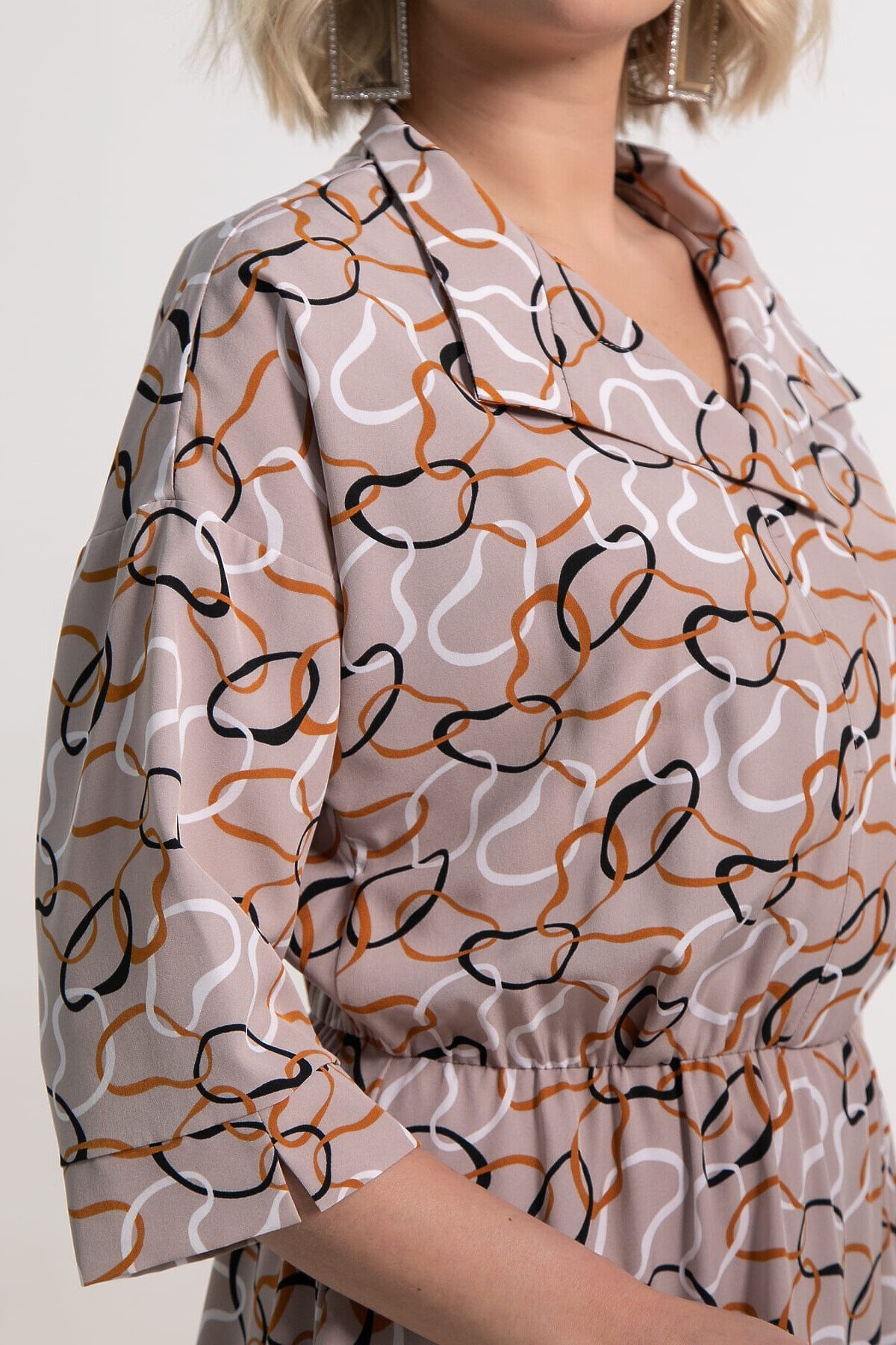 Представляем вам элегантное женское платье, которое отлично дополнит ваш гардероб. Бежевый фон, украшенный оригинальным абстрактным принтом, создает утонченный и современный образ. Воротник-стойка придает образу строгость и утонченность. Продуманные детали, такие как карманы в боковых швах юбки и резинка по талии, делают это платье не только функциональным, но и невероятно удобным. Идеально подходит для различных случаев – от повседневных прогулок и встреч с друзьями до более формальных мероприятий. Оно подчеркнёт вашу индивидуальность и поможет чувствовать себя уверенно и стильно в любой ситуации.