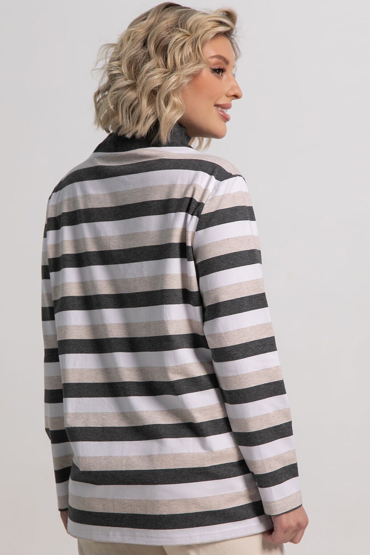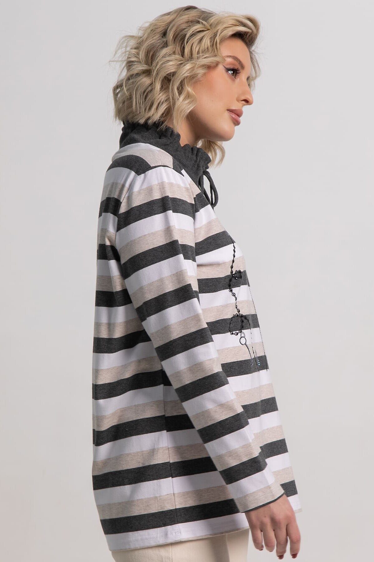 Эта блузка станет ярким акцентом вашего гардероба. Сочетание классической полоски с оригинальным принтом и удобного кроя делает ее идеальной для создания стильных и непринужденных образов. Втачной рукав полной длины. Воротник-хомут со шнурком. На передней части фотопечать со стразами.