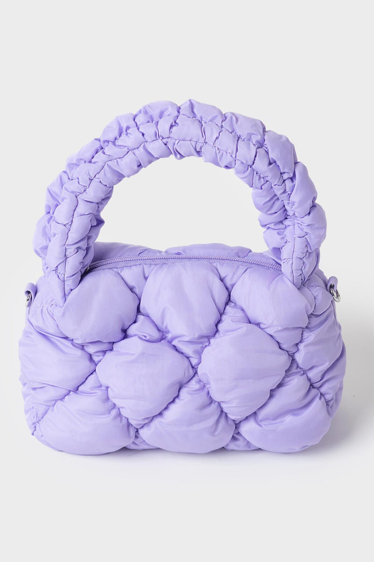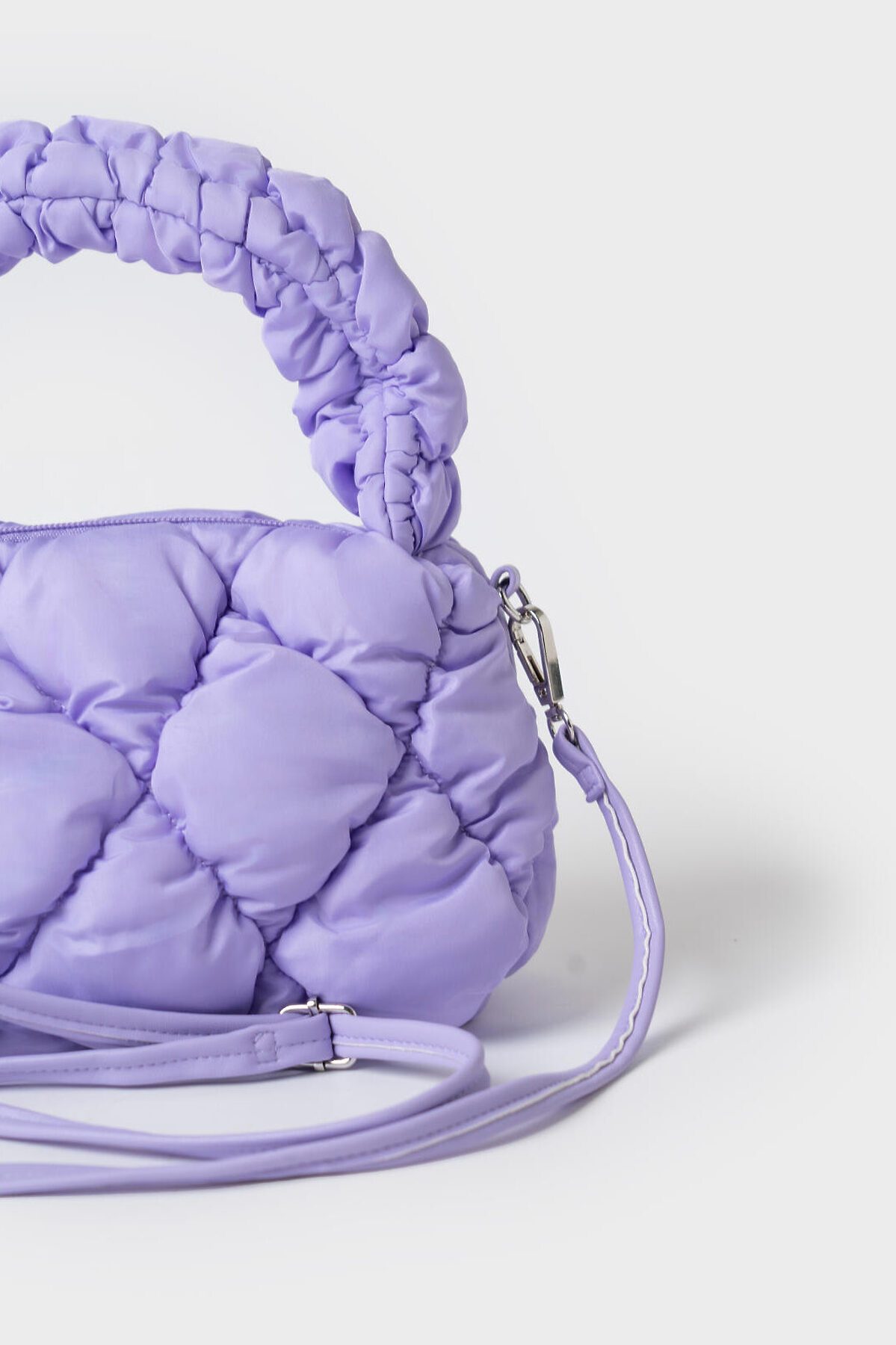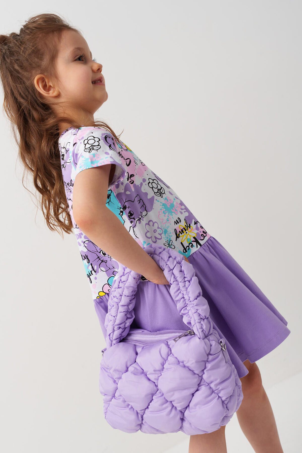 Дутая текстильная сумка кросс-боди для девочки. Сумка имеет регулируемый плечевой ремень. Основное отделение на молнии. Внутри есть два кармана. Один из них на молнии. Параметры: высота - 15 см, ширина -24 см, глубина - 9 см.