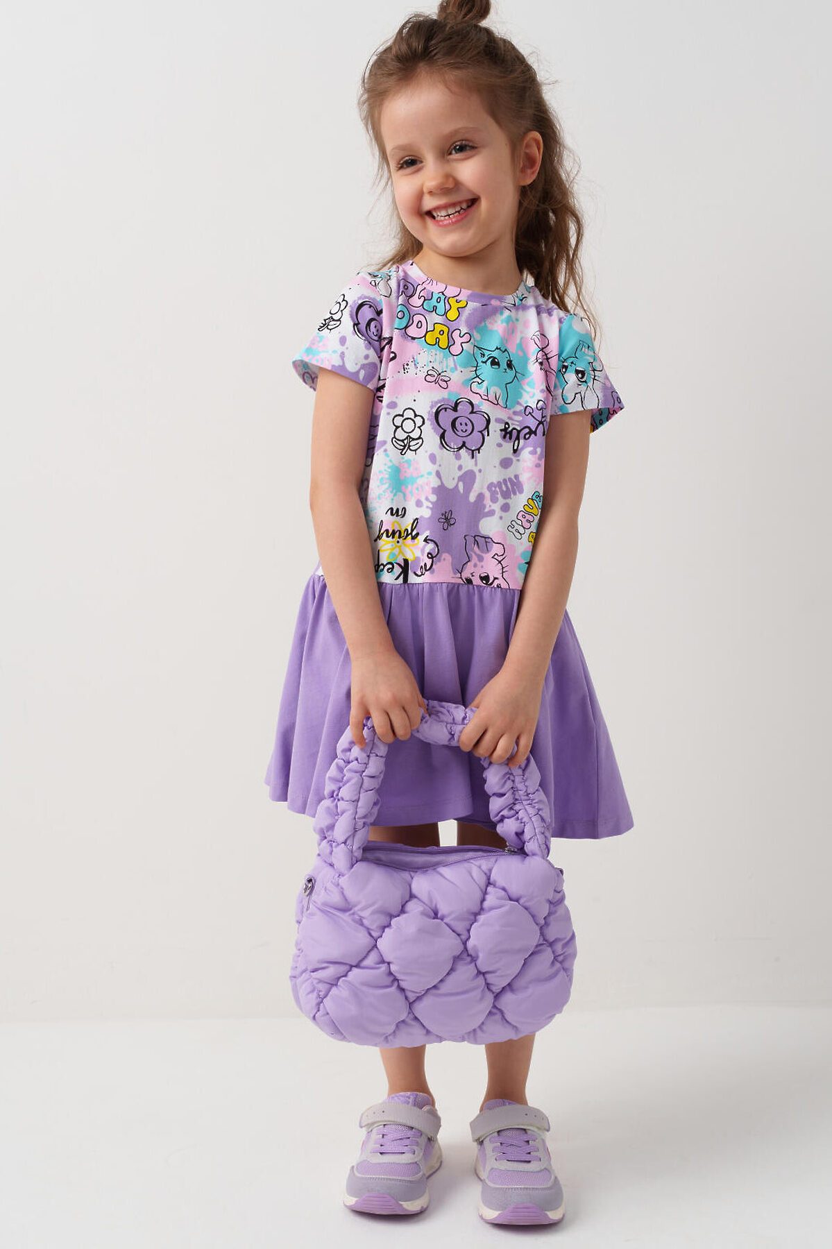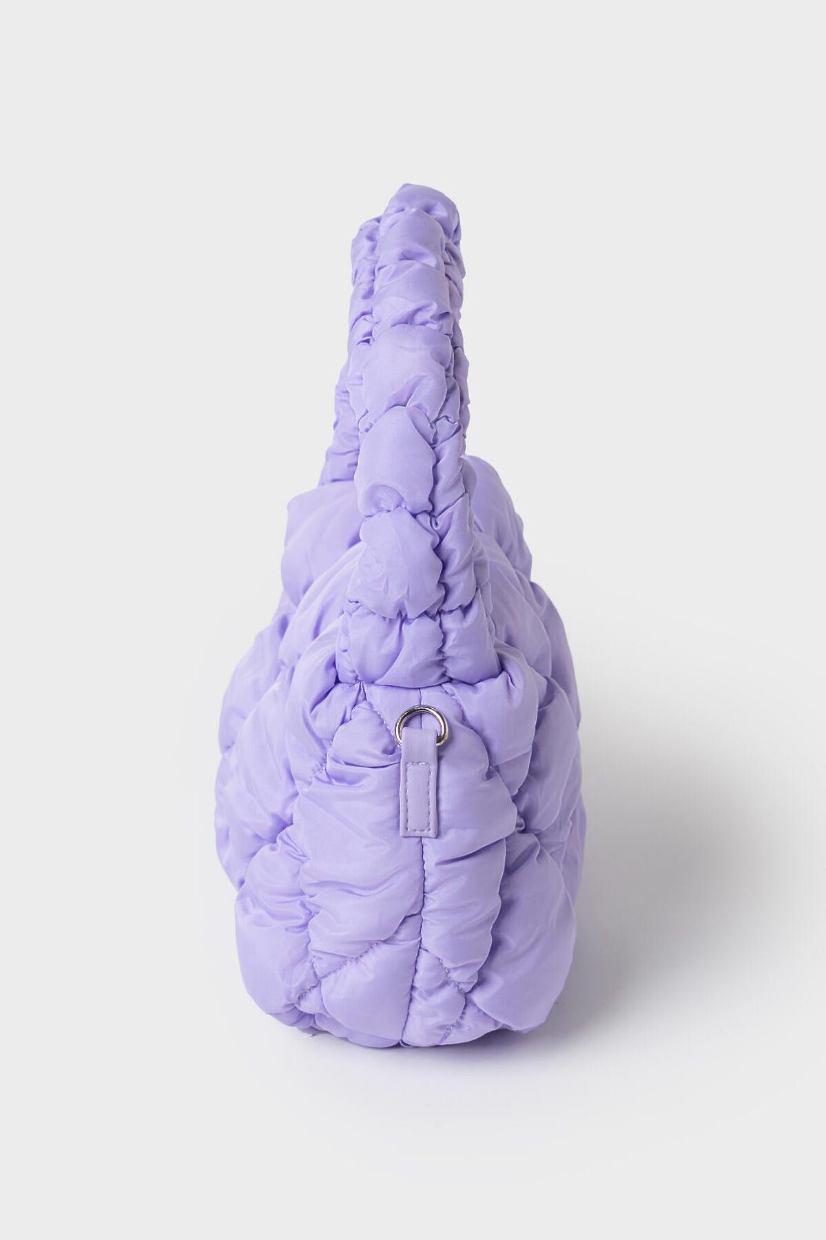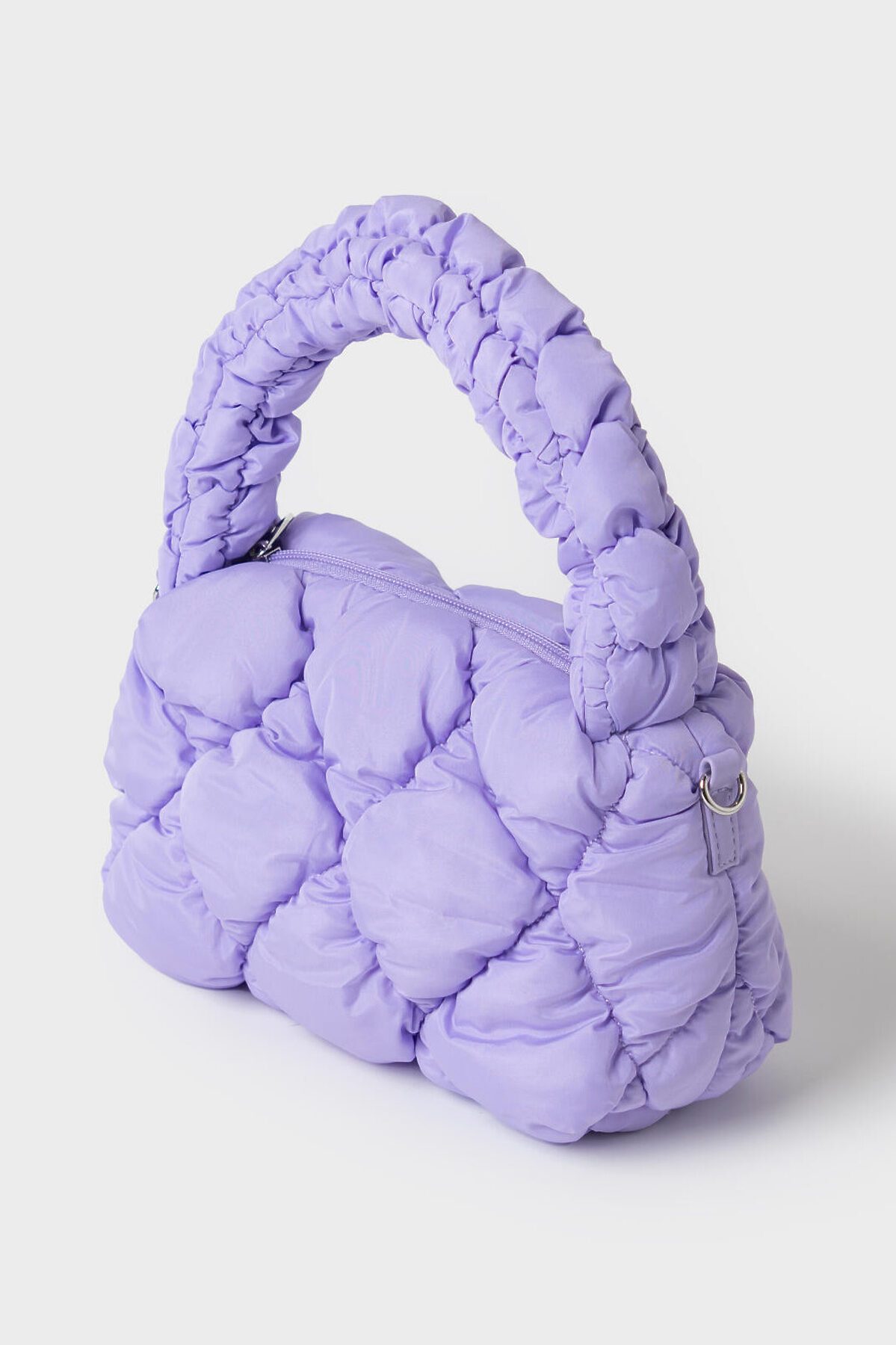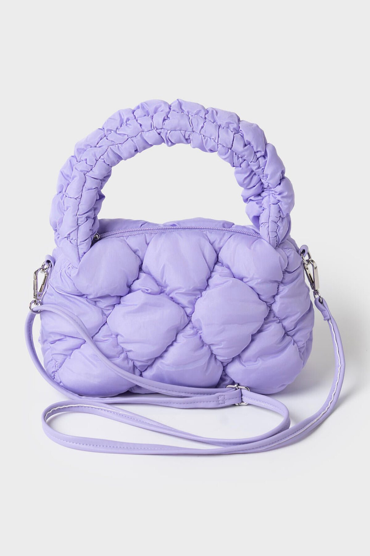 Дутая текстильная сумка кросс-боди для девочки. Сумка имеет регулируемый плечевой ремень. Основное отделение на молнии. Внутри есть два кармана. Один из них на молнии. Параметры: высота - 15 см, ширина -24 см, глубина - 9 см.