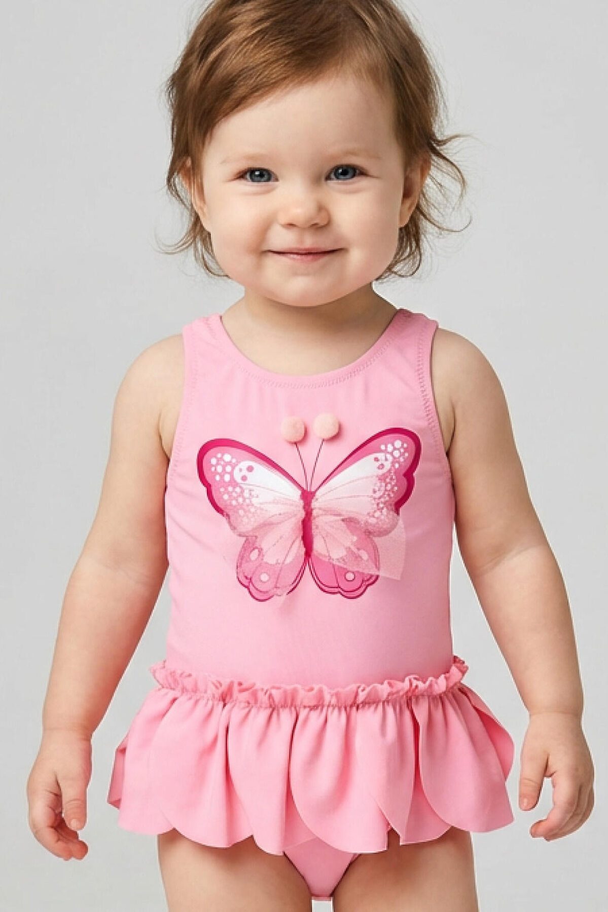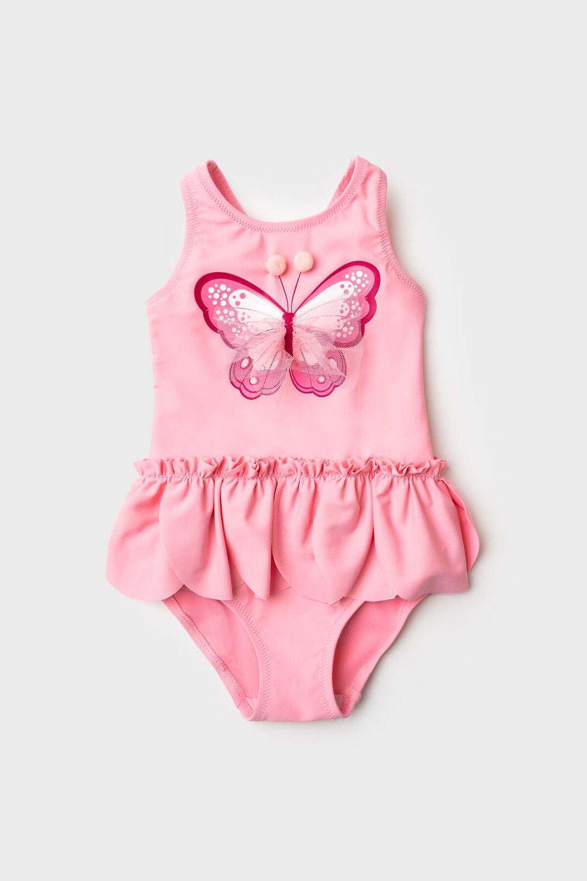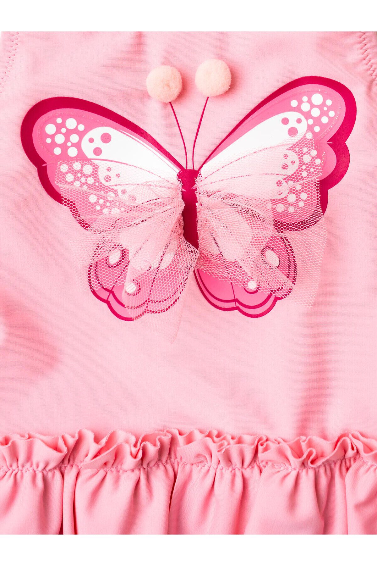 Детский слитный купальник для девочки. Выполнен в светло-розовом цвете с ярким принтом в виде бабочки. Украшен объёмными деталями и блёстками, что делает образ нарядным. По талии пришита декоративная юбочка из лепестков, создающая эффект воздушности. На спинке – контрастная вставка с милым бантиком. Все края обработаны эластичной тесьмой, чтобы изделие хорошо сидело на теле и не натирало. Благодаря UF-защите, ткань сохраняет первоначальный вид даже при длительном пребывании на солнце. Подходит для плавания и активного отдыха.