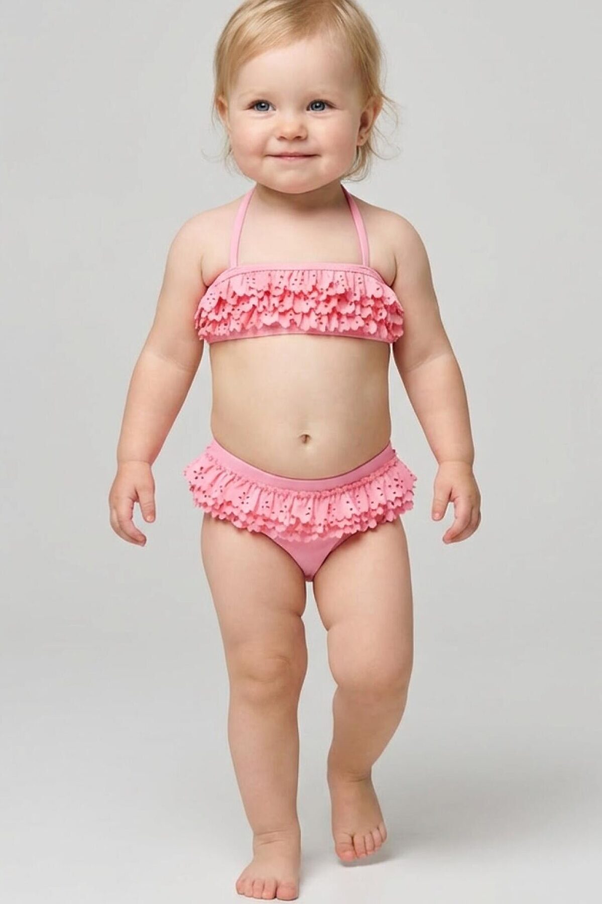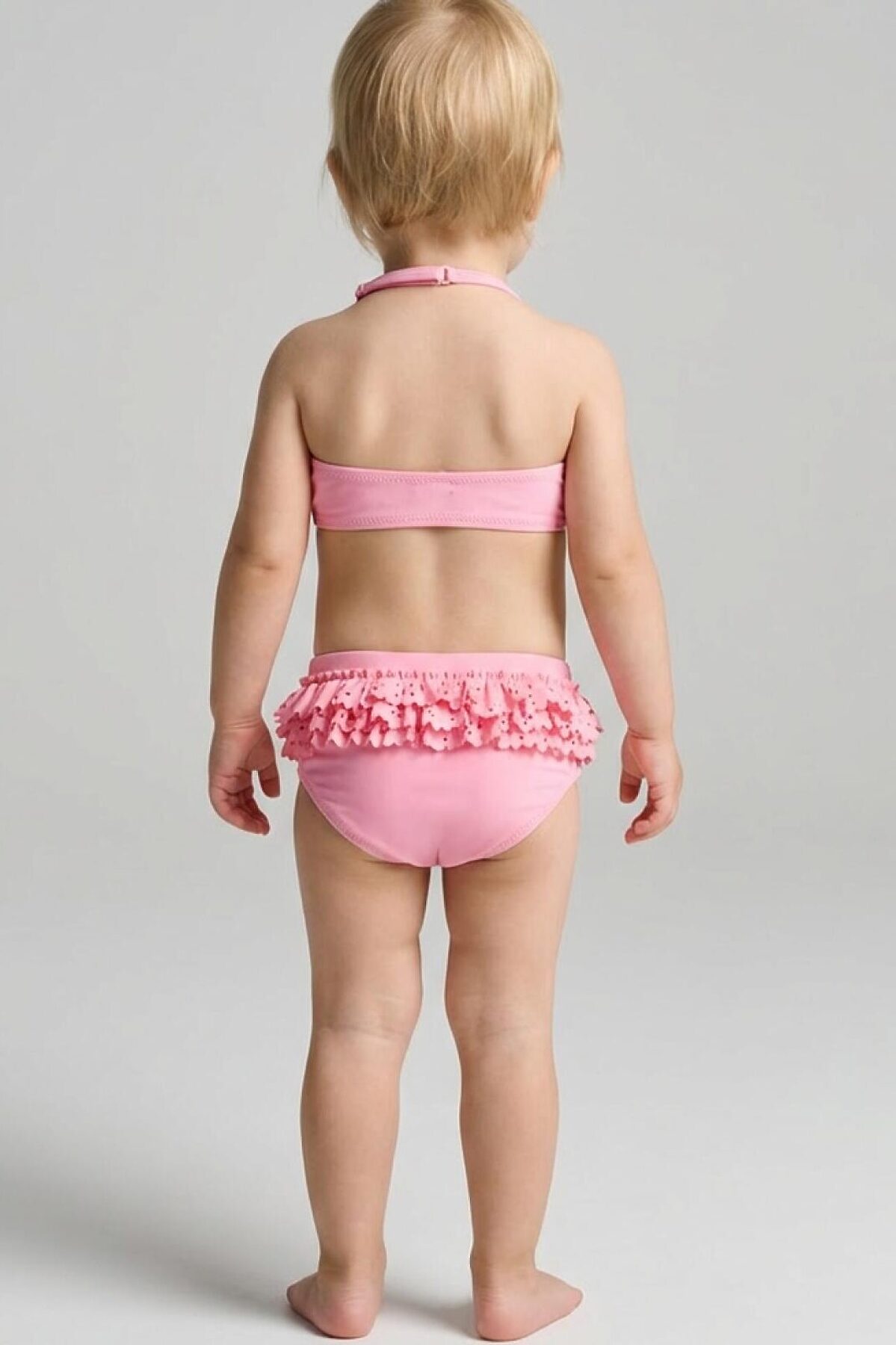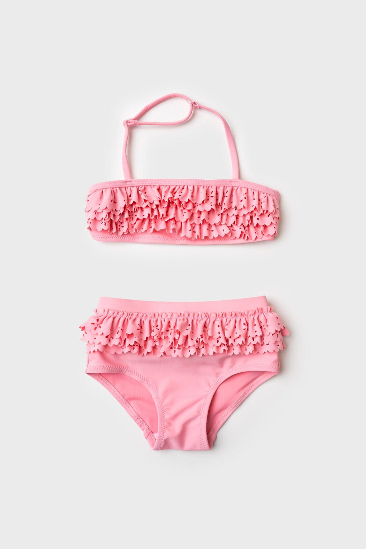 Детский купальник для девочки. Модель выполнена в нежно-розовом цвете и украшена объемными цветочными рюшами, которые создают яркий и праздничный образ. Топ на регулируемых бретелях. Плавки на подкладке средней посадки, также декорированы рюшами по талии. Все края обработаны эластичной тесьмой, чтобы изделие хорошо сидело на теле и не натирало. Благодаря UF-защите, ткань сохраняет первоначальный вид даже при длительном пребывании на солнце. Идеально подходит для пляжа и отдыха летом.