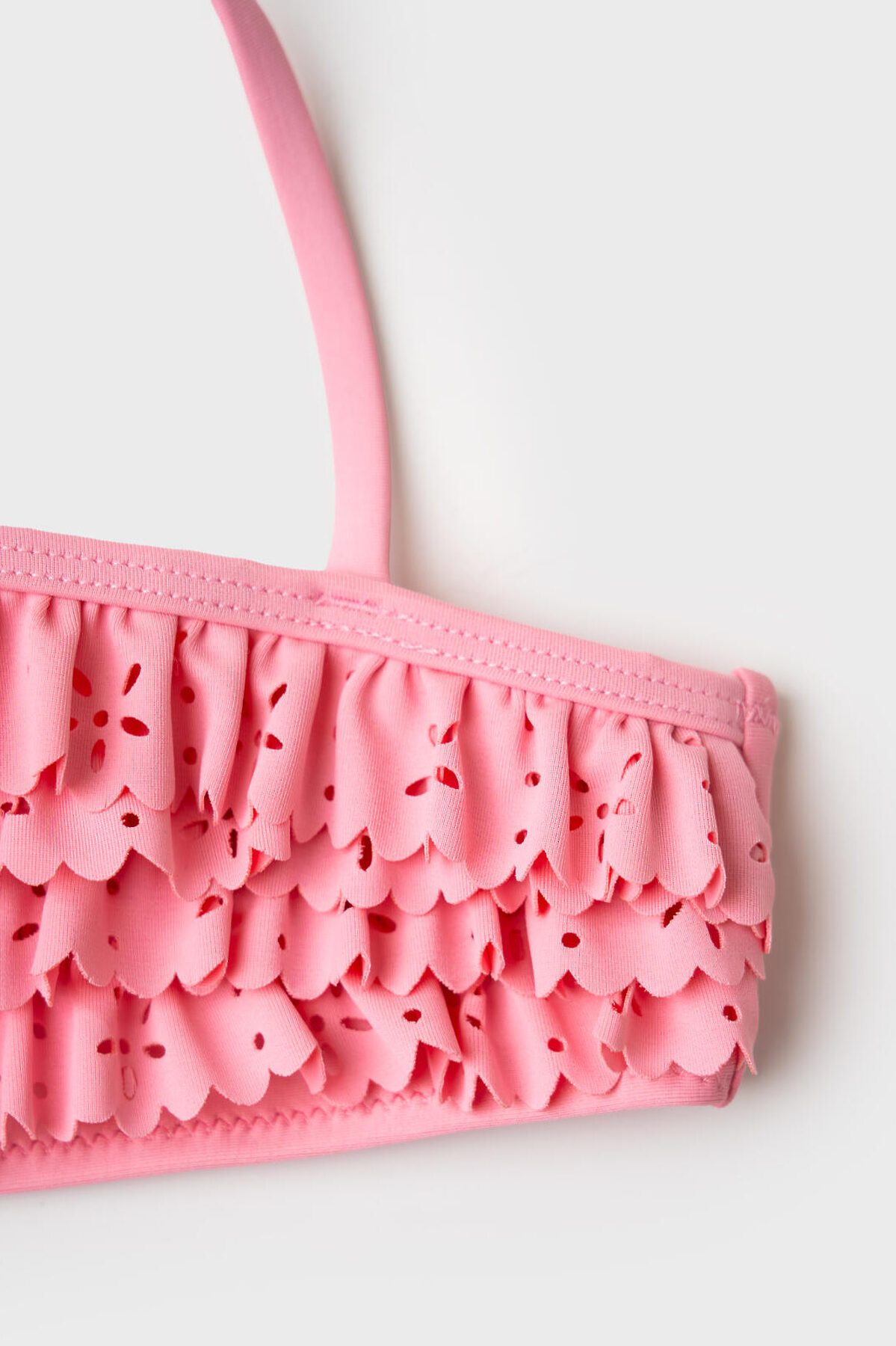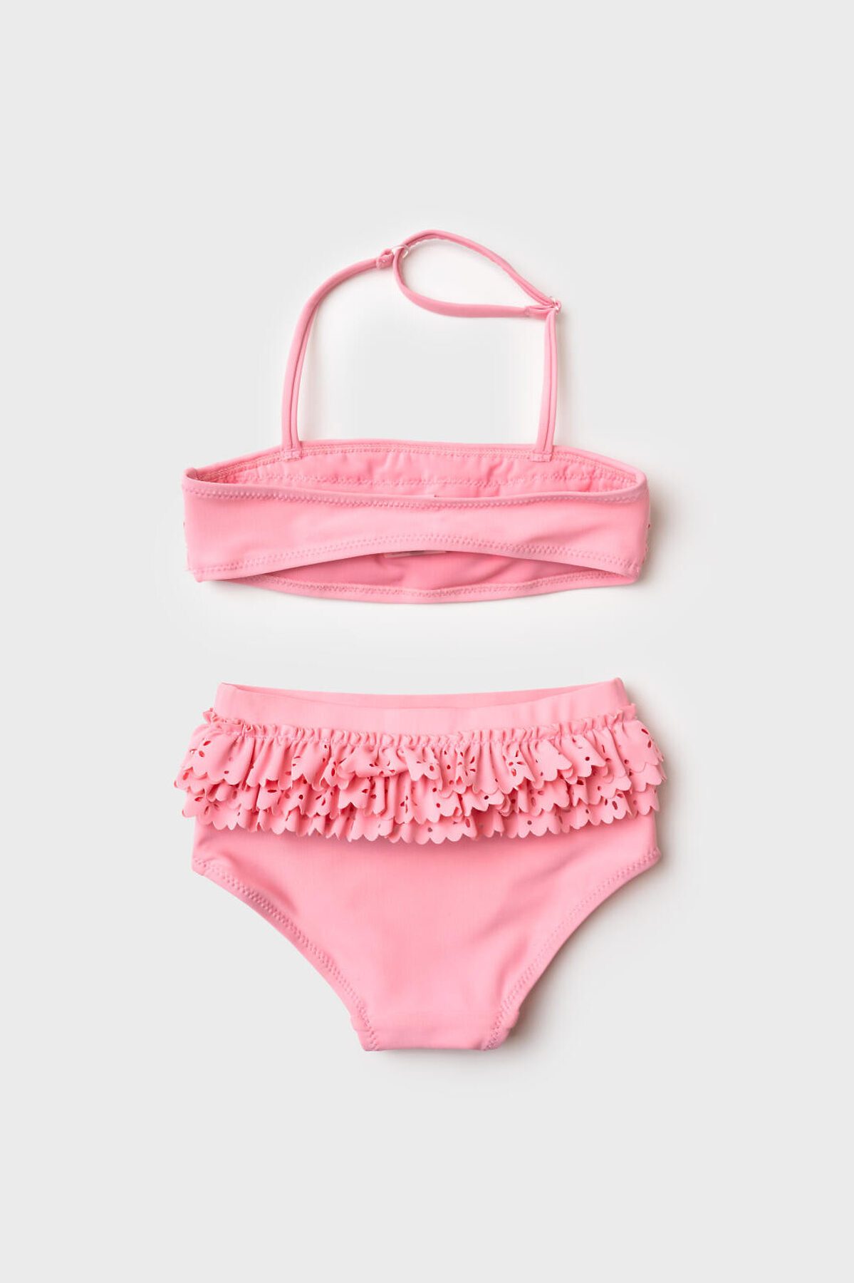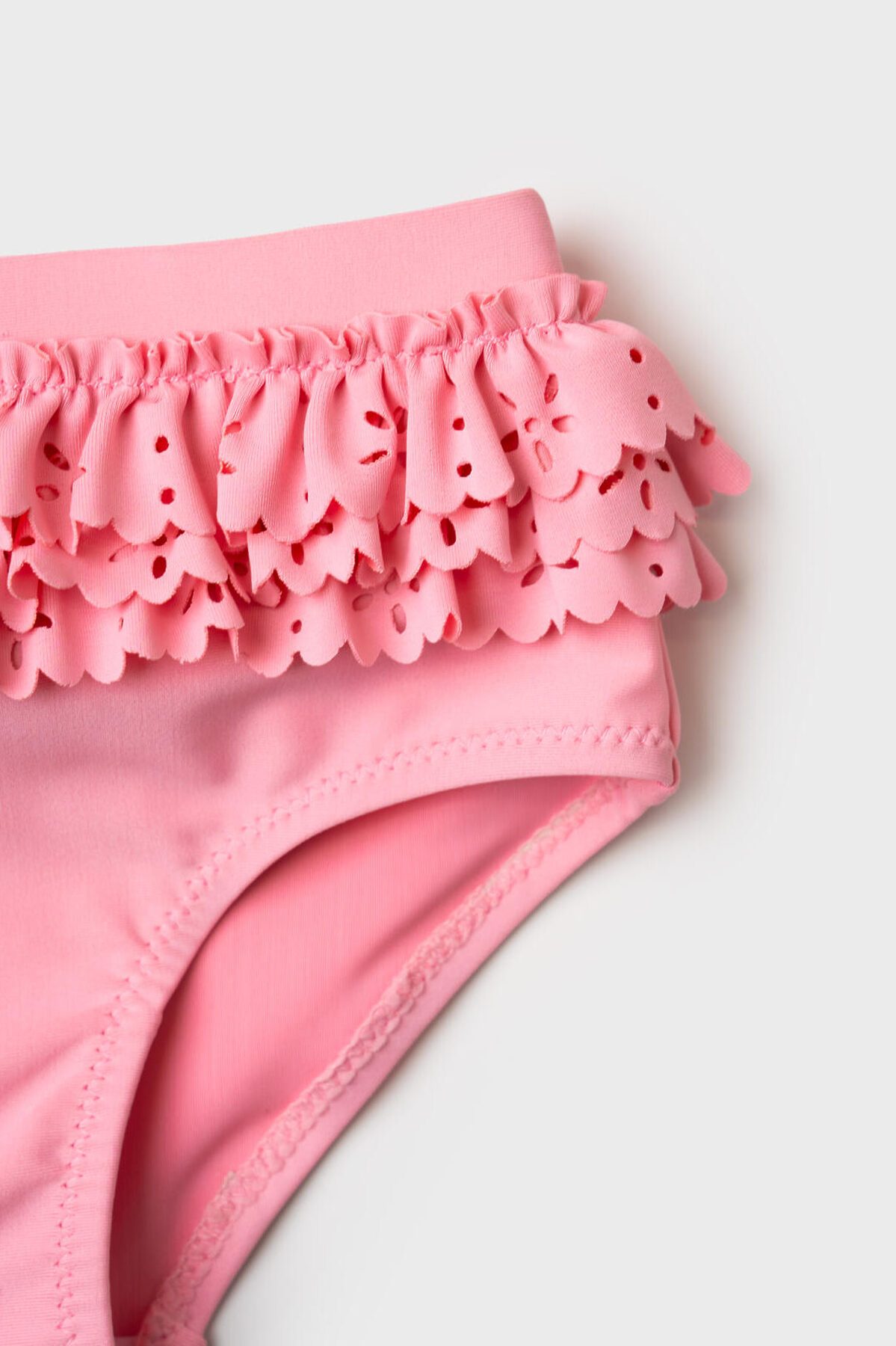 Детский купальник для девочки. Модель выполнена в нежно-розовом цвете и украшена объемными цветочными рюшами, которые создают яркий и праздничный образ. Топ на регулируемых бретелях. Плавки на подкладке средней посадки, также декорированы рюшами по талии. Все края обработаны эластичной тесьмой, чтобы изделие хорошо сидело на теле и не натирало. Благодаря UF-защите, ткань сохраняет первоначальный вид даже при длительном пребывании на солнце. Идеально подходит для пляжа и отдыха летом.