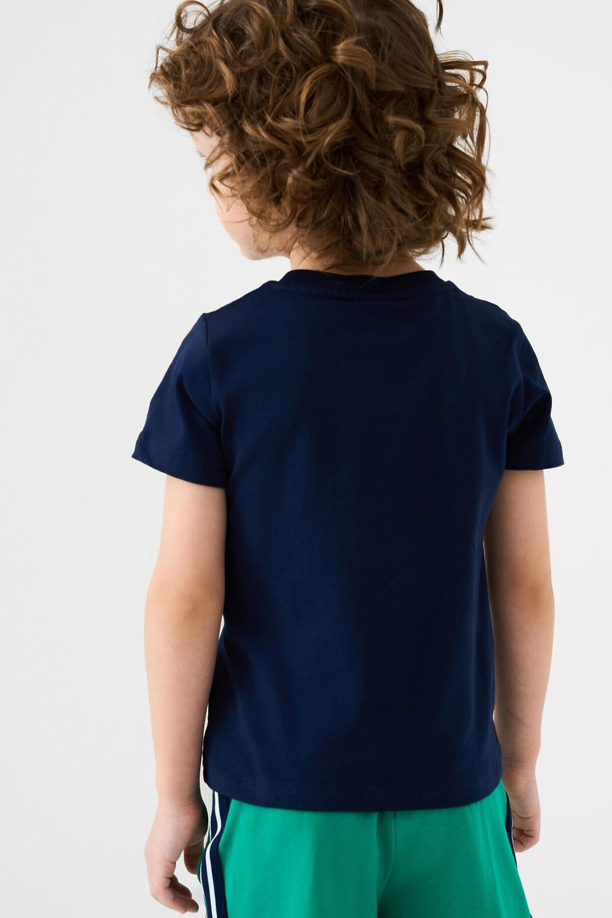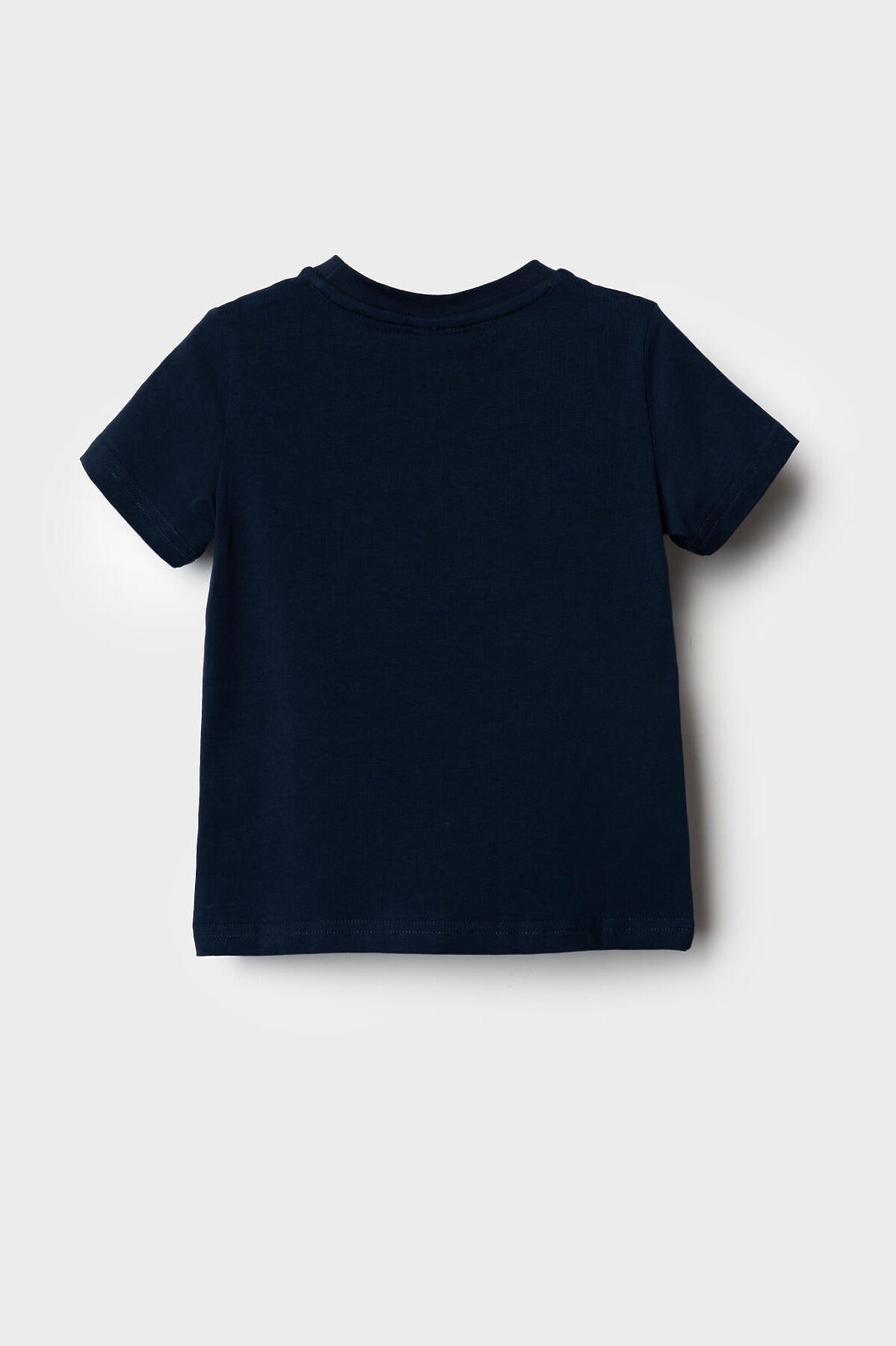 Детская футболка для мальчика. Модель прямого кроя, выполнена из эластичного хлопкового трикотажа джерси. Спереди расположен крупный принт. Горловина круглая, обработана эластичным рибом. В нижней части — небольшая нашивка.