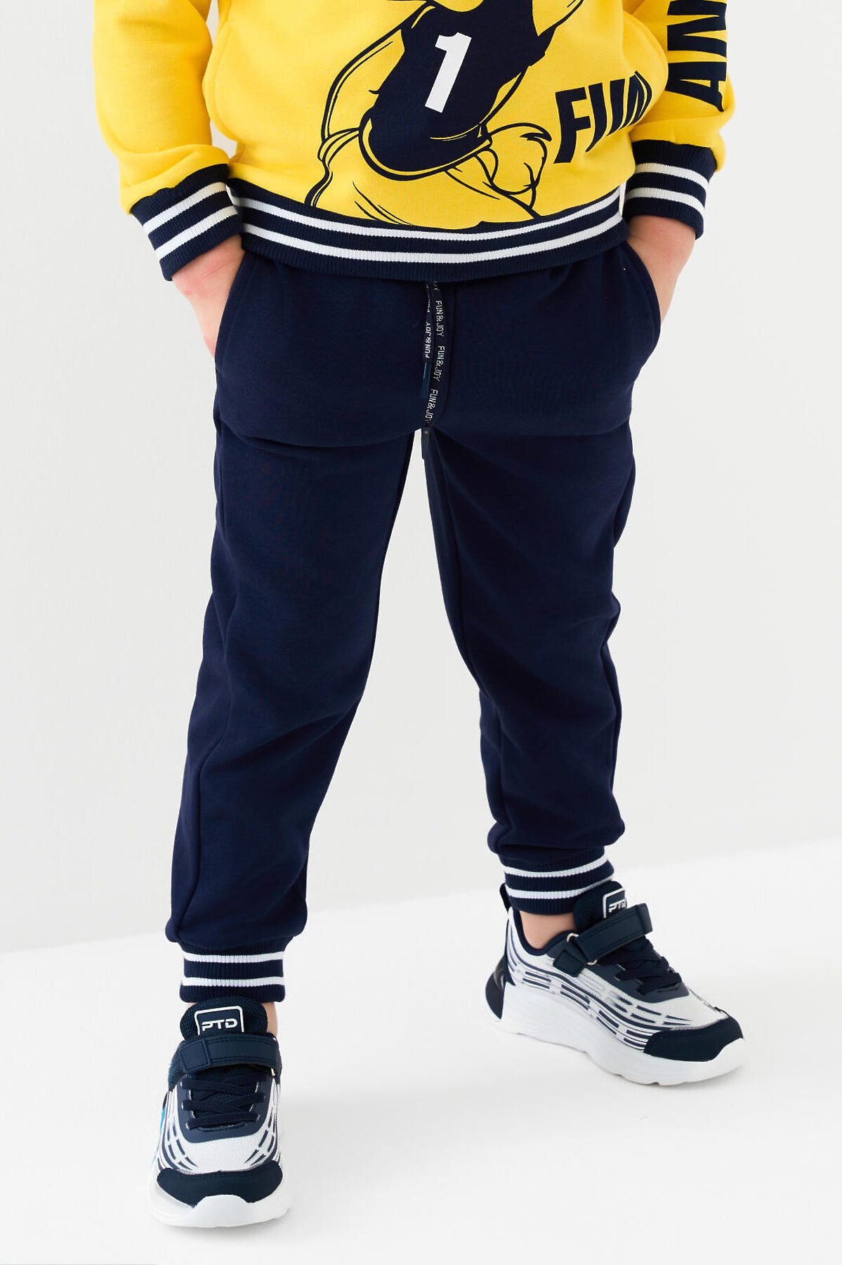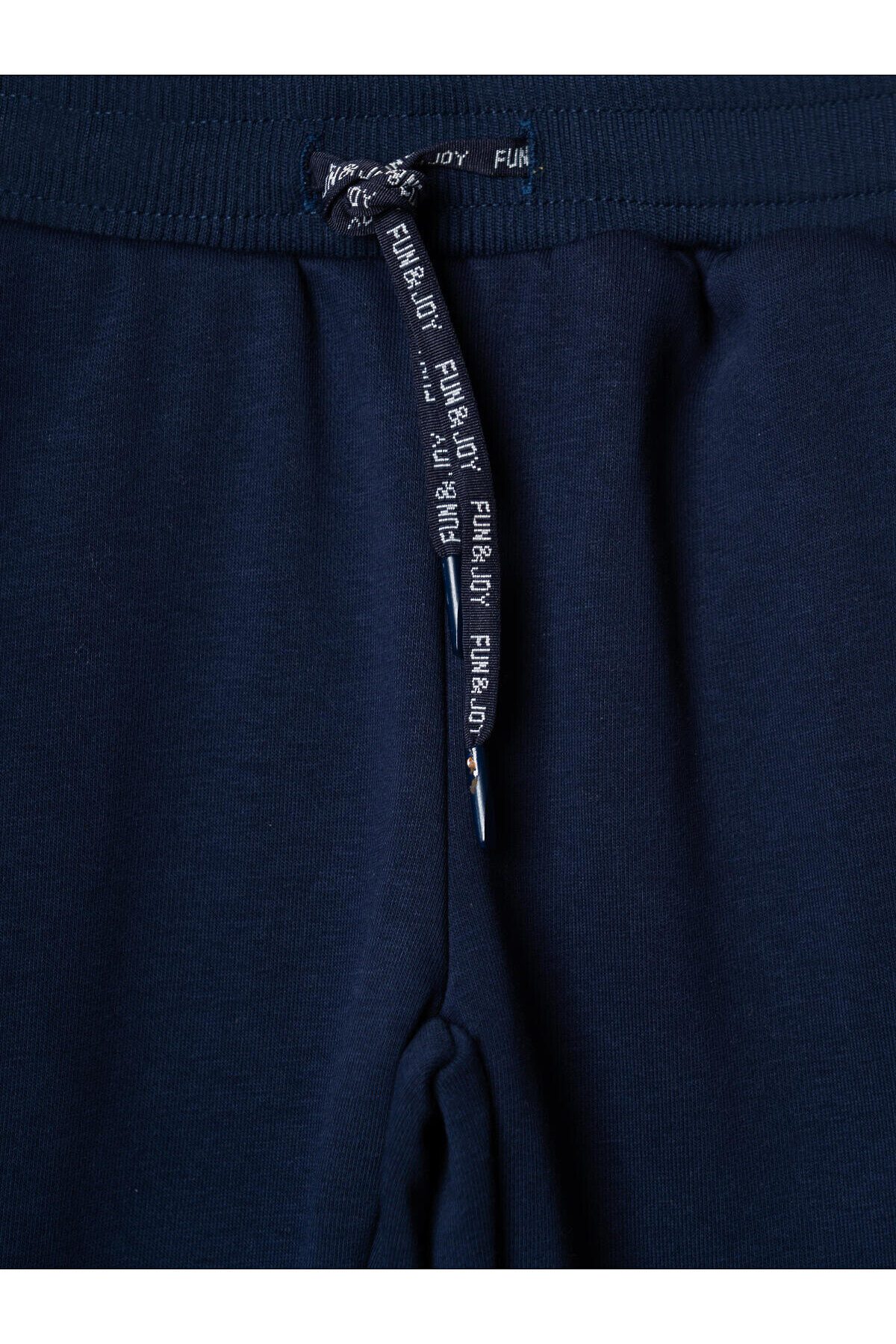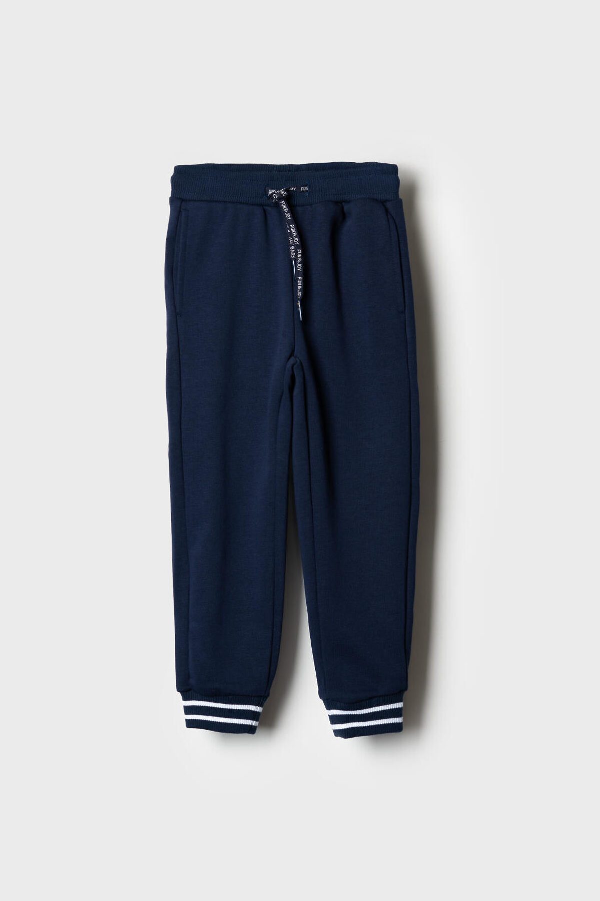 Трикотажные детские брюки джоггеры для мальчика. Модель выполнена из футера без начеса. Пояс на широкой резинке дополнен декоративным шнурком с надписью "FIND & JOY". По бокам расположены удобные карманы. Низ брюк оформлен эластичными манжетами с контрастными полосками. Брюки подойдут для повседневной носки и активного отдыха.